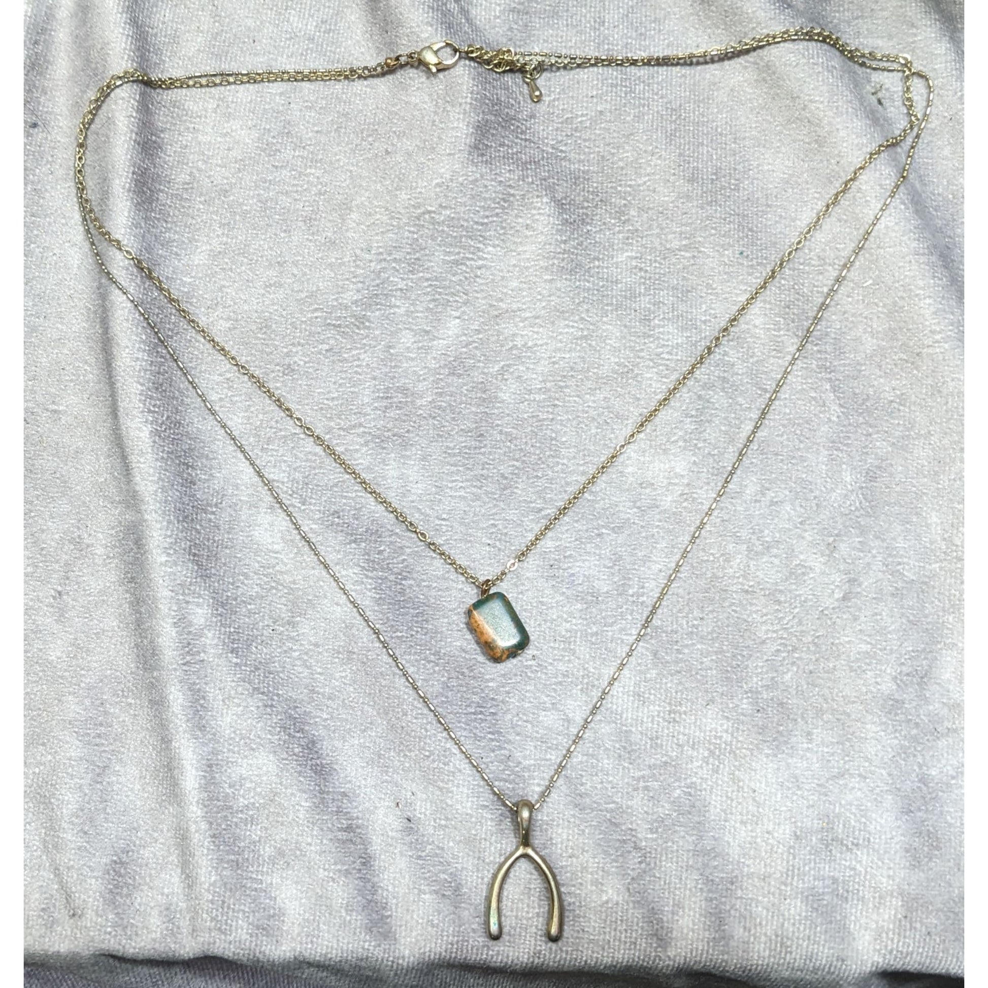 Elevate your style with this stunning dual pendant necklace featuring a lucky wishbone and picture jasper. Perfect for layering or as a statement piece, it adds elegance and a touch of luck to any outfit.