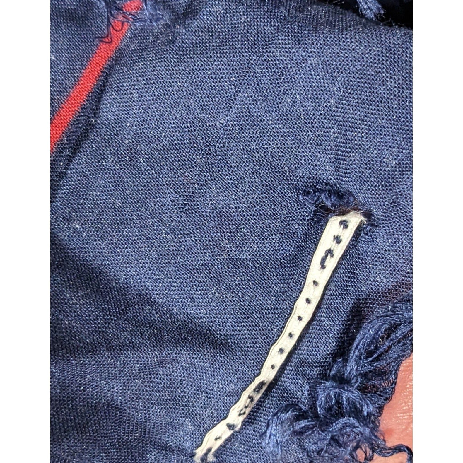 Gently used. Light wear on the ends of the fringe, leading to some whitening at the very ends of the blue. The tag has been cut off, and there's a small hole next to where the remnants of the tag are. See photos.