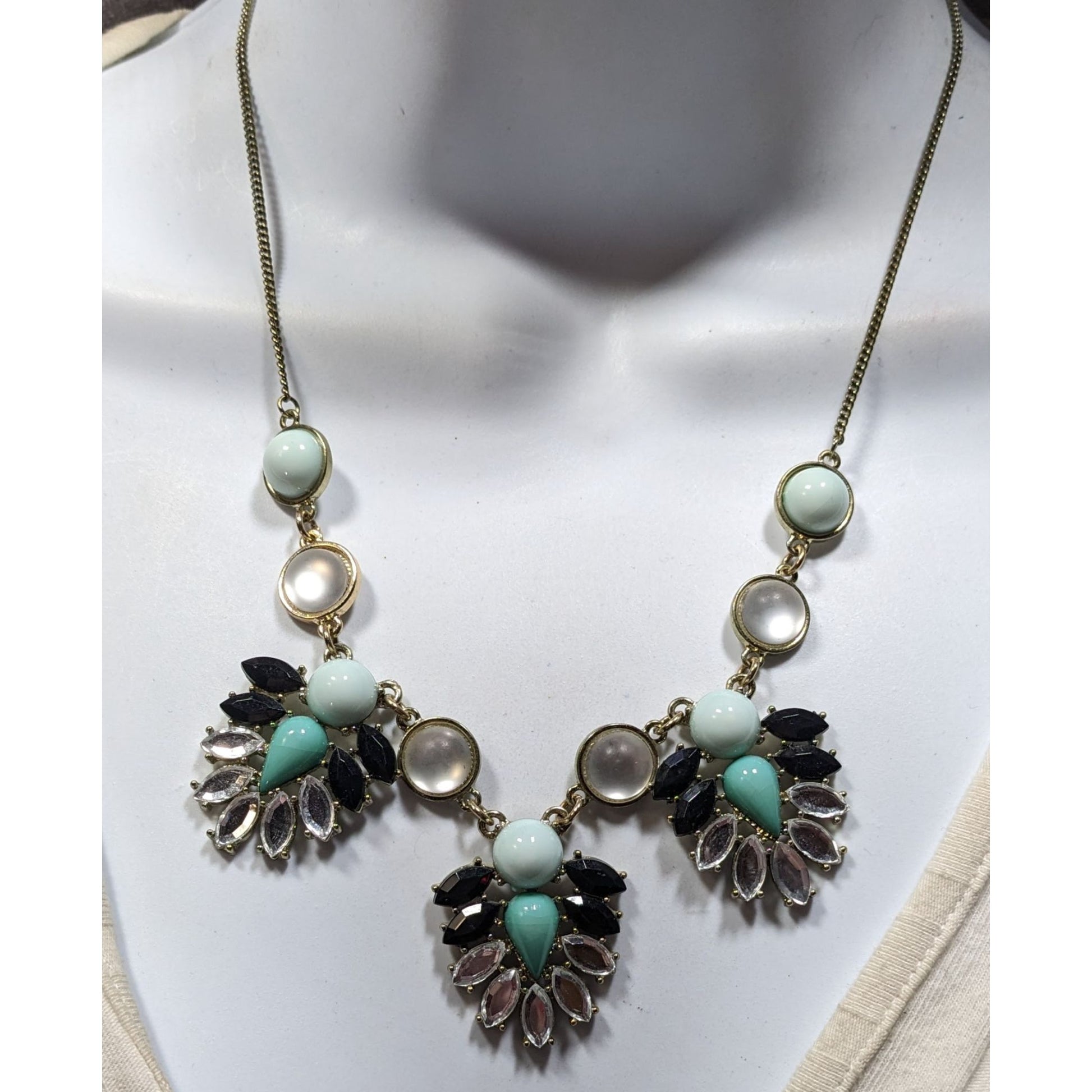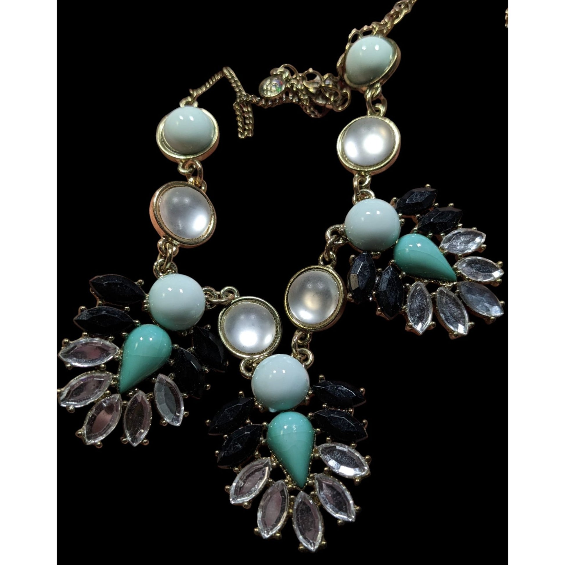 Adorn yourself with a necklace that tells a story of vintage elegance. The turquoise teardrops, black accents, and clear gems exude timeless charm.