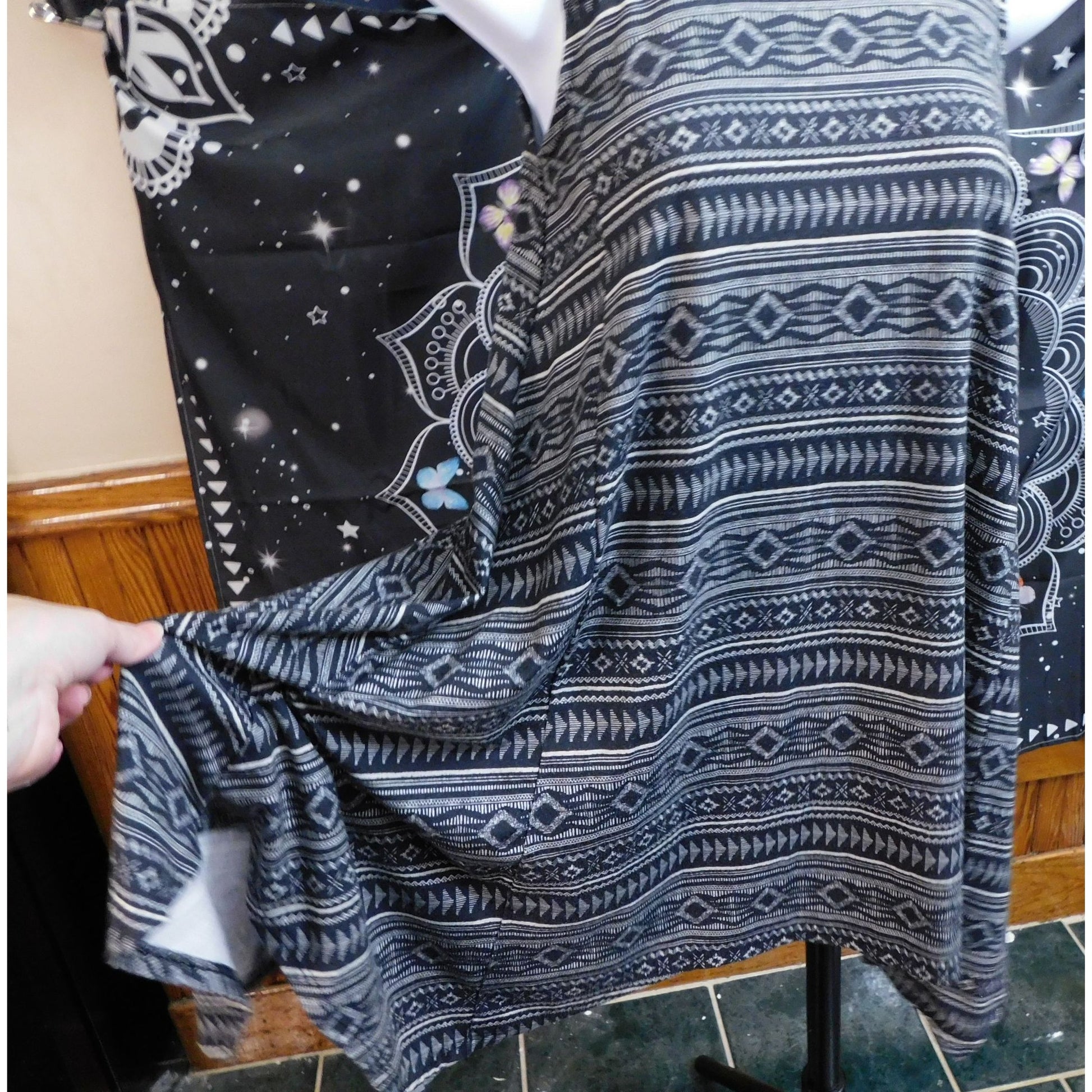 It's made of a soft stretchy fabric with a detailed stripe print. The different stripes all have different shapes and accents. (See photos for variation.) It's white and blue/black (it's really hard to tell if it's a super dark navy or actual black. The neckline has lace inlay on the front and back.