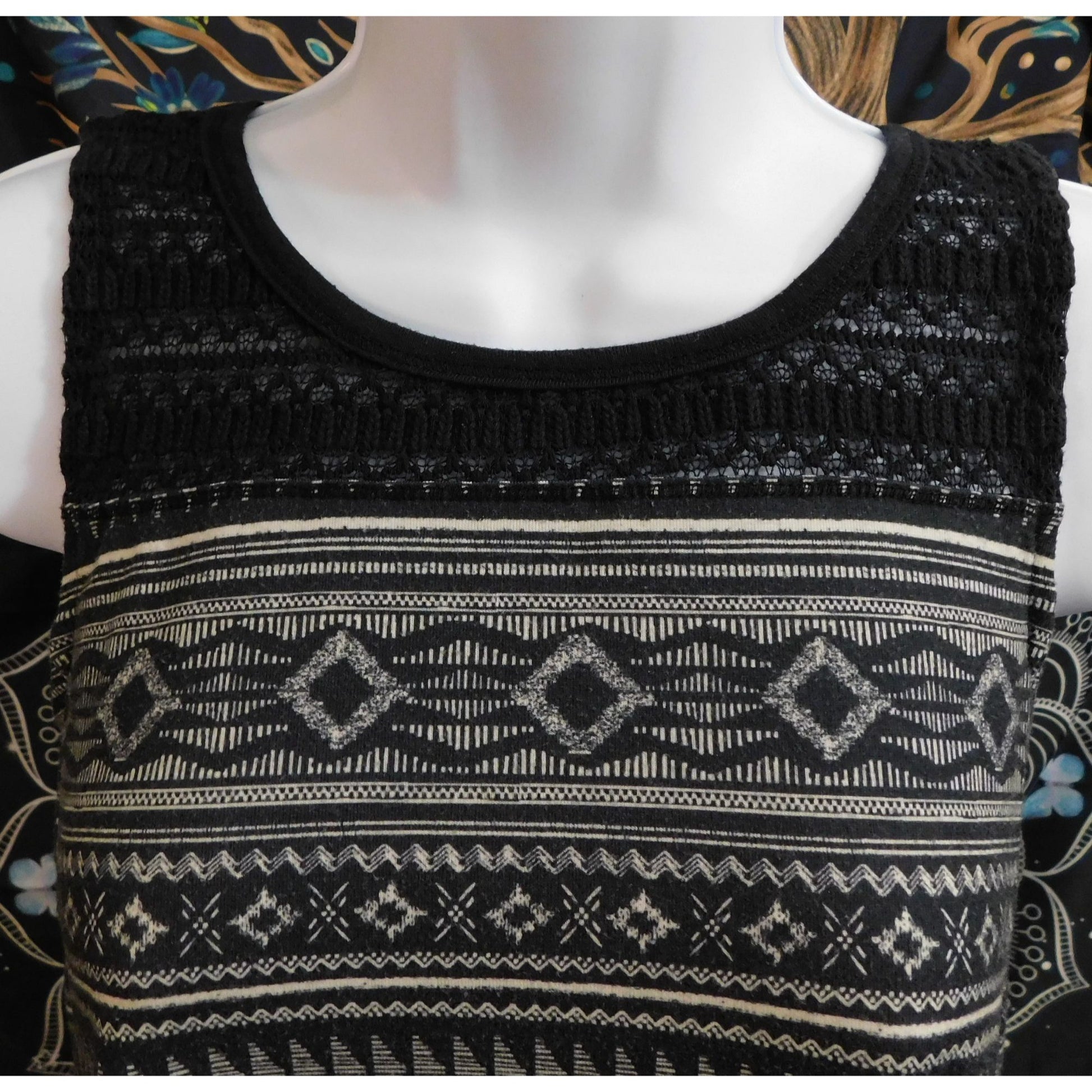 This Mudd sleeveless dress features a stylish handkerchief hem and a striking Southwestern print in white and navy, perfect for casual outings or summer events.