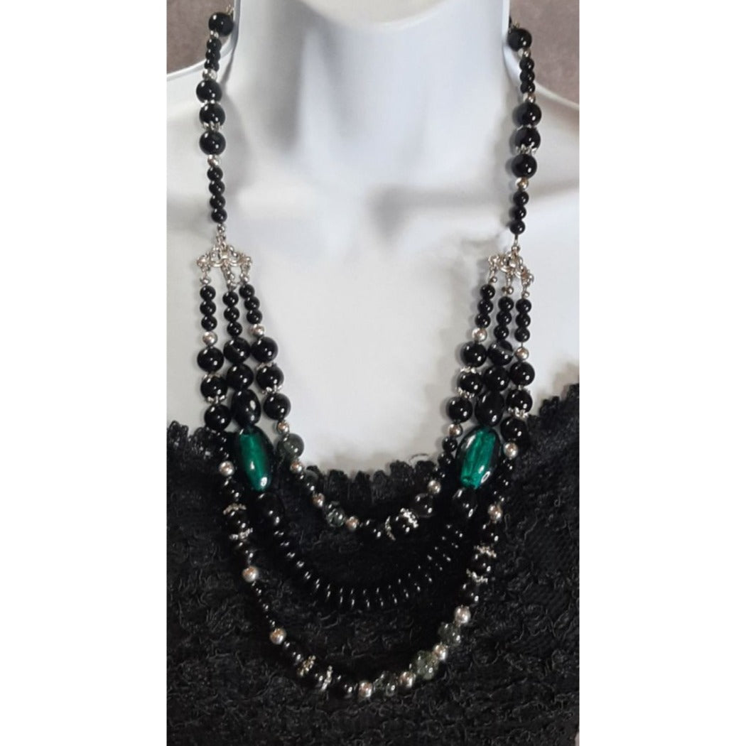 Each bead tells a story in this intricate multi-strand necklace. The black beads exude elegance, while the green accents and silver tone details add a touch of mystique. Whether dressed up or down, this piece promises to captivate attention and spark conversations.