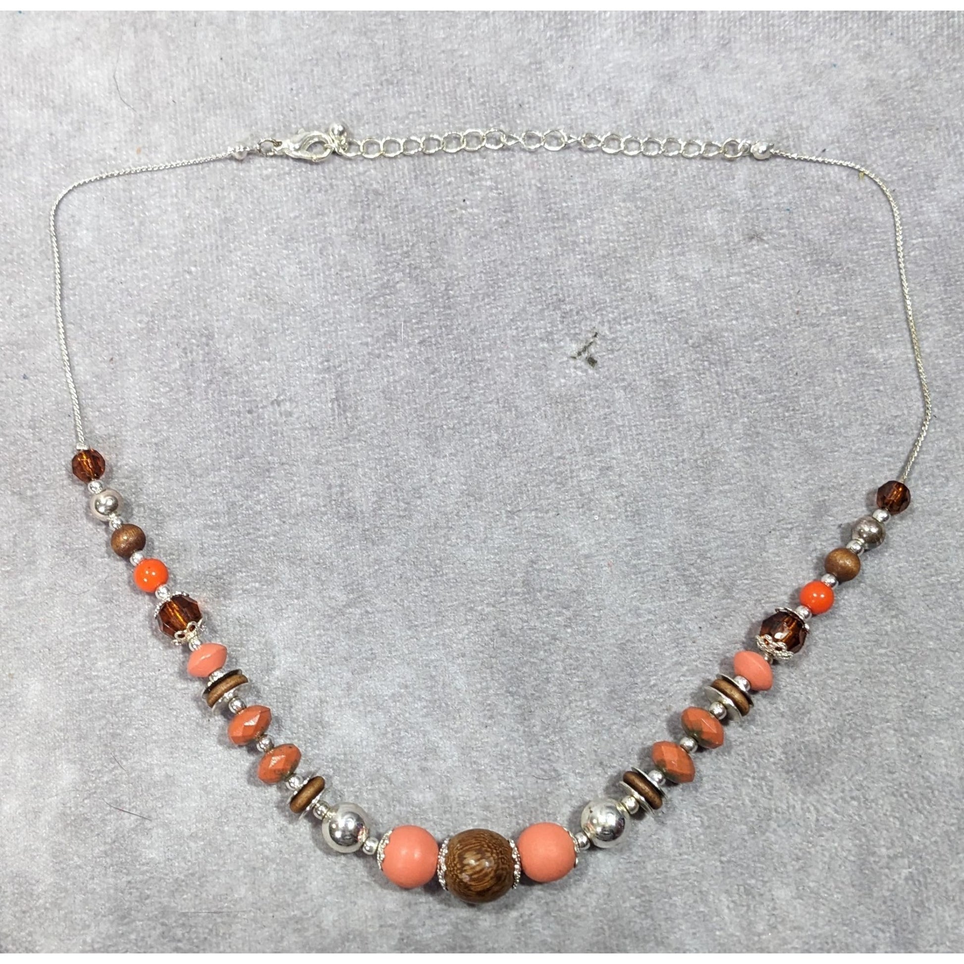 Handcrafted necklace featuring orange, brown, and silver-tone beads made from wood and clay. Perfect for adding a unique touch to any outfit. Lightweight and comfortable for daily wear.
