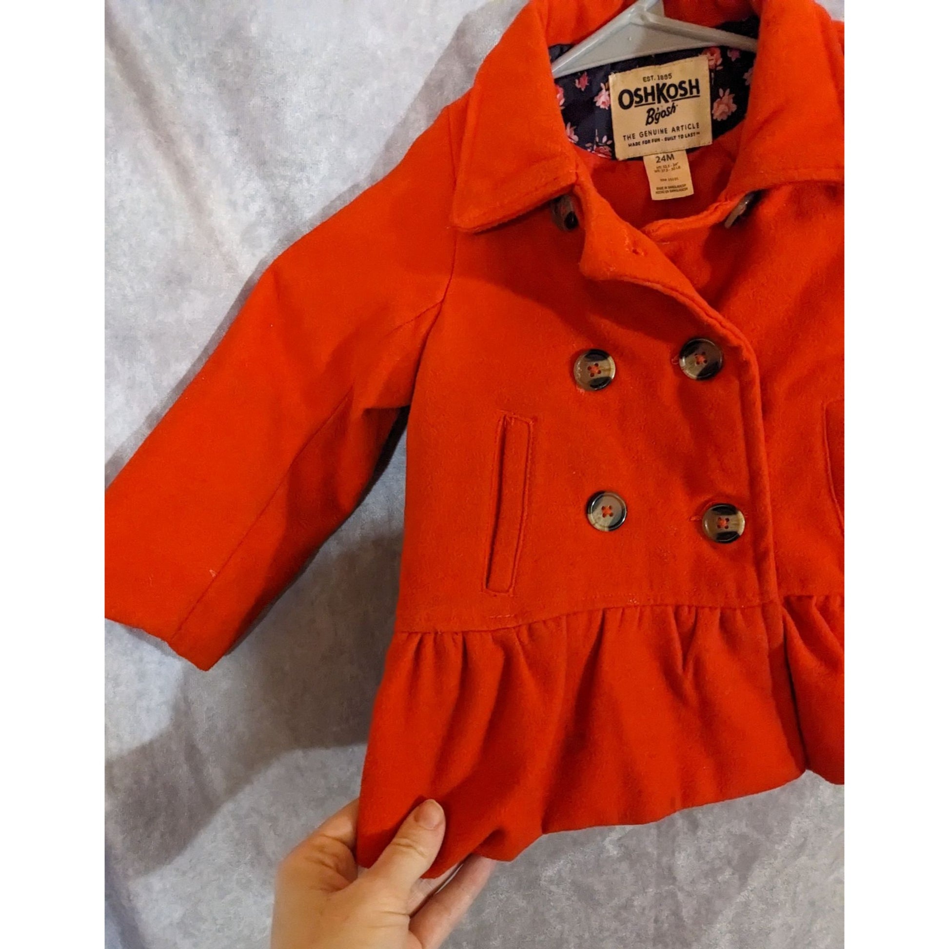 This charming red peacoat from OshKosh B'Gosh is a timeless piece for your little one. The double-breasted design, ruffle hem, and floral lining create a delightful mix of classic and playful. The embroidered patch adds a touch of whimsy, ensuring your child stays stylish and cozy for outings.