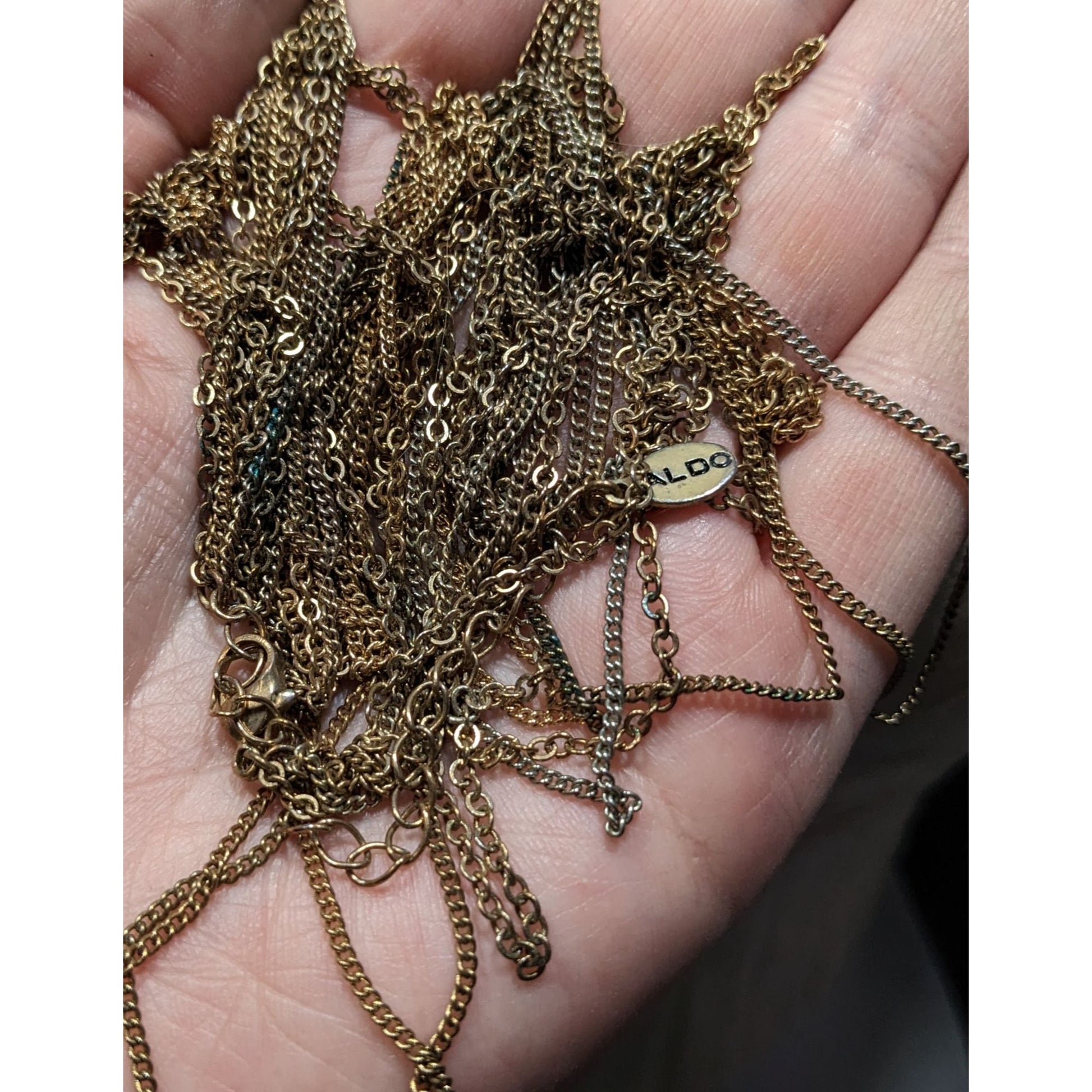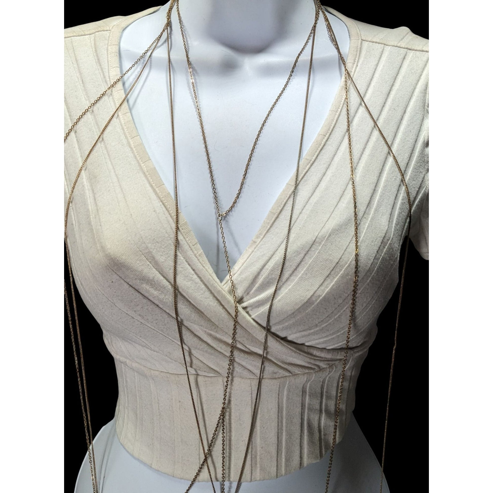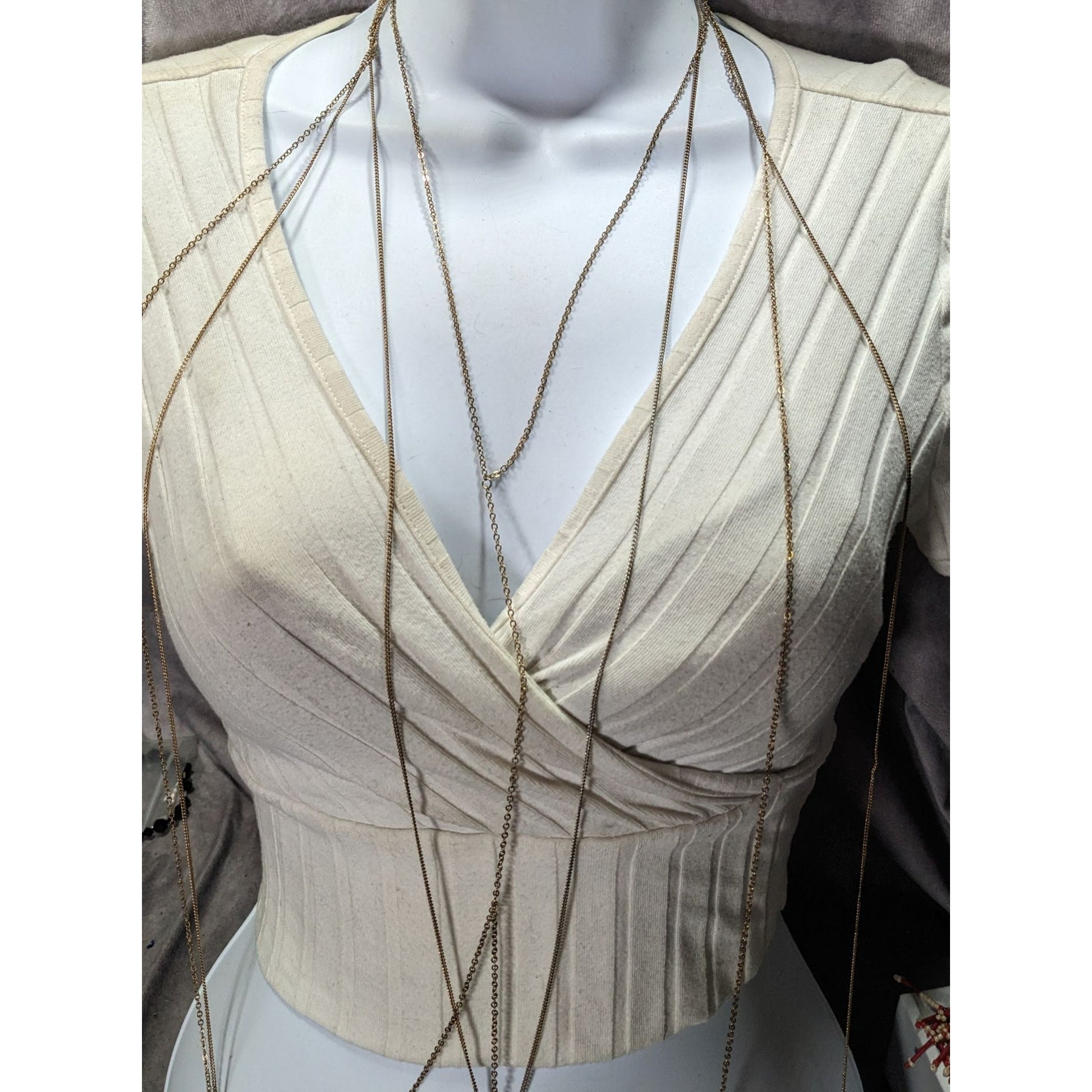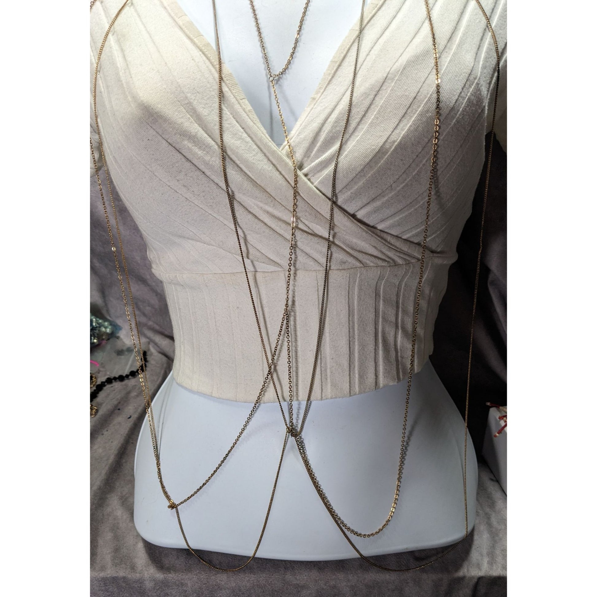 This ALDO layered body chain weaves a story of elegance and allure, draping gracefully over the torso to accentuate curves with golden brilliance.