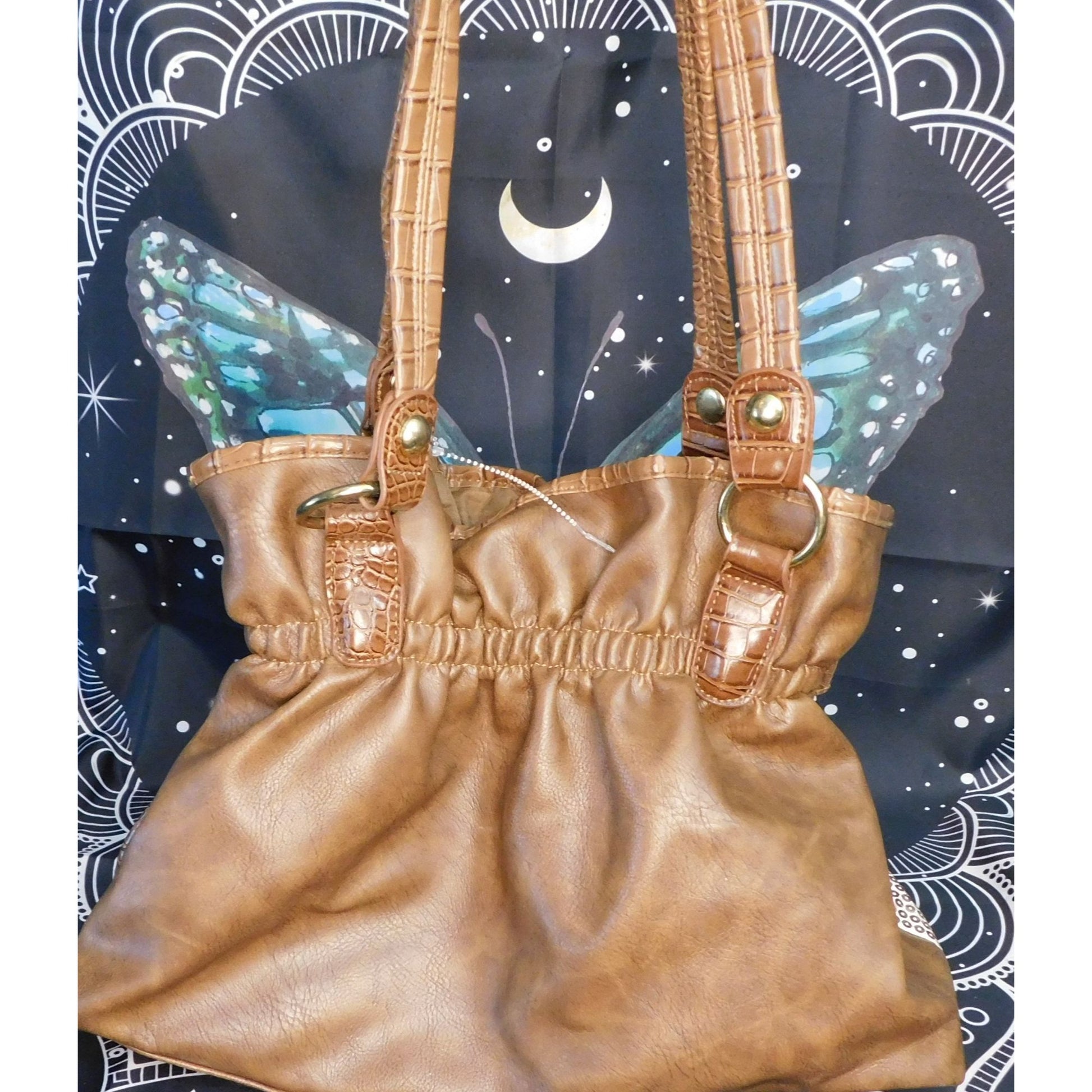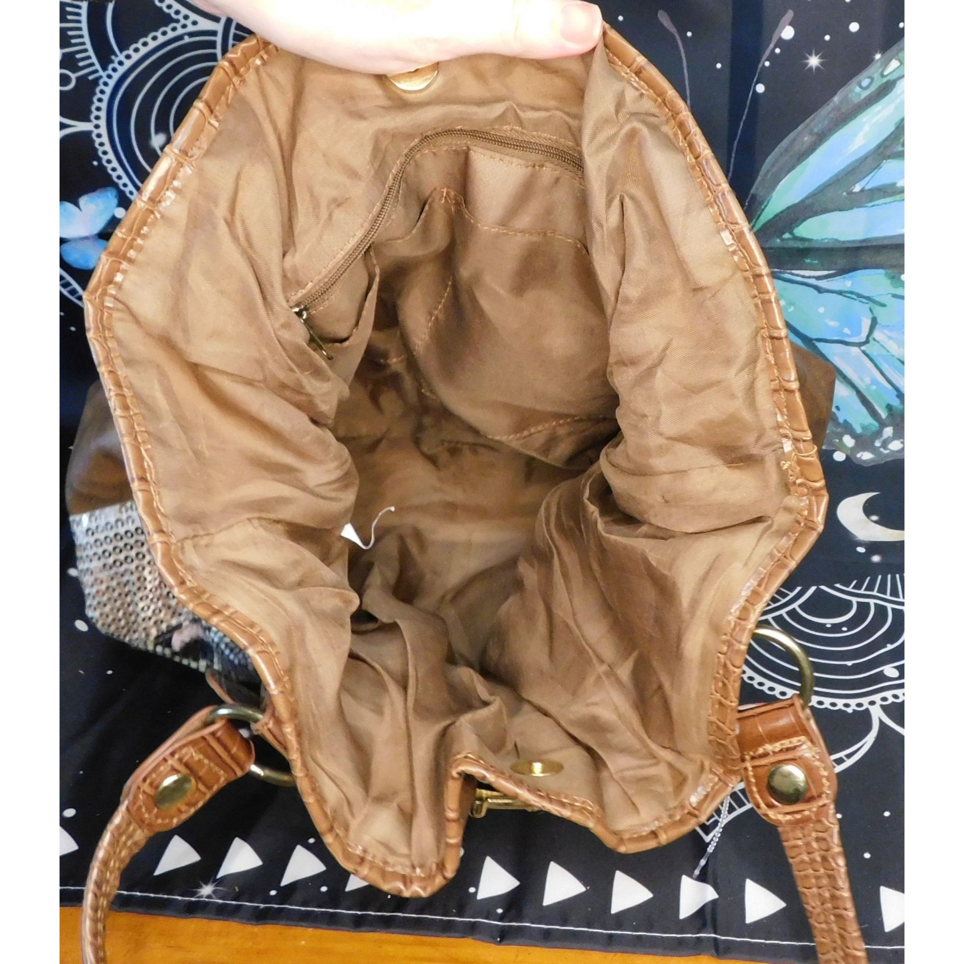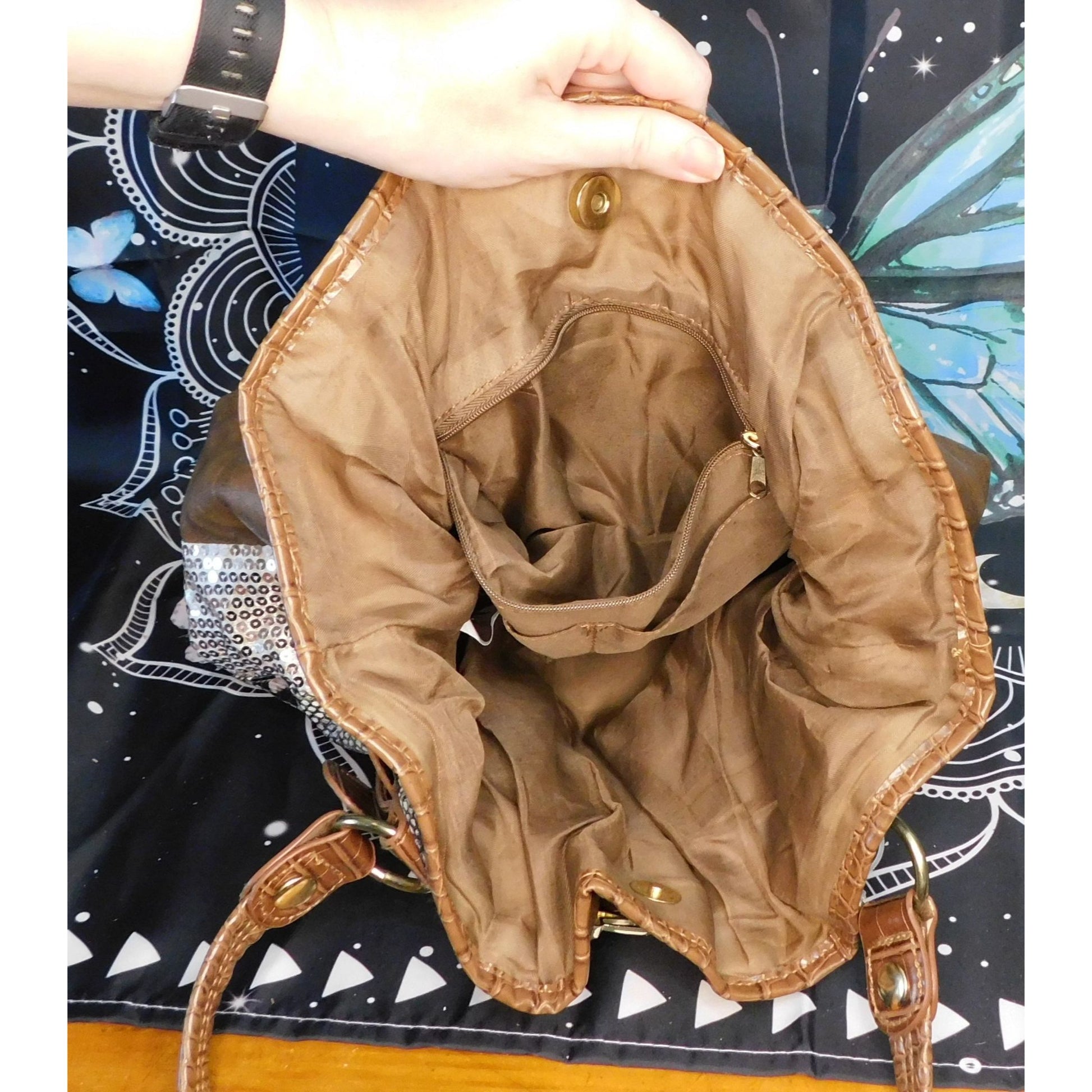Fun and sparkly patchwork glam shoulder bag. The front of the bag has patchwork stripes of brown faux leather, tan sequins, snake print, brown alligator textured faux leather, and soft metallic faux reptile fabric. The back and bottom are plain brown faux leather. It has an elastic cinch 2.5 inches from the top, with a faux belt accent across the front in alligator textured faux leather with a gold tone buckle. The handles are also alligator texture. It has a magnetic snap closure at the top. The inside is made of a slightly sheer brown fabric. It has two open pockets, and one zip pocket.