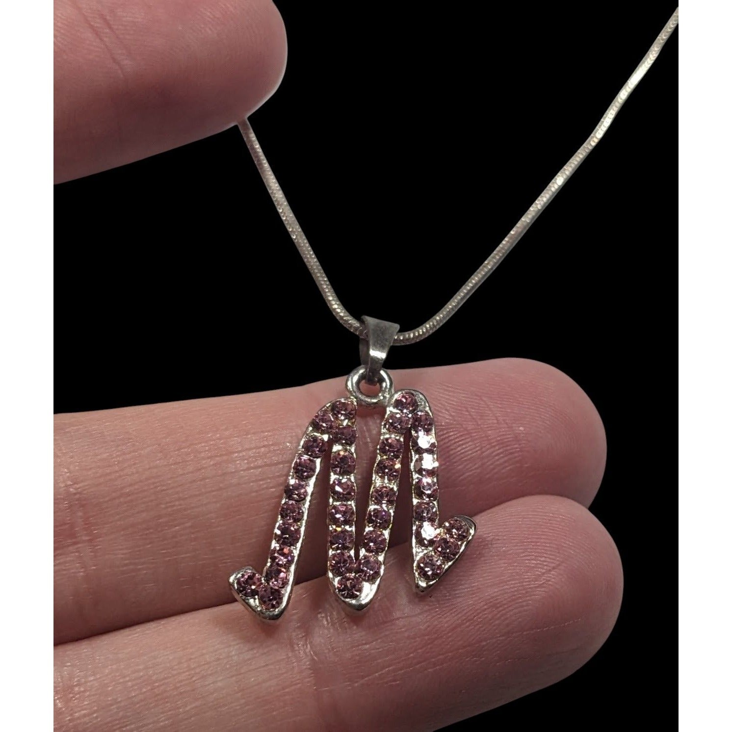Elegant and eye-catching, this pink rhinestone pendant features an "M" monogram in a silver tone setting. Perfect for adding a personal touch to your jewelry collection.