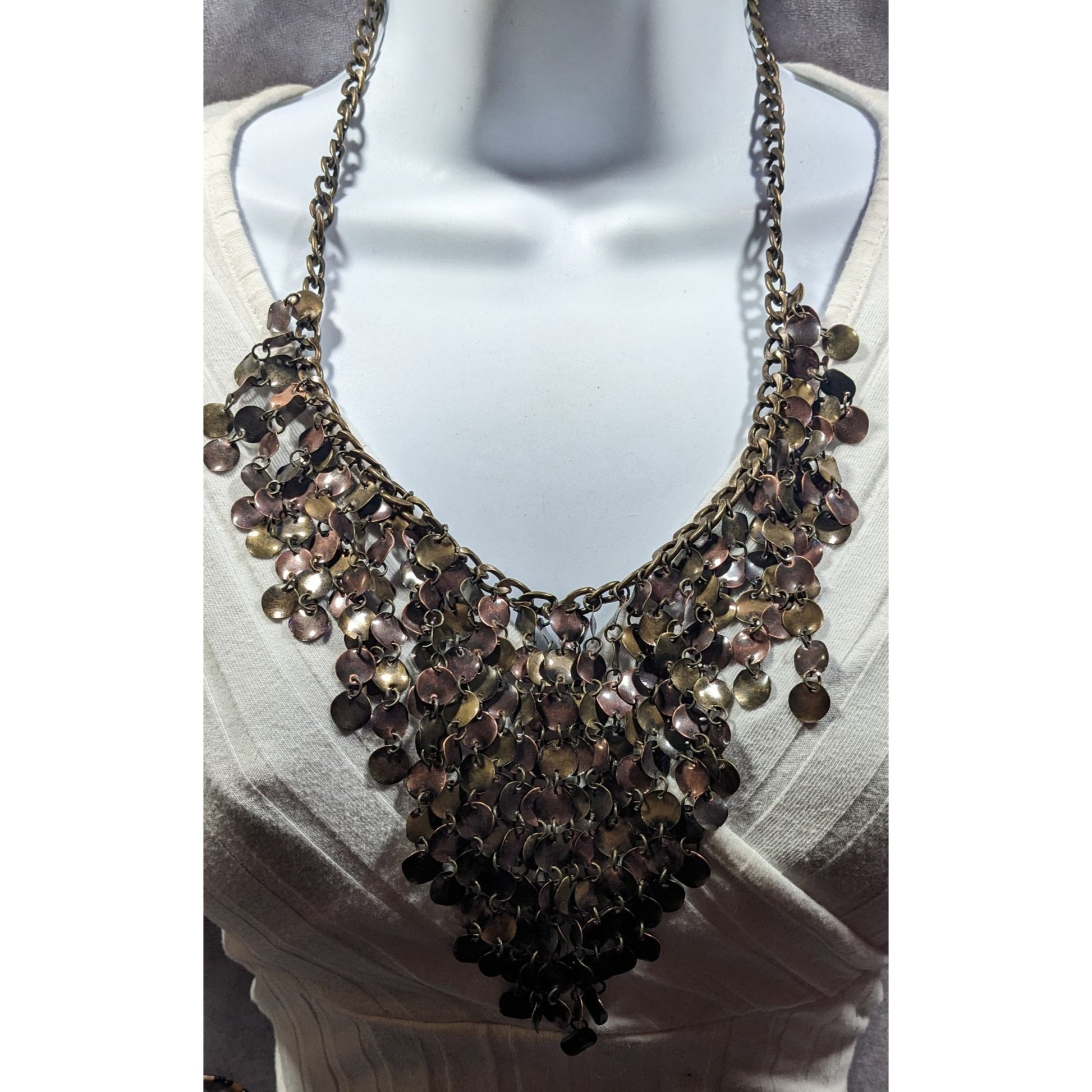 Enhance your outfit with this stunning bronze tone disc fringe bib necklace. Perfect for casual or formal occasions, this unique piece adds a touch of elegance and style to any ensemble. Ideal for fashion-forward individuals looking to make a statement.