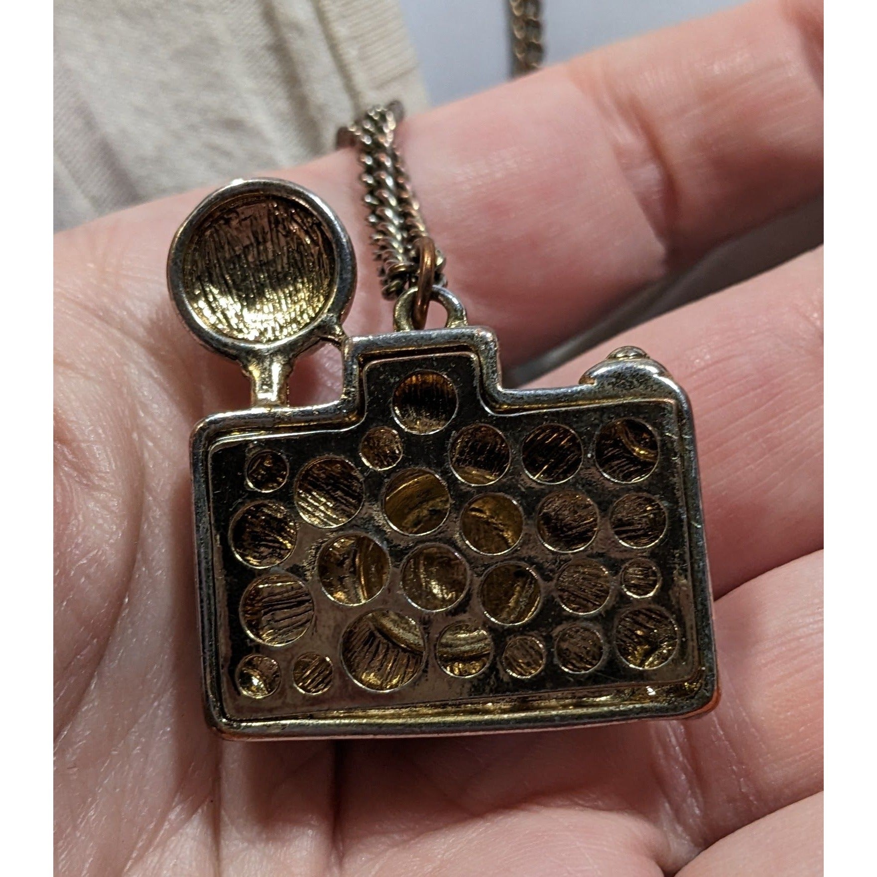 Capture the charm of nostalgia with this playful camera pendant necklace. Featuring a sparkling crystal lens and black enamel detailing, it's a statement piece for storytellers and dreamers alike. A gold-tone chain completes the look, making it a delightful accessory for enthusiasts of timeless treasures.