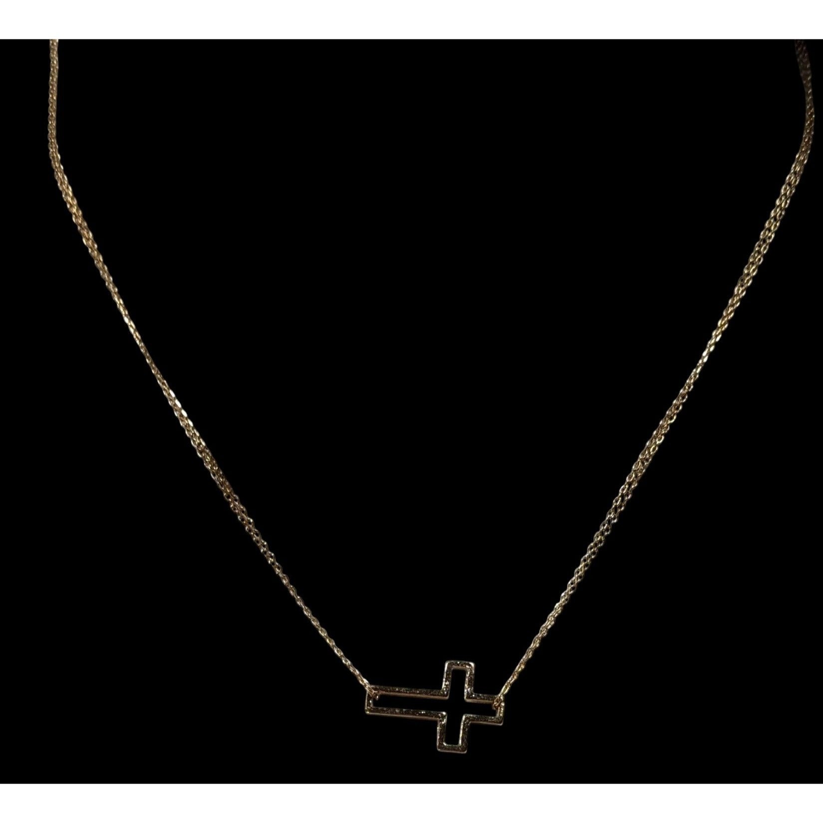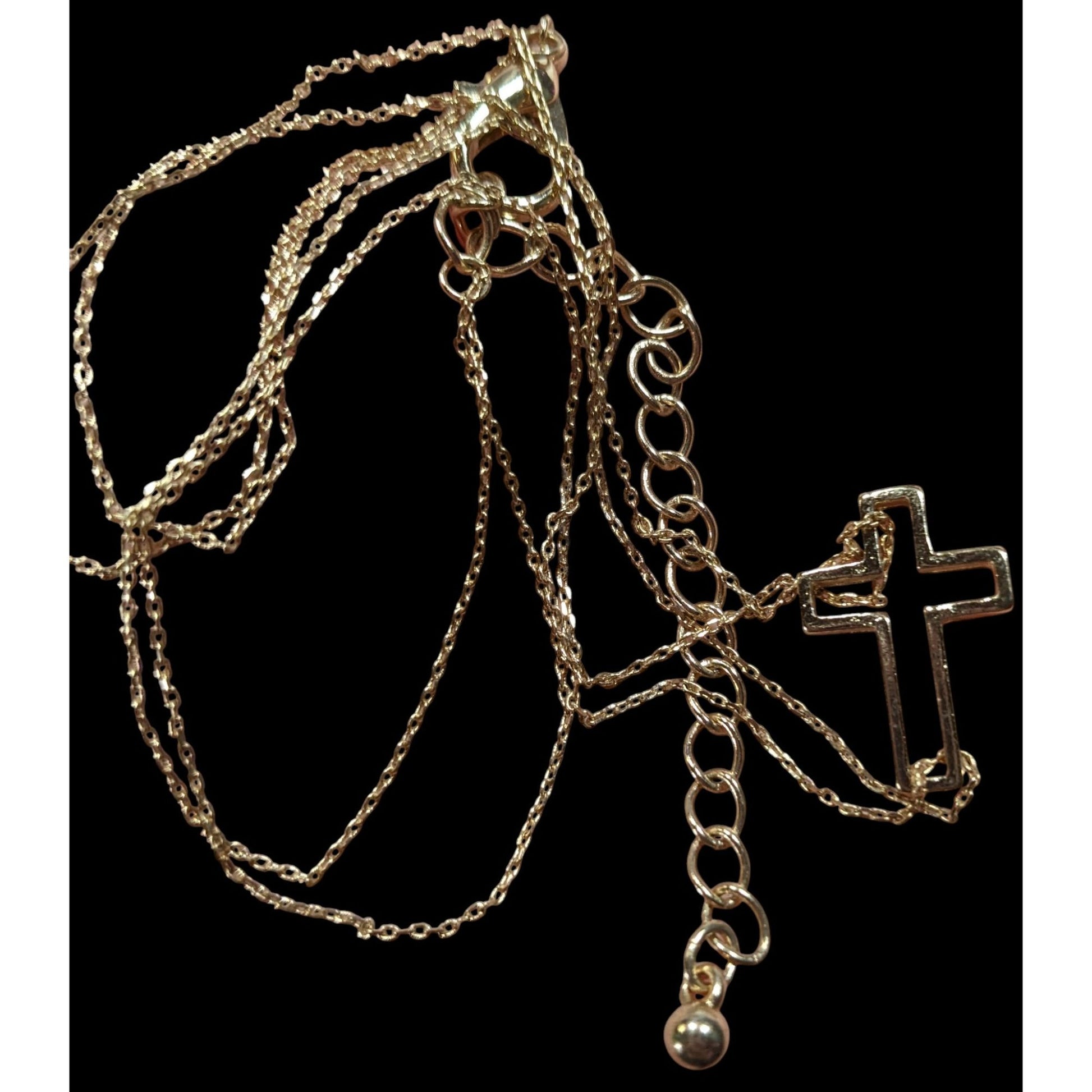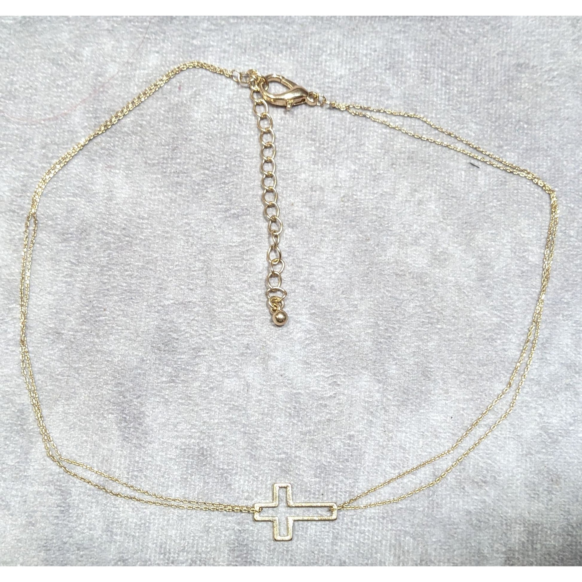 This elegant gold tone necklace features a sideways open cross pendant, perfect for adding a subtle religious touch to any outfit. Ideal for everyday wear or special occasions.
