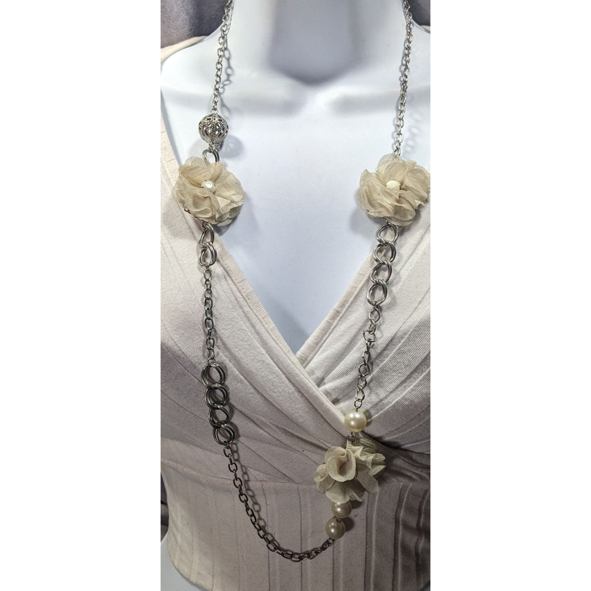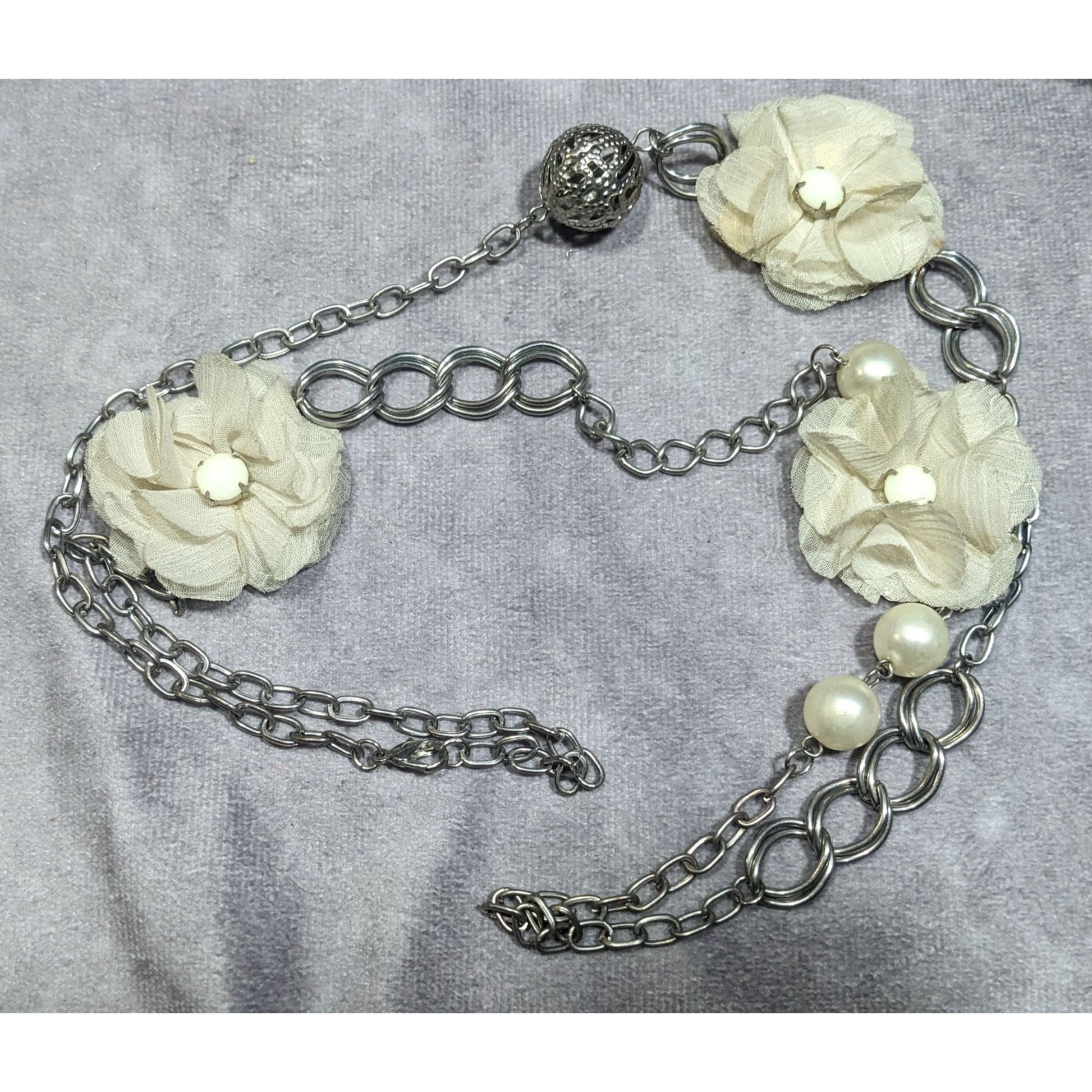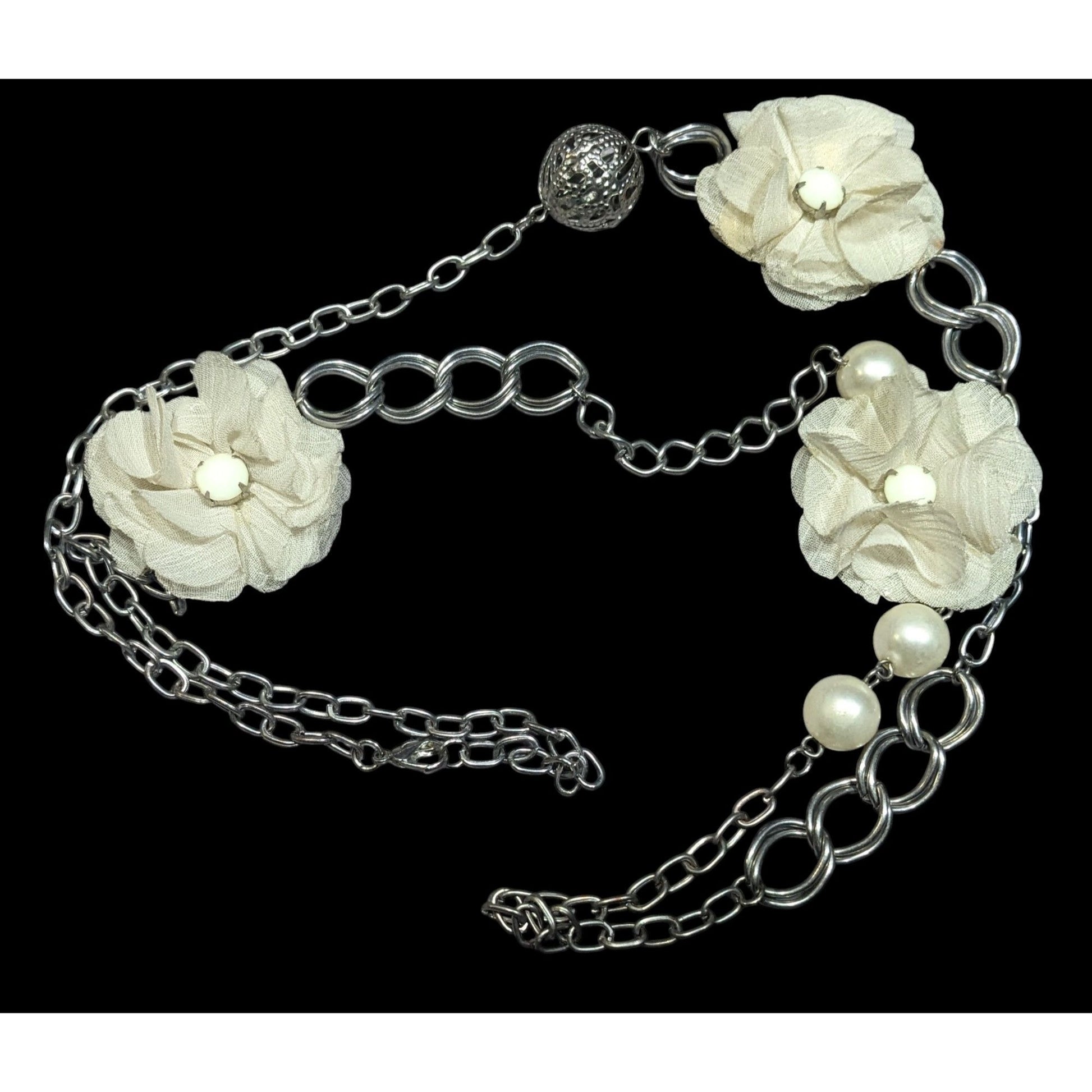 Retro Fairycore White Flower And Faux Pearl Necklace With Silver Tone Chain