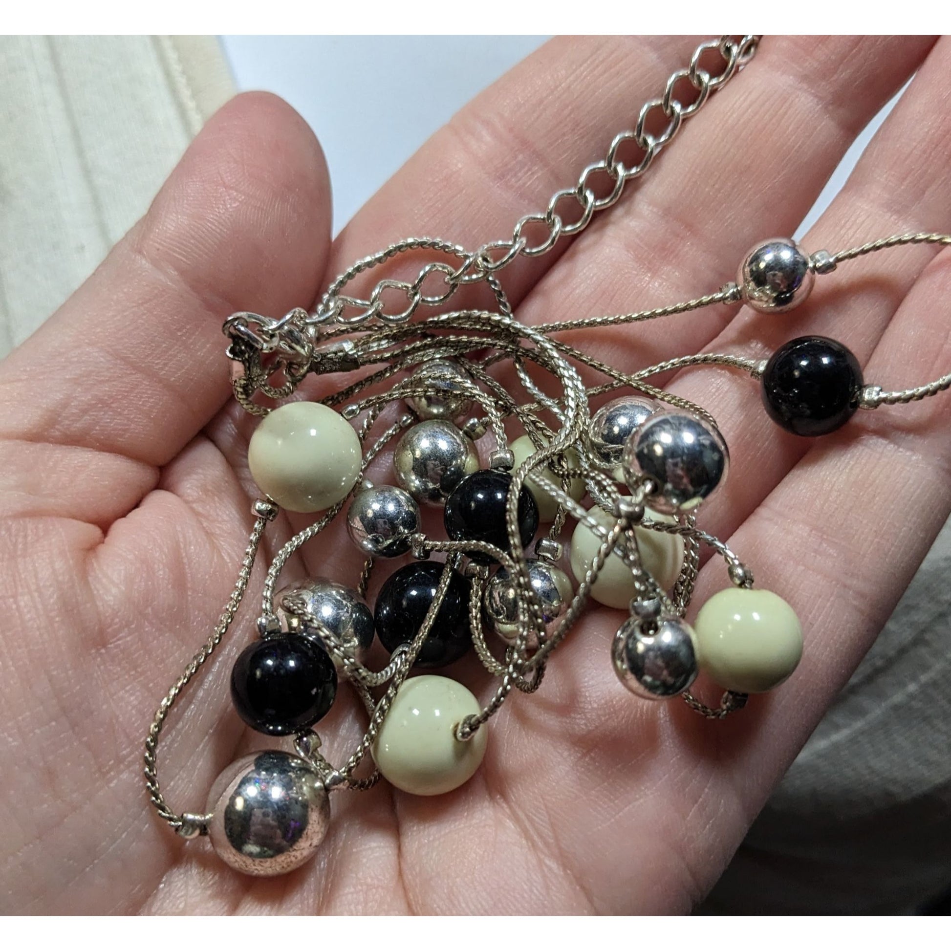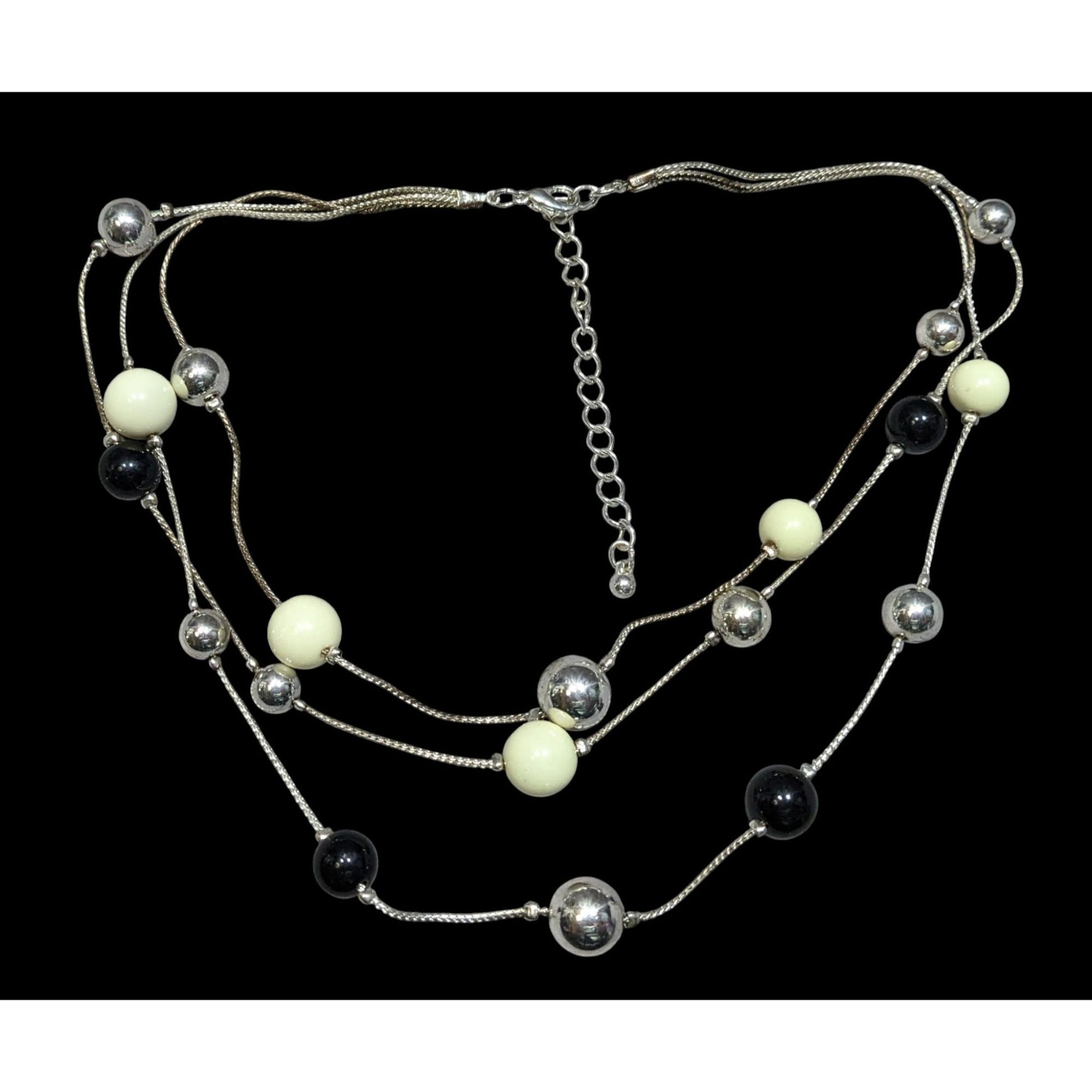 Retro Glam Multi-Layered Silver Tone Necklace With Black & Cream Beads Adjustable Chain
