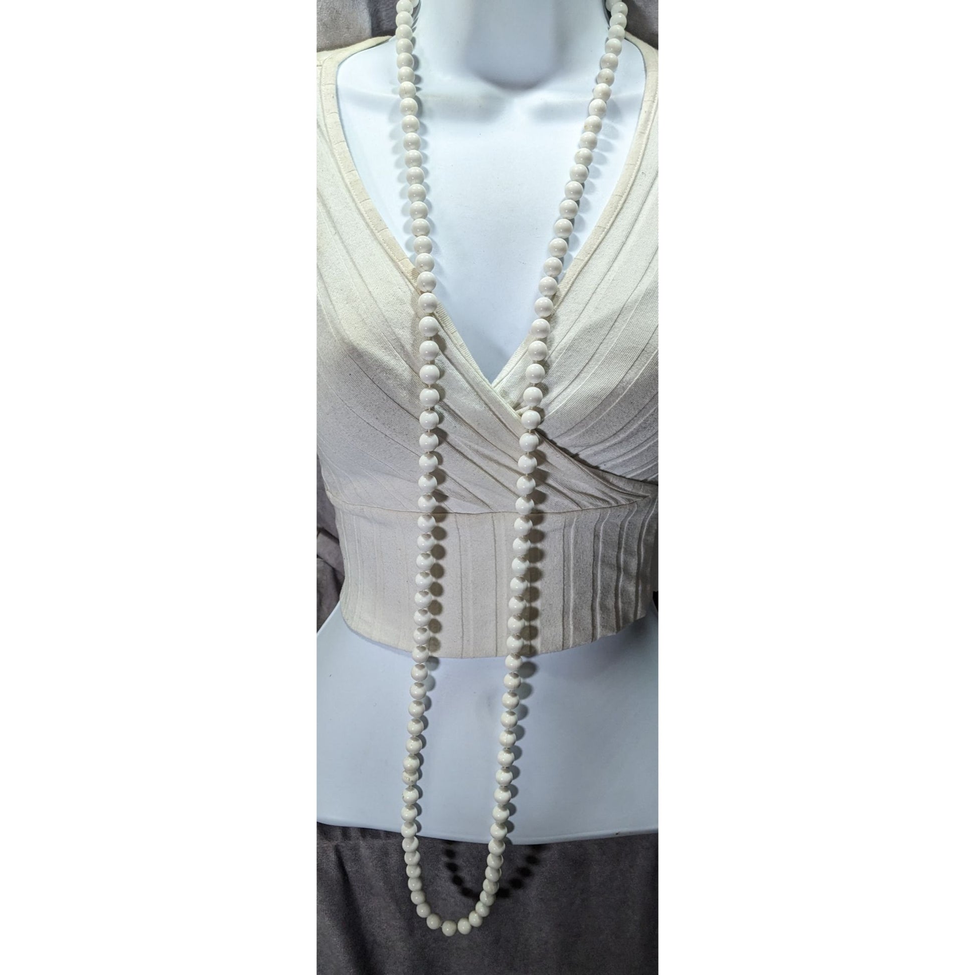 Add a touch of vintage elegance with this extra long white beaded necklace. Perfect for layering or wearing alone, this timeless piece will complement any outfit and ensure you stand out with its classic style.