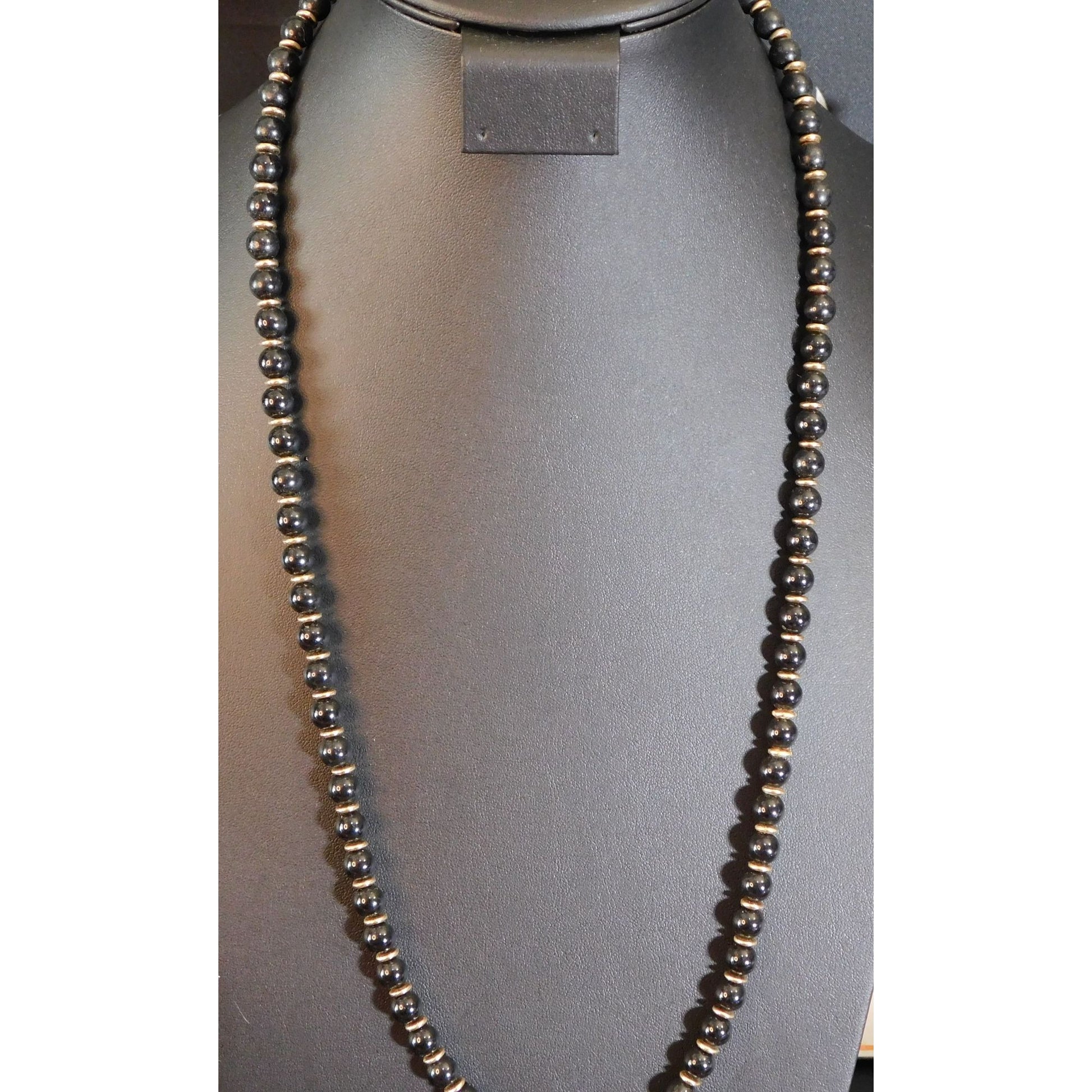 A stunning black and gold tone beaded necklace that effortlessly elevates any outfit. This simple yet elegant piece is perfect for both casual and formal occasions, making it a versatile addition to any jewelry collection.