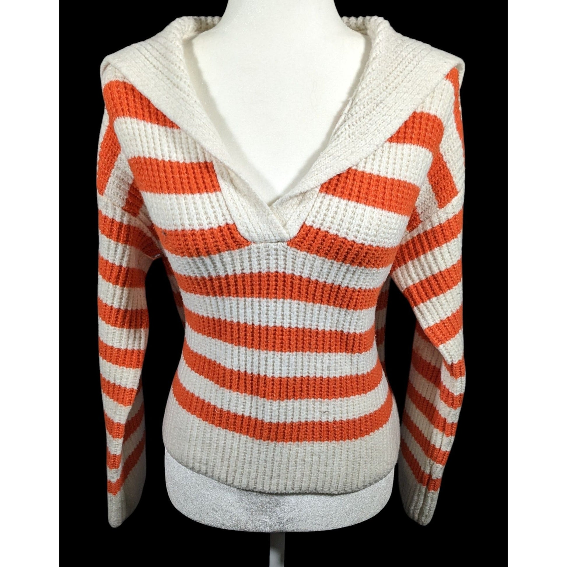 This stylish preppy sweater features a vibrant orange and white striped design. Perfect for adding a pop of color to your wardrobe, its medium size ensures a comfortable fit. Ideal for casual outings or cozy days at home.