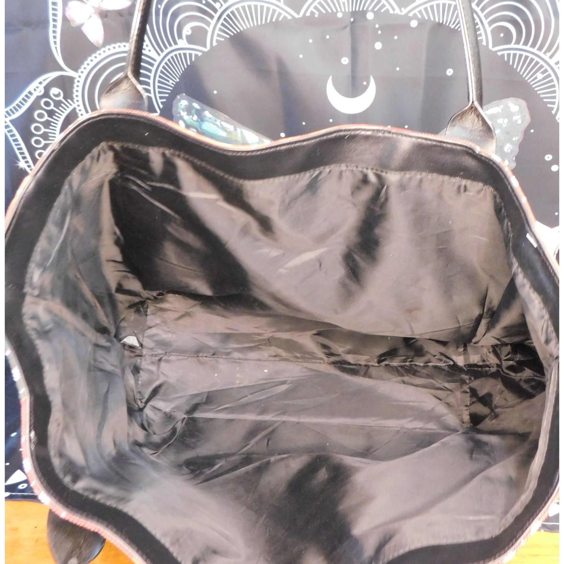 It has a red and black tartan with pink, white, yellow, and green accents made from 100% cotton. It has black handles that attach to black accent trim, and it has a large "V" in the middle, with a silhouette flower border. The interior is black and 100% polyester, so it's easy to wipe clean. It has an open top.