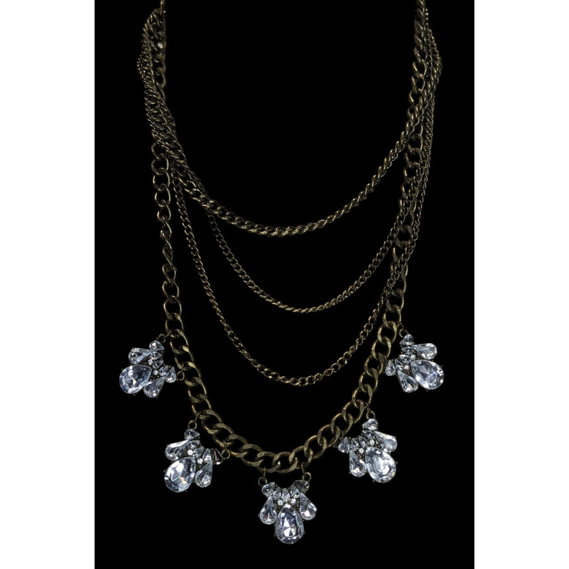Vintage 90s Floral Glam Multi-Layered Necklace With Crystal Teardrop Charms And Bronze-Tone Chains