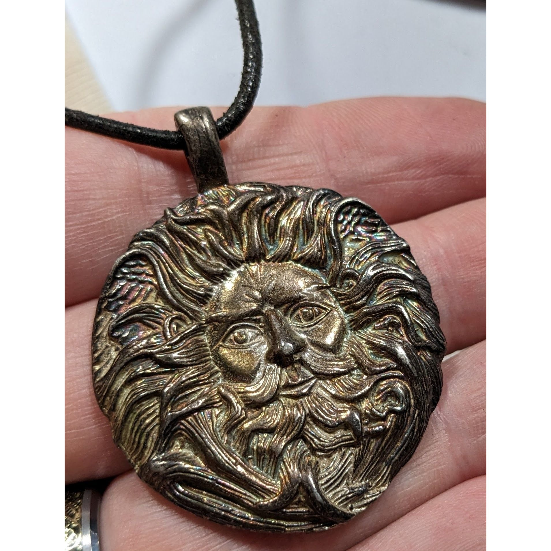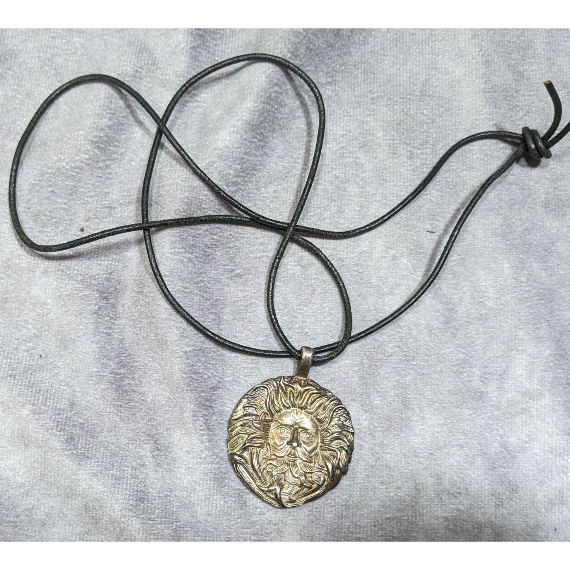 This unique vintage 90s pendant necklace features a Pagan Sun God design, perfect for collectors or those drawn to spiritual symbolism. Signed by the artist, it's a rare find and a meaningful accessory.