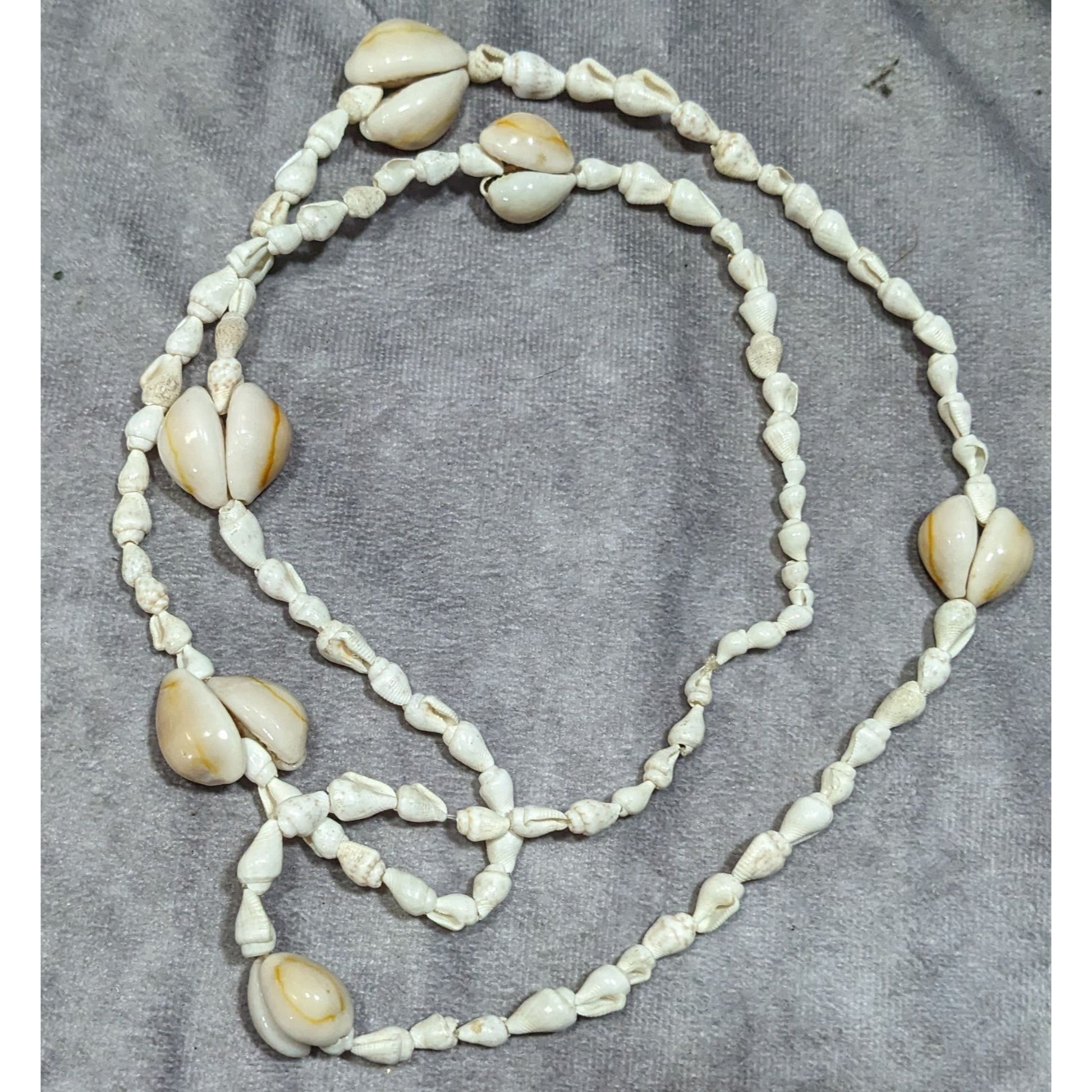 This vintage beachy necklace features a mix of cowrie and other natural shells. Perfect for adding a touch of the ocean to your outfit. Ideal for beach lovers and those who appreciate unique, handmade jewelry.