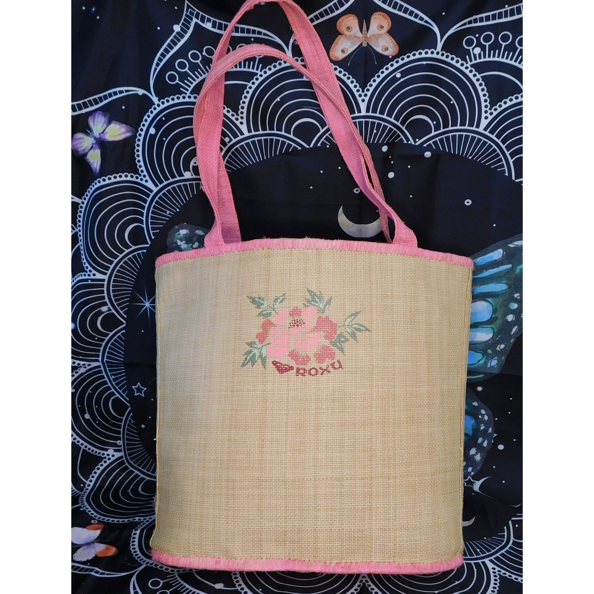 It's made from golden straw, and is woven very tightly and intricately. The bottom is woven from a thicker straw like grass, and the bag stands up on its own. The top and bottom edges have hand threaded woven pink accent lacing. The carrying straps are about 1 inch wide. It has a pink floral arrangement painted on the front, as well as the Roxy logo. The interior is lined with a soft fabric in a denim-like print, and has open pocket in darker blue with the Roxy tag sewn on. This is an amazing bag, perfect for the beach, doing the shopping, or for general travel! There is a little wear on the straps as this is a vintage item, but it's in otherwise great condition!