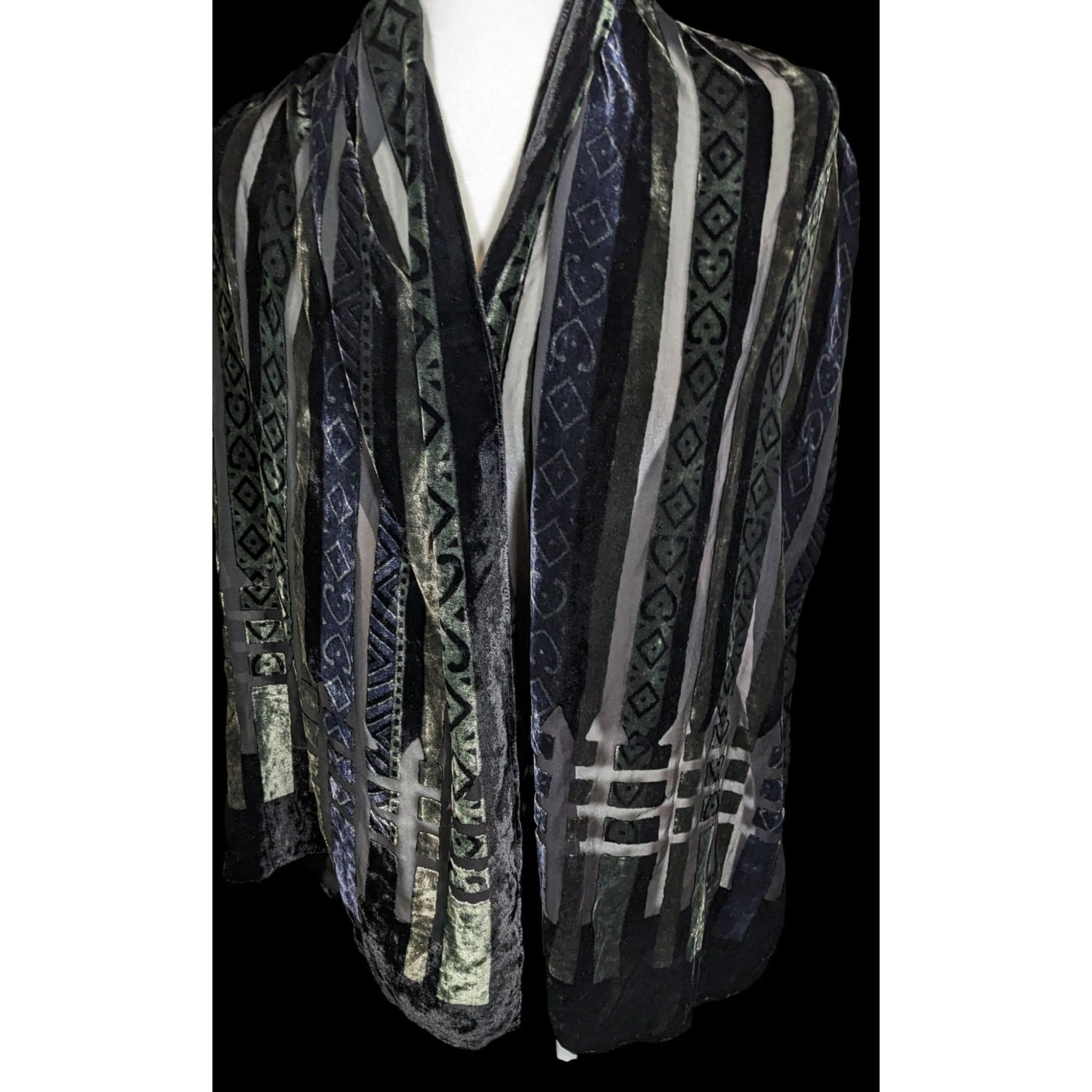 Elevate your style with this vintage blue and green striped geometric velvet burnout scarf. Perfect for any occasion, its luxurious feel and unique pattern add a touch of elegance to any outfit.