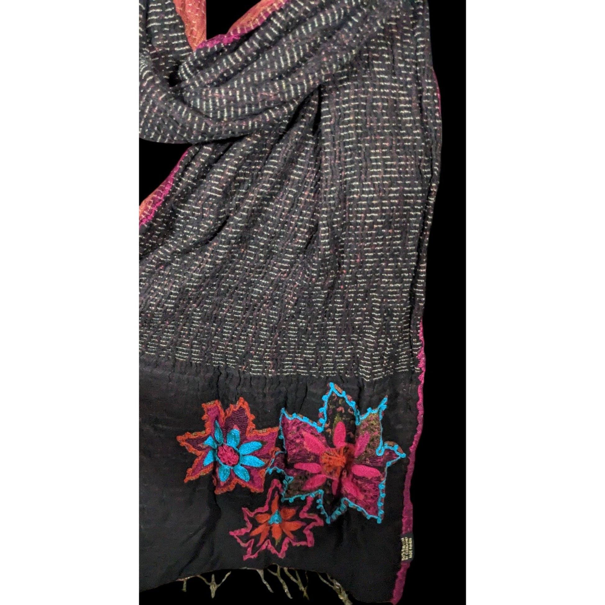 Vintage Bohemian Grey And Pink Floral Embroidered Scarf