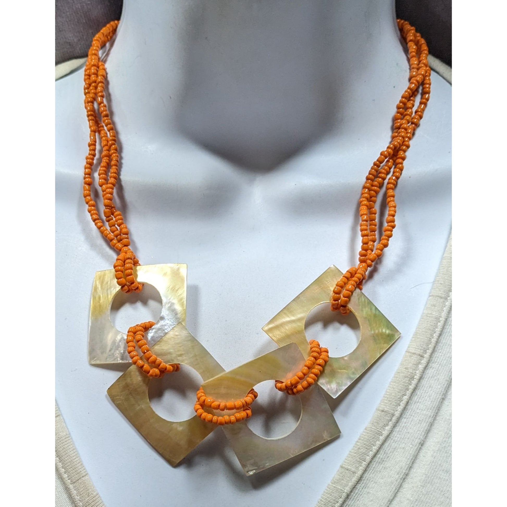 This necklace tells a story of contrast and harmony. Vibrant orange beads intertwine with lustrous mother-of-pearl squares, merging earthy warmth with oceanic elegance.