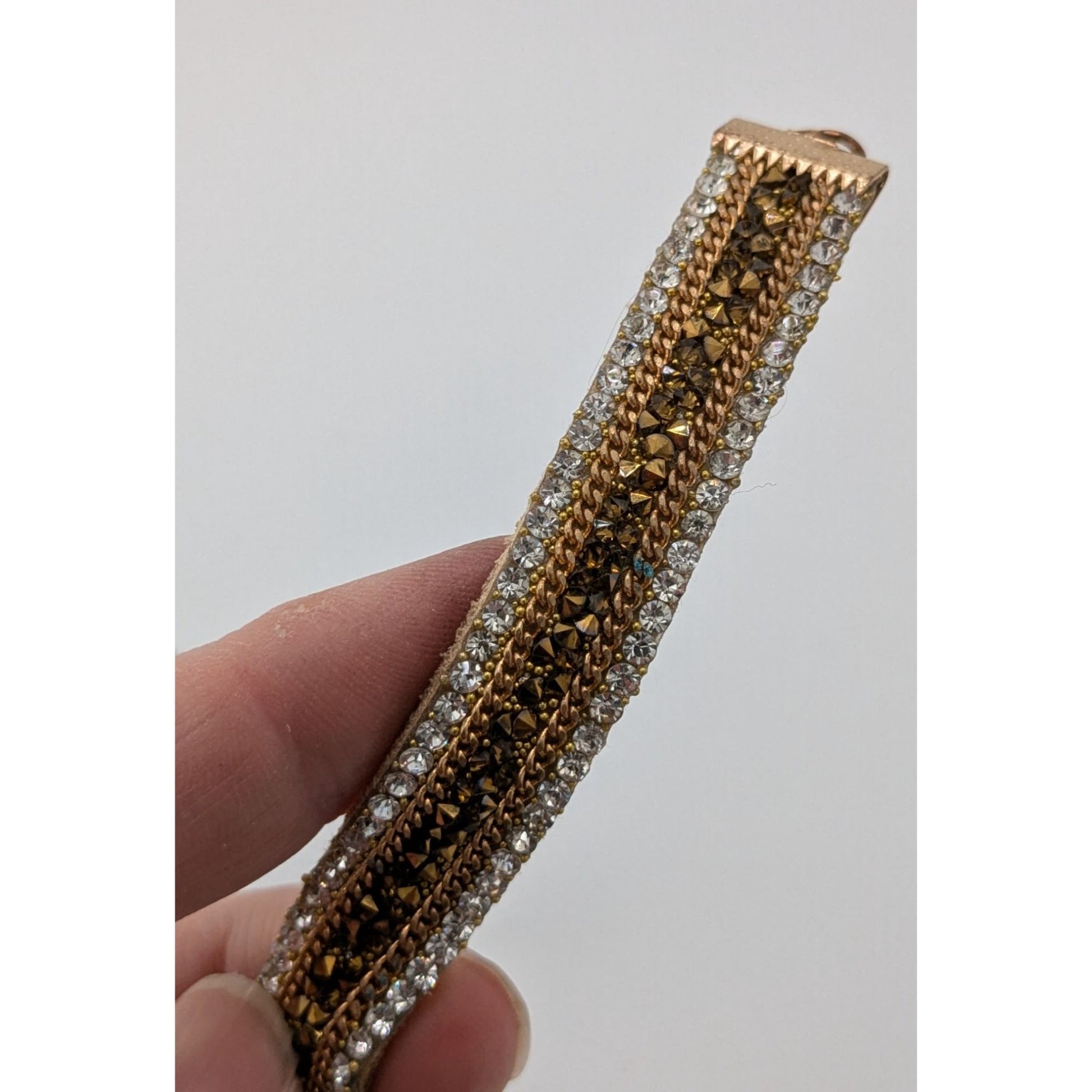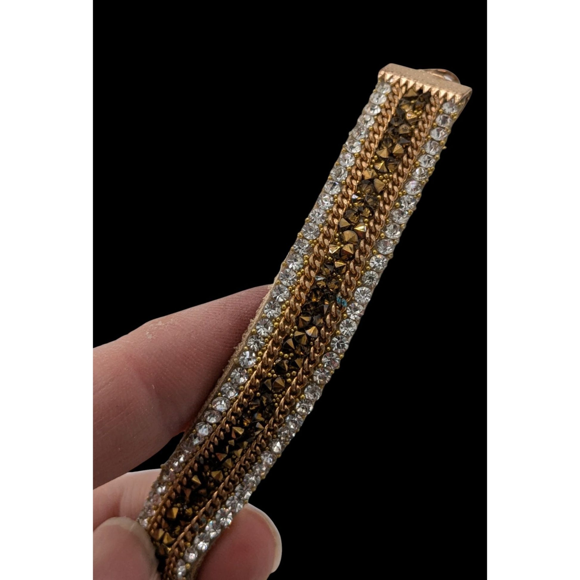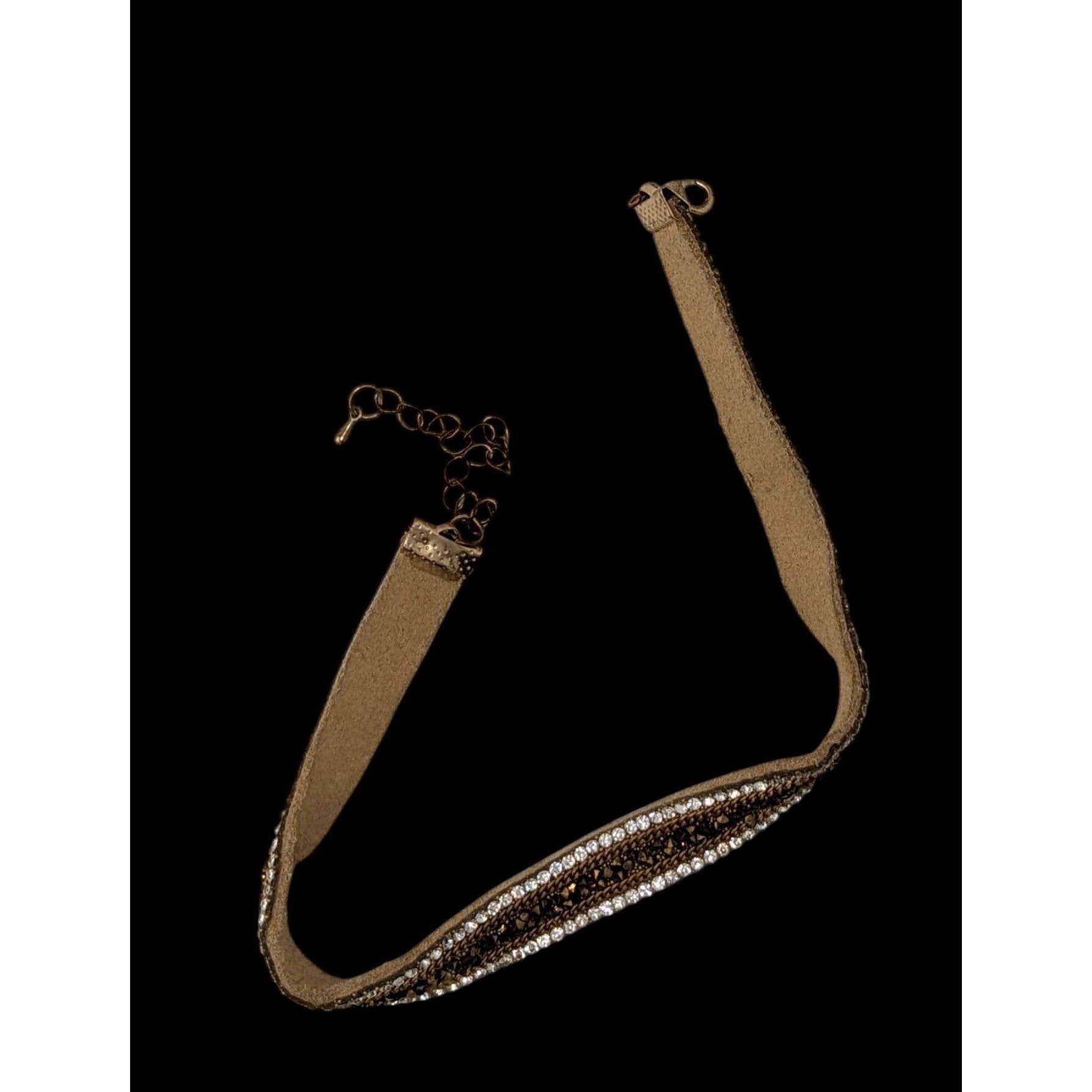 This vintage choker blends glam and rustic charm. The soft suede base is adorned with radiant rhinestones and gold beading, creating a striking, elegant piece. The adjustable chain ensures a perfect fit, adding versatility to its unique design. A nostalgic yet trendy accessory for any jewelry collection.