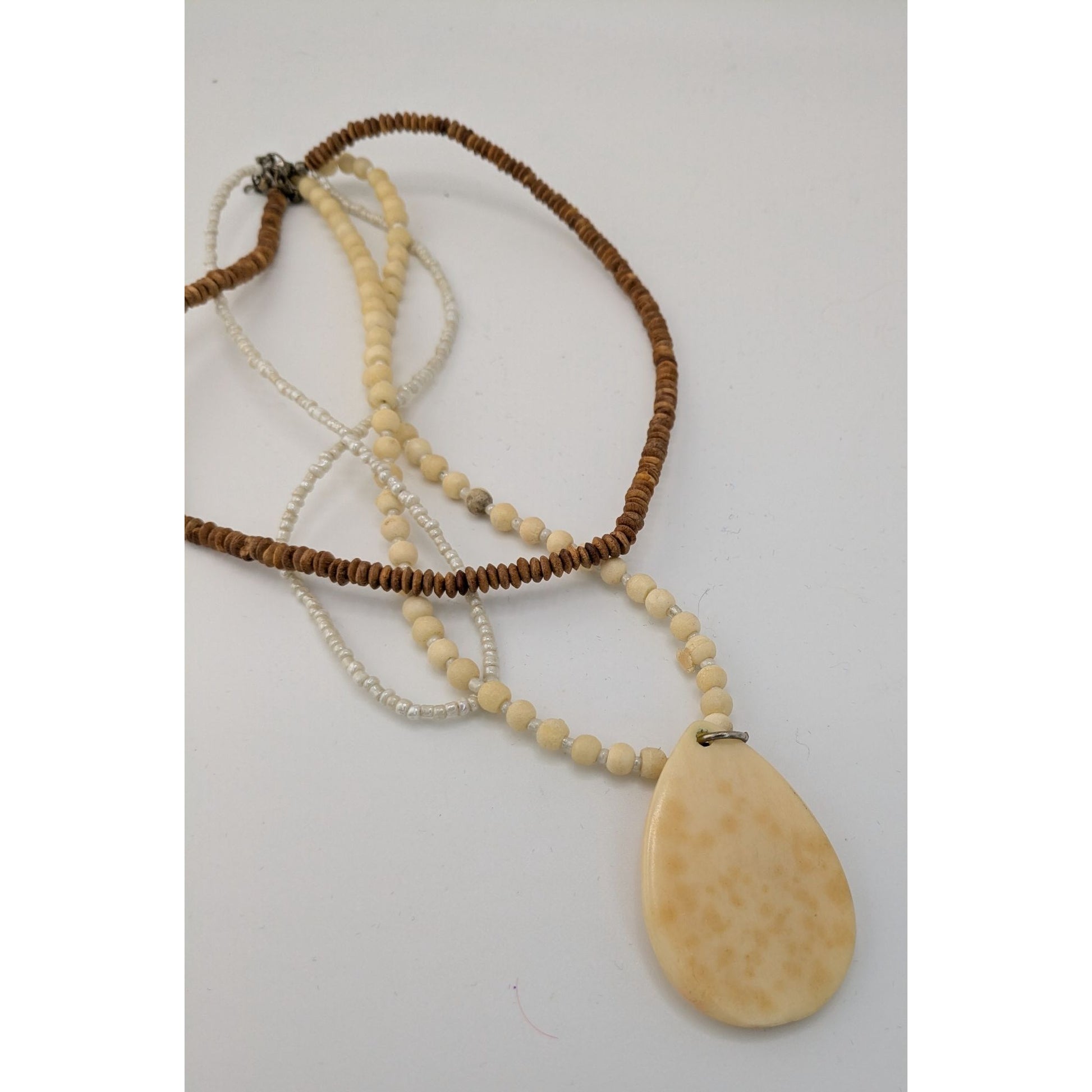 Vintage Boho Multi-Strand Necklace With Cream & Brown Beads Large Teardrop Pendant