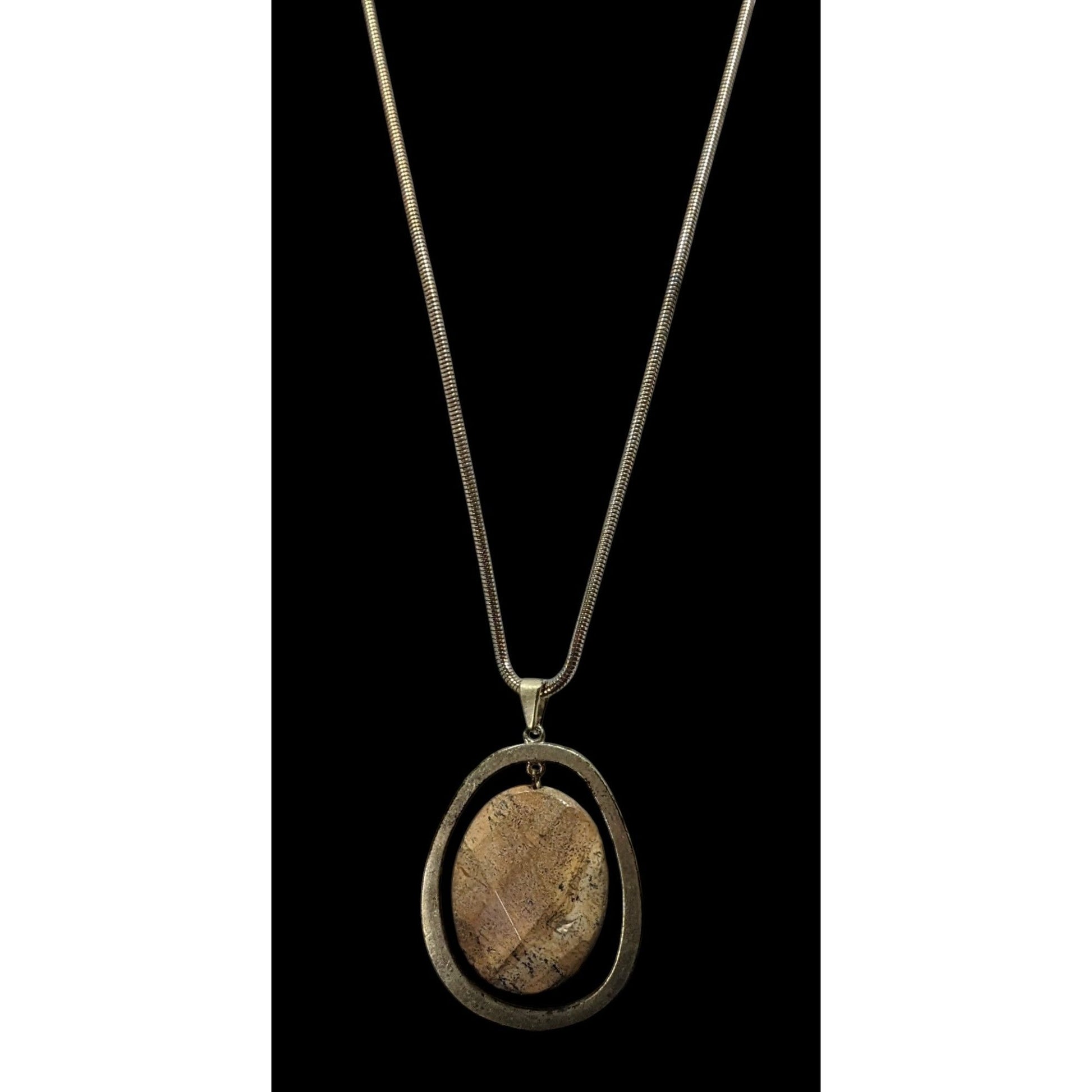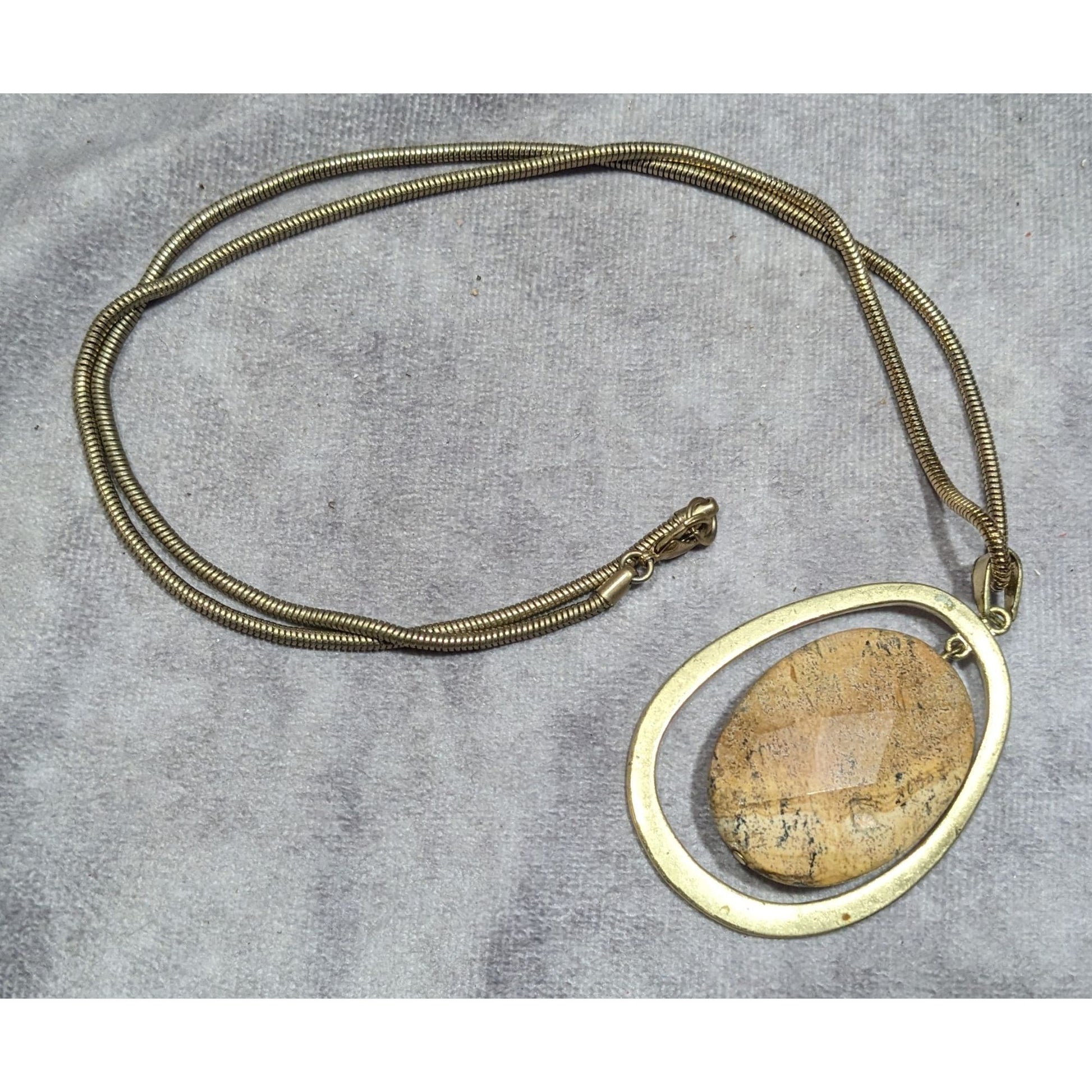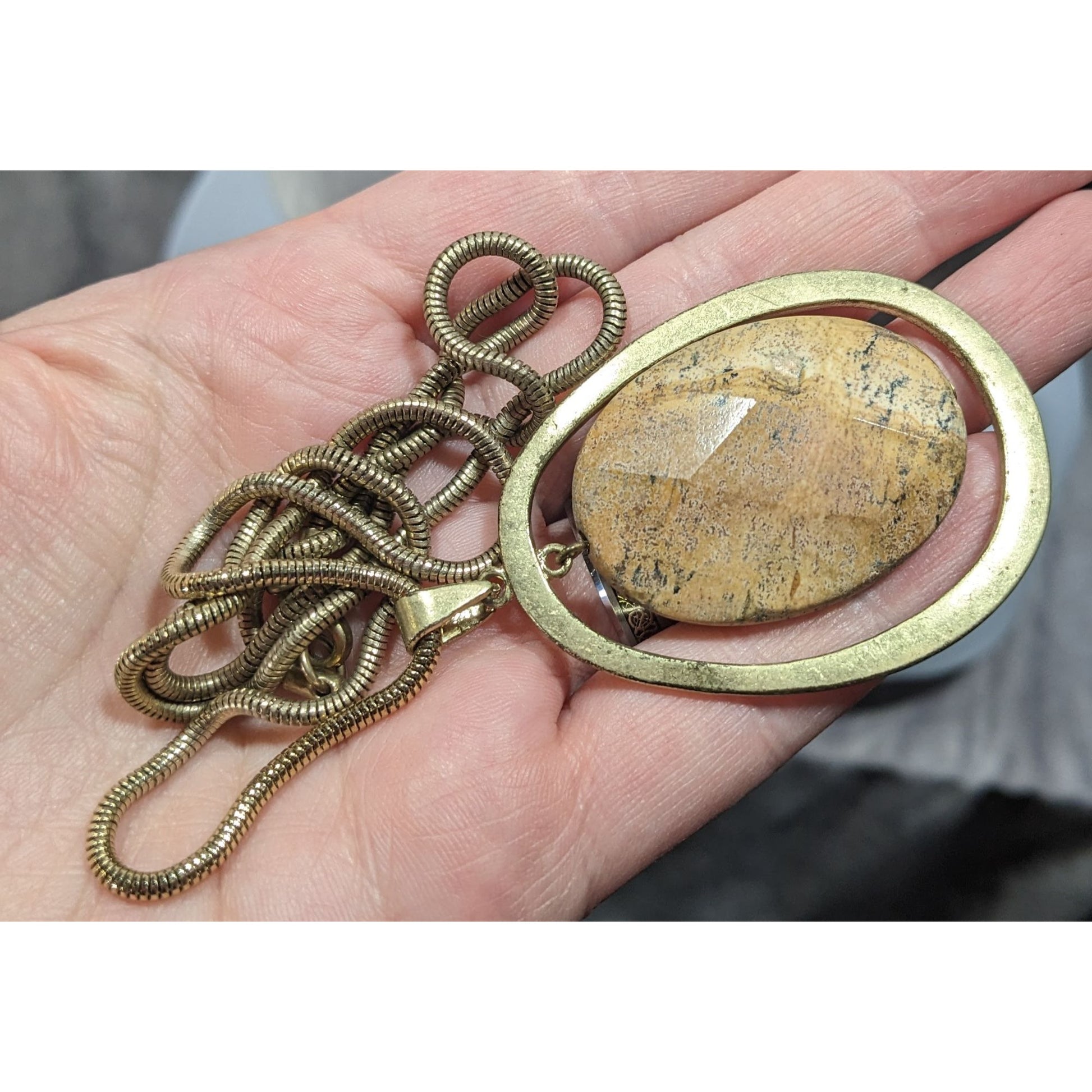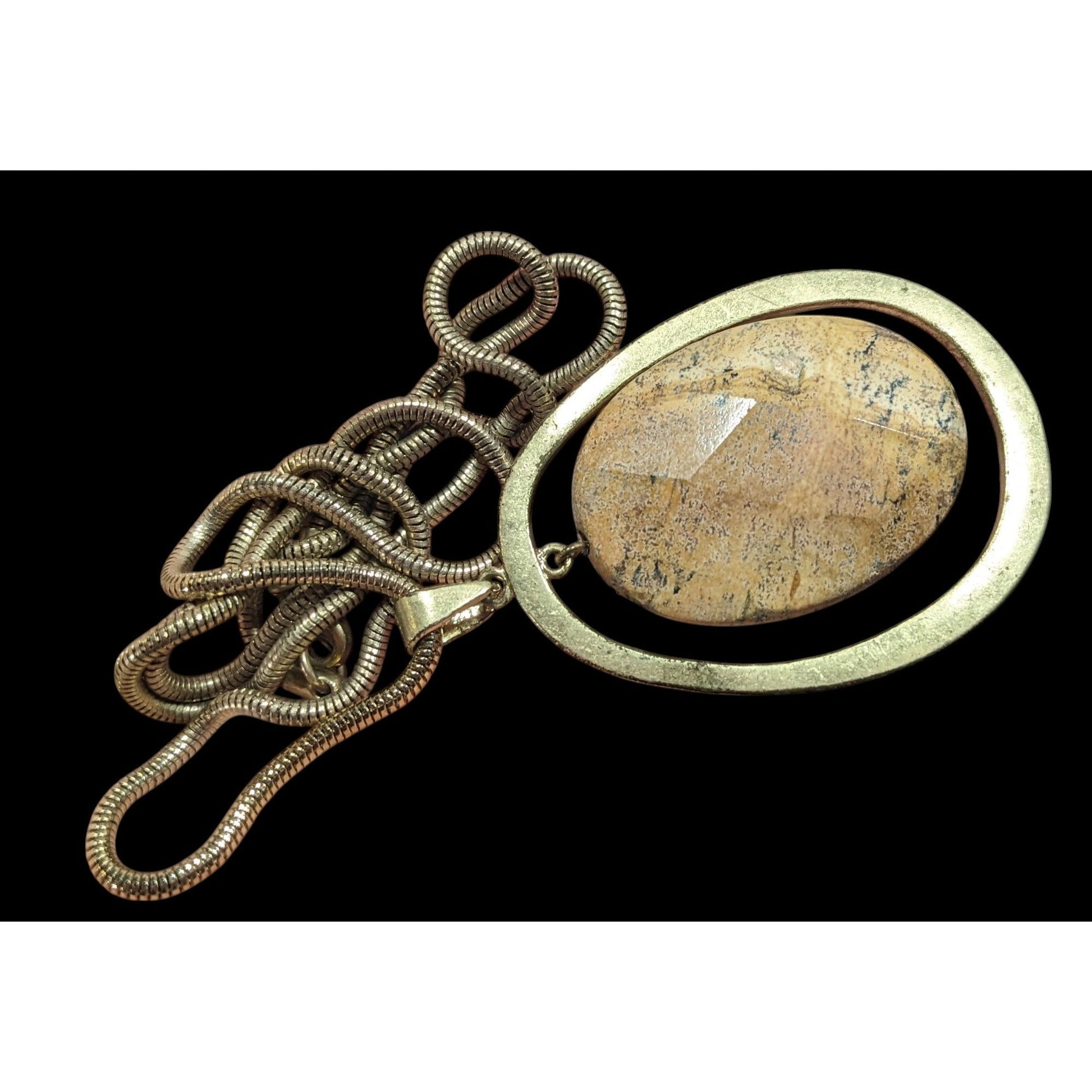 This stunning vintage Brutalist necklace features a gold tone finish with a captivating faceted stone centerpiece, perfect for adding a touch of elegance to any outfit.