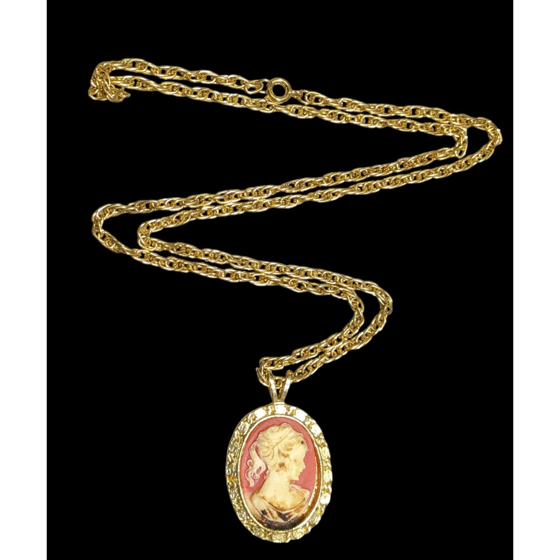 Vintage Cameo Pendant Necklace With Ornate Chain & Intricate Profile Design