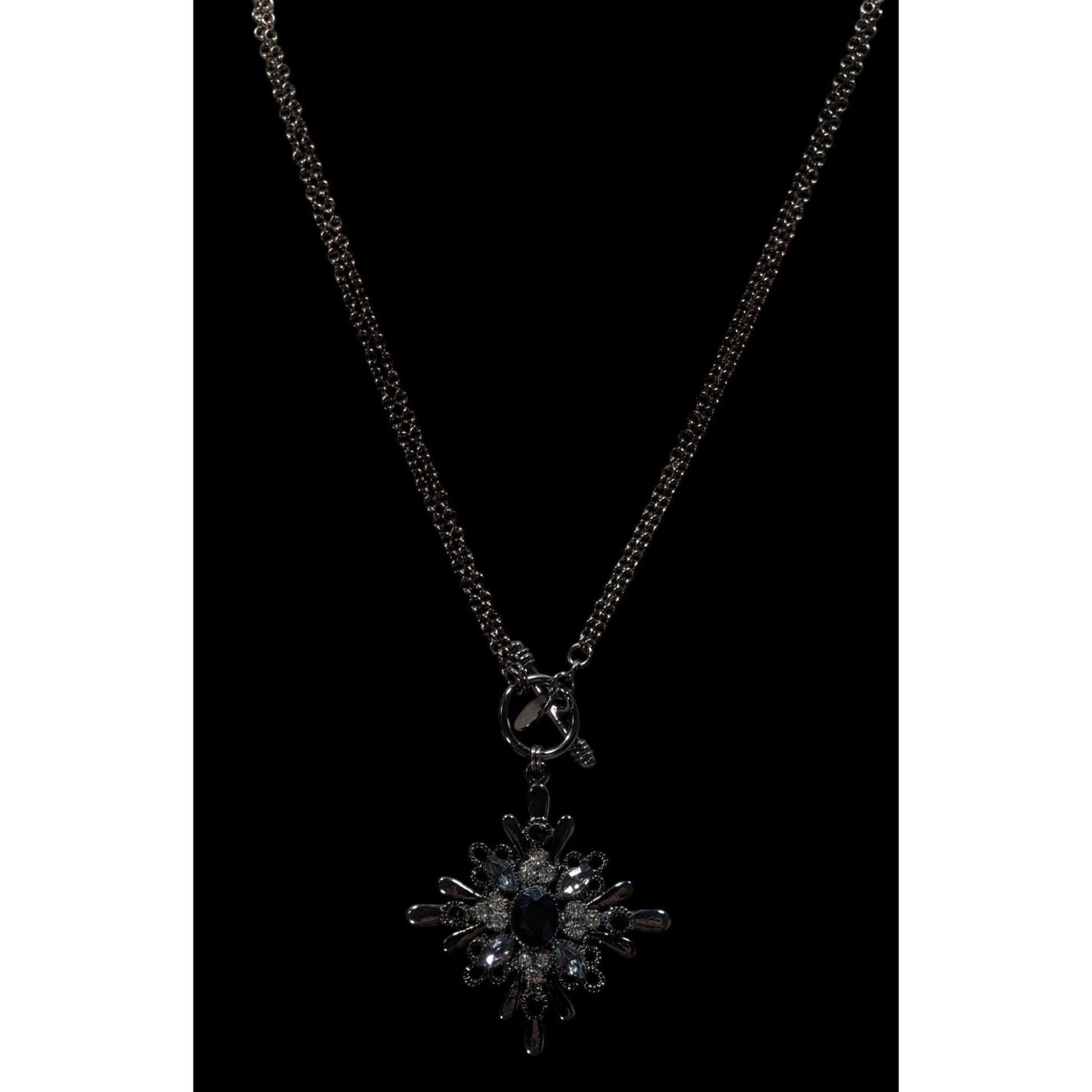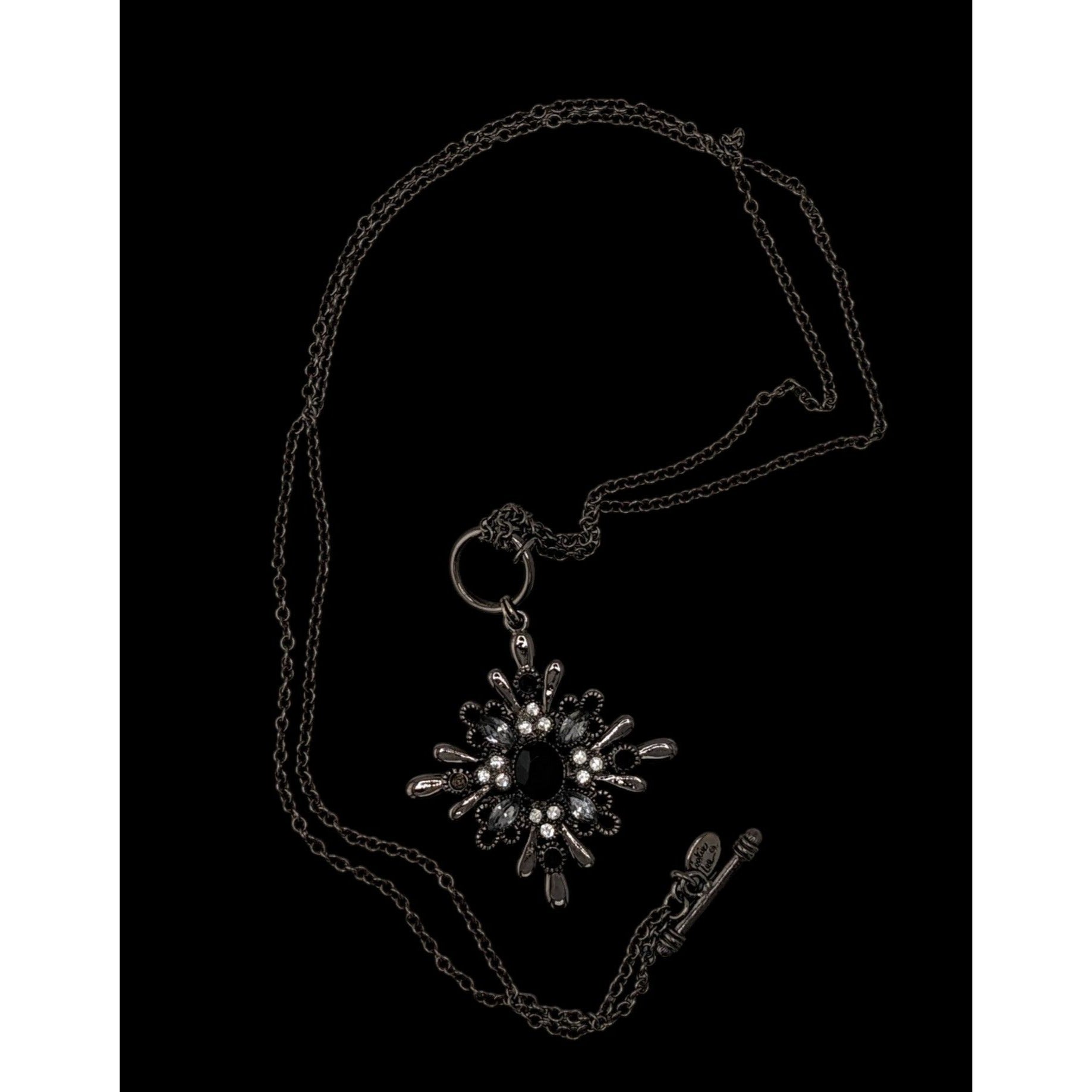 This striking Cookie Lee necklace features a gothic-inspired starburst charm adorned with black and clear crystals. Its 18-inch chain pairs elegantly with the 2-inch pendant, secured by a toggle clasp. A bold piece that enhances any ensemble with its vintage allure and intricate craftsmanship.