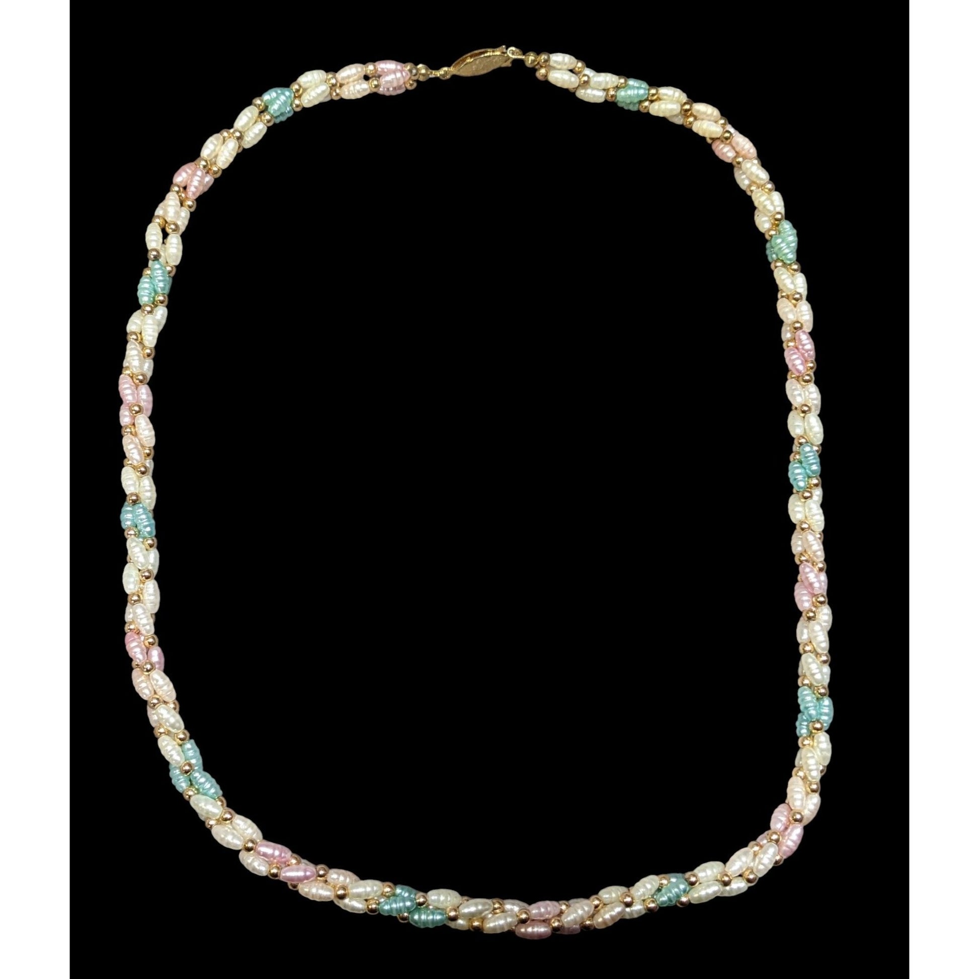 Vintage Coquette Pastel Rainbow Pearl Beaded Necklace With Gold Tone Accents