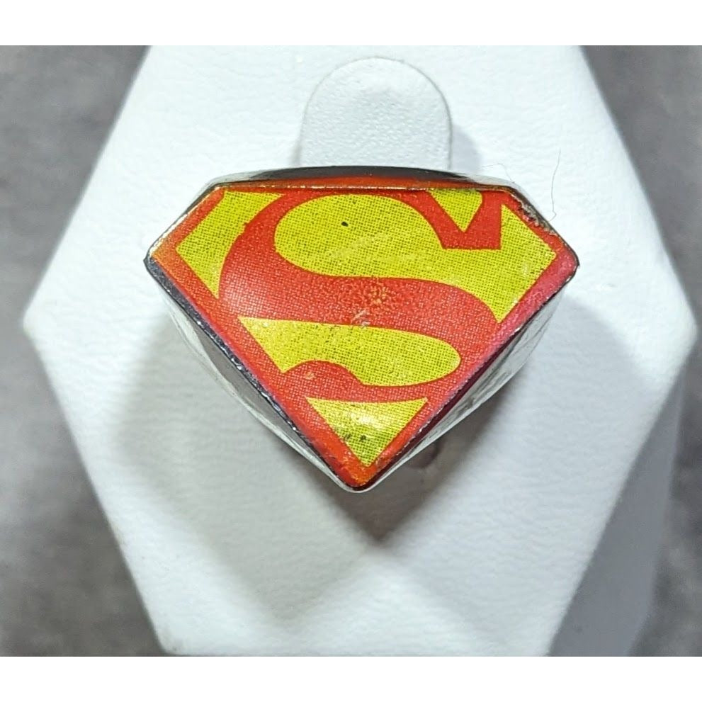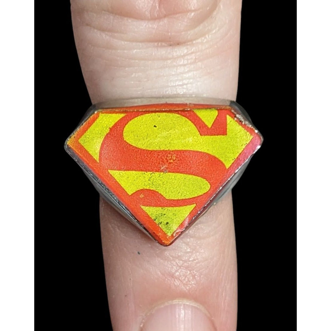 This vintage DC Superman plastic toy collectible ring is a charming piece for any superhero fan. It features classic Superman design and vibrant colors, making it a great addition to a collection or as a nostalgic accessory.