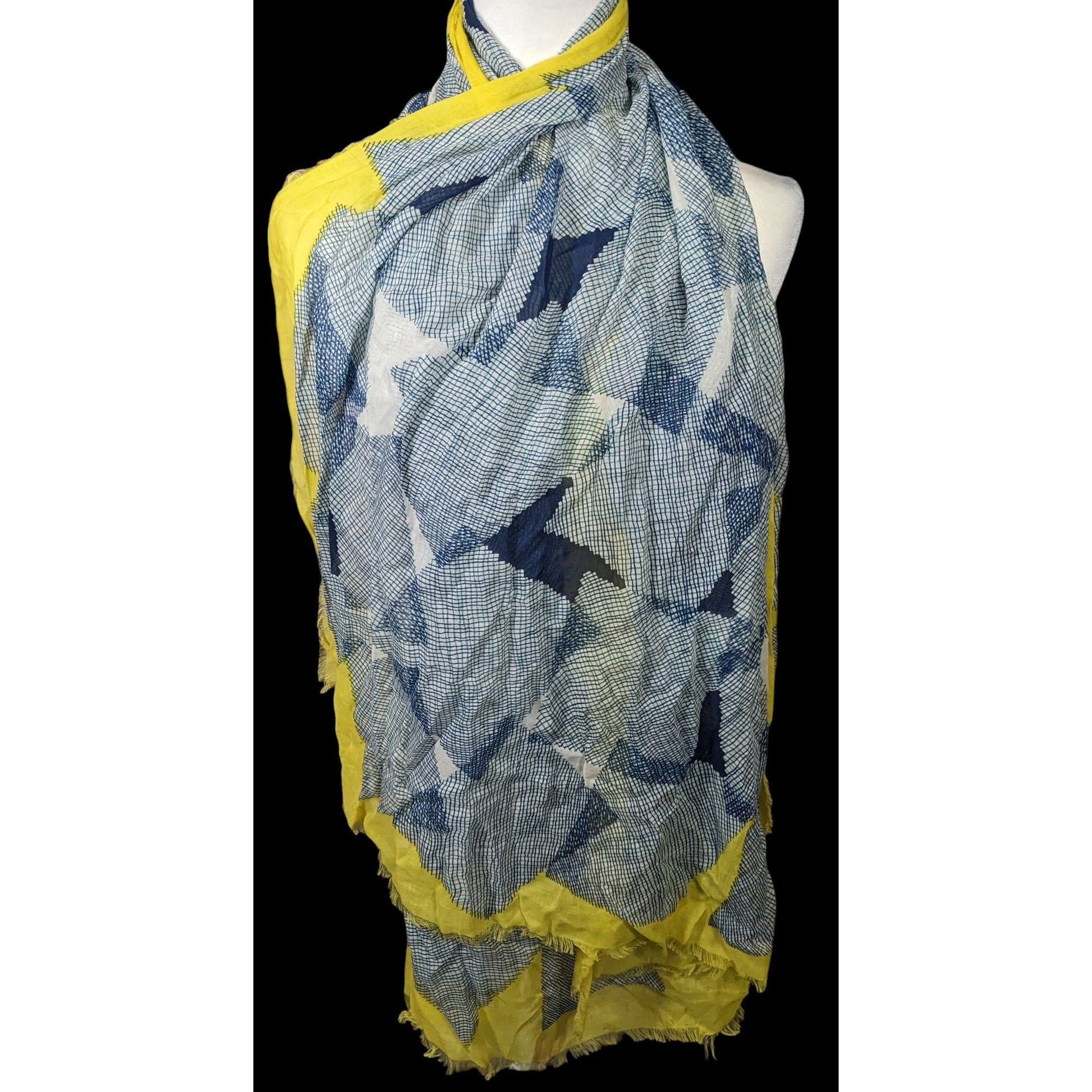 Elevate your style with this vintage Diane Von Furstenberg scarf. Featuring a striking blue and yellow geometric abstract design, it's a timeless accessory for any wardrobe. Perfect for adding a pop of color to any outfit, this scarf exudes elegance and sophistication.