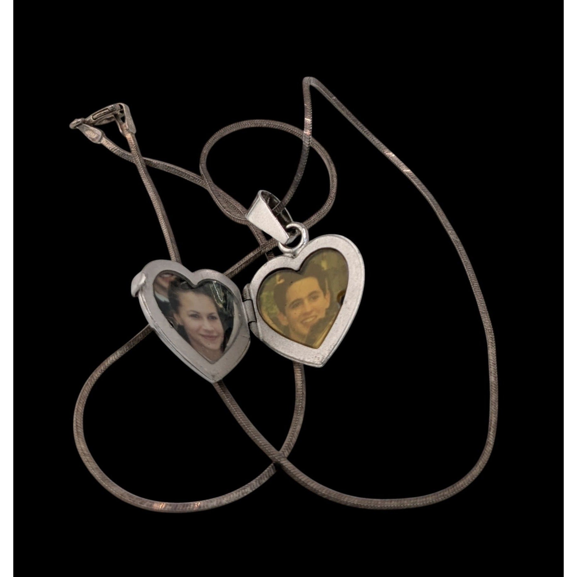 This locket whispers tales of cherished memories, with delicate floral engravings and a monogrammed back. Inside, two photos remain—a glimpse into a bygone era.