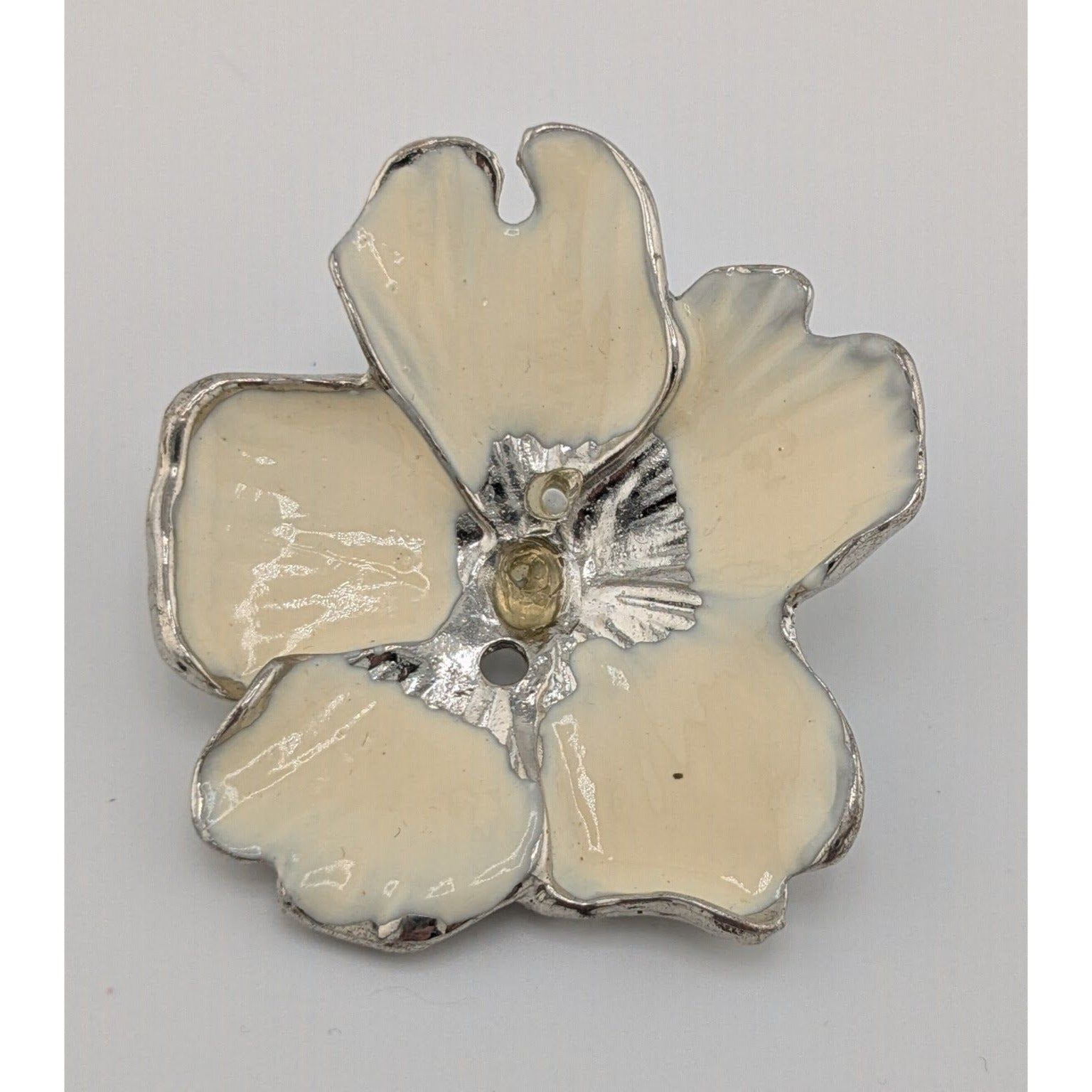 Elegant vintage floral brooch with a silver tone and cream enamel. Note: missing piece. Perfect for collectors or as a unique accessory to enhance your outfit.