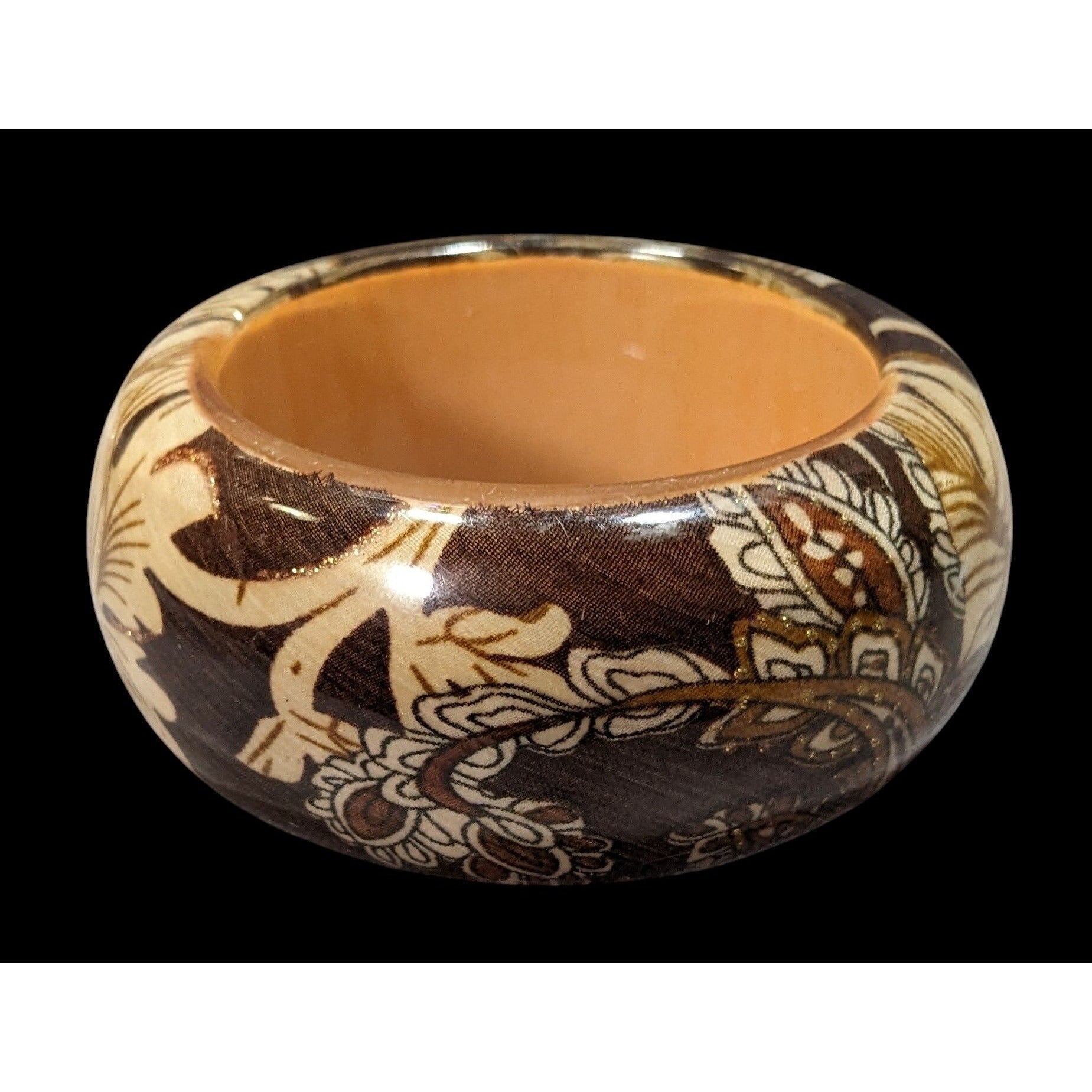 This charming vintage bracelet features a vibrant floral design, combining chunky wood and fabric under durable acrylic. Ideal for adding a retro touch to any outfit, it’s a unique accessory for vintage lovers.