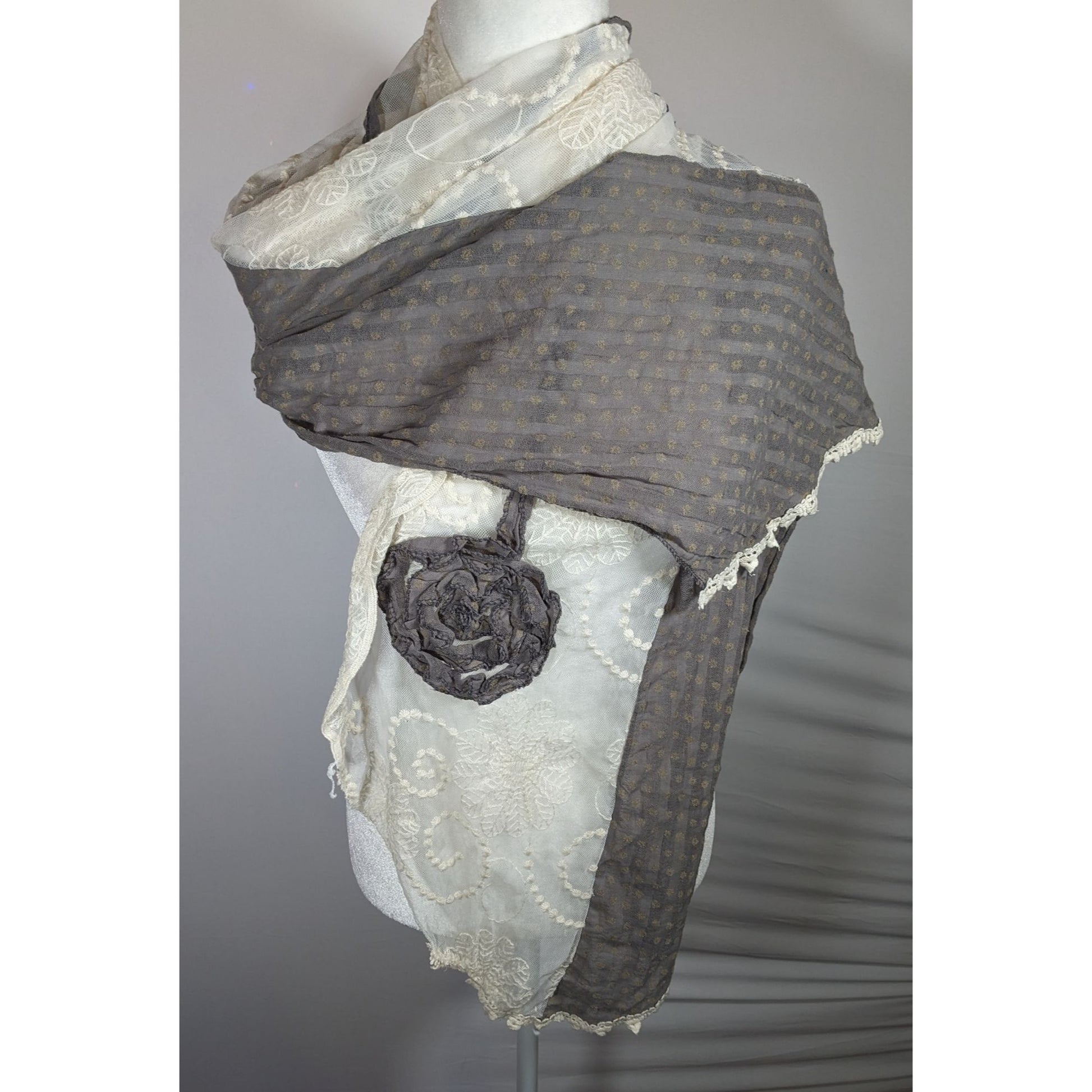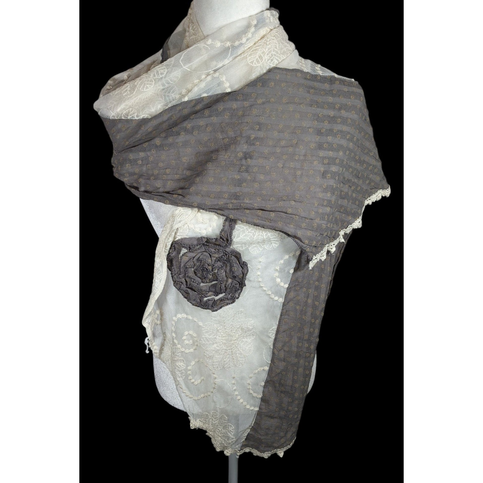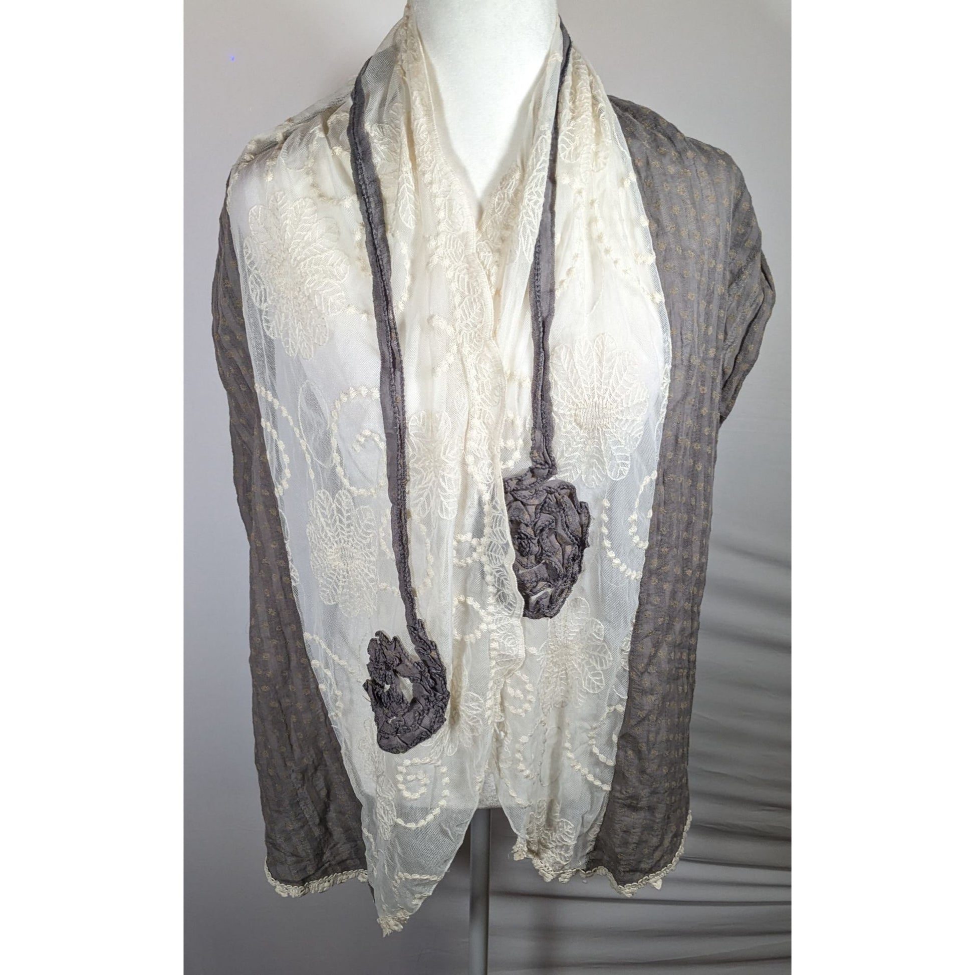Vintage Floral Embroidered Lace Grey And White Scarf