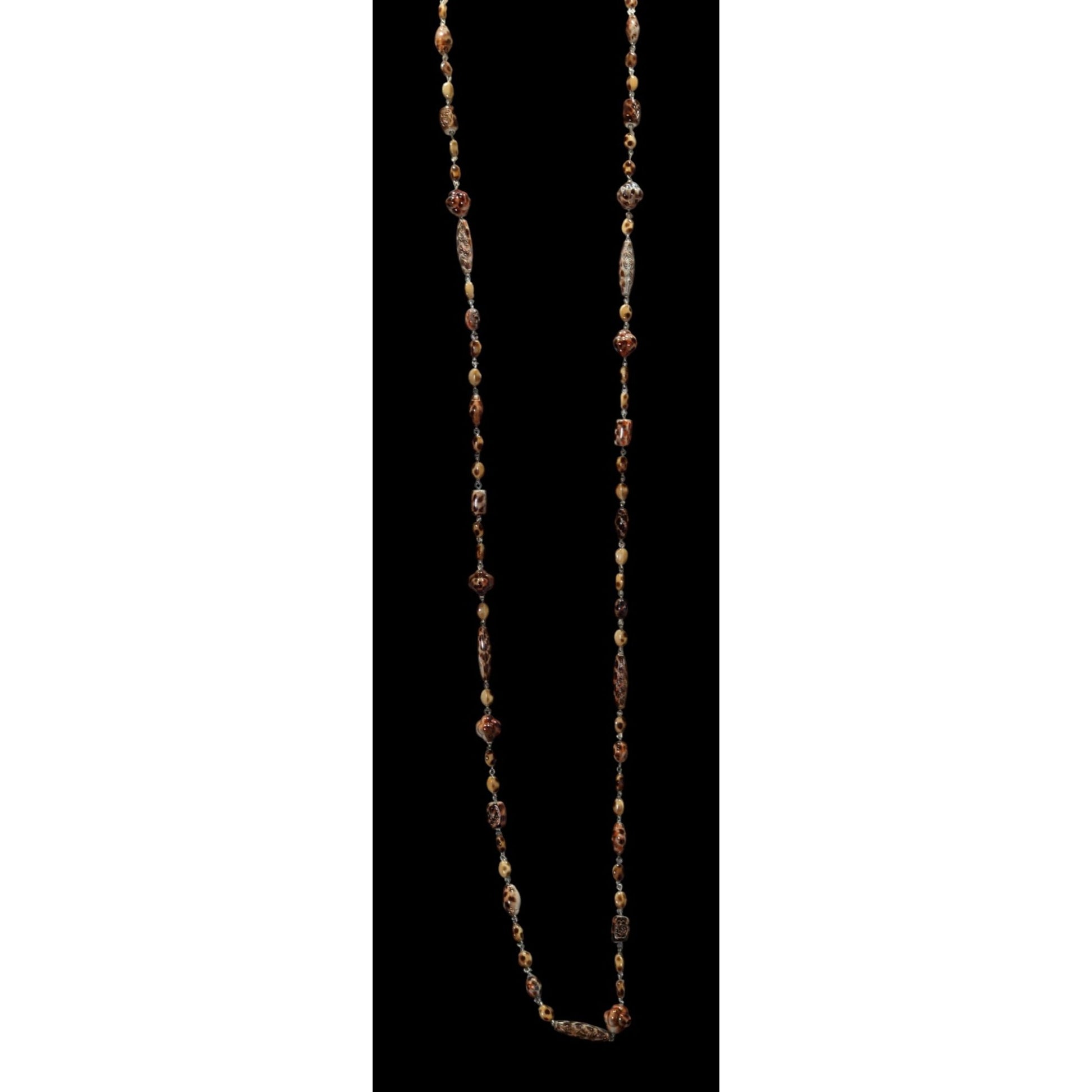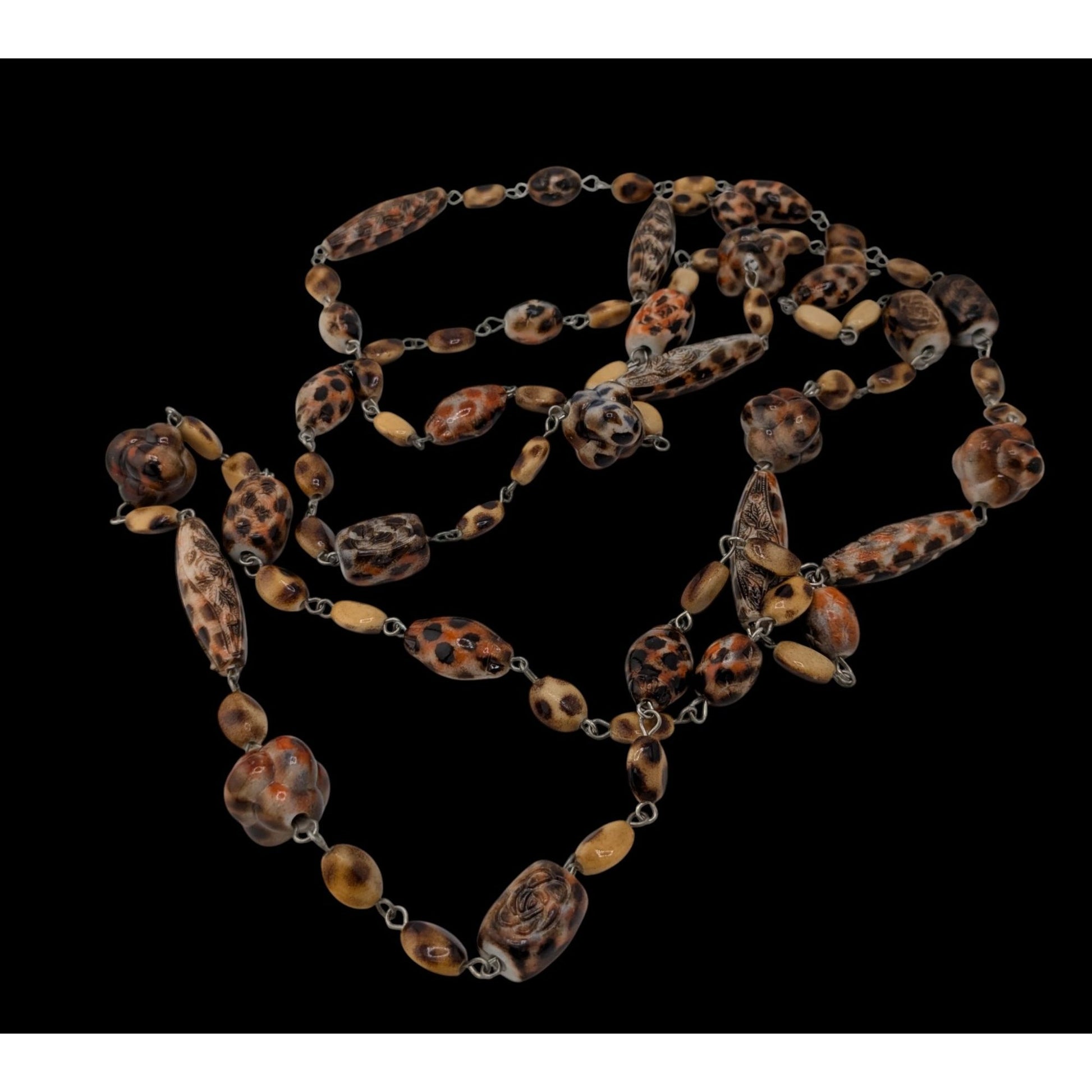A stunning vintage necklace featuring a floral engraved animal print design with long beads. Perfect for adding a touch of elegance to any outfit. Ideal for animal lovers and vintage jewelry enthusiasts.