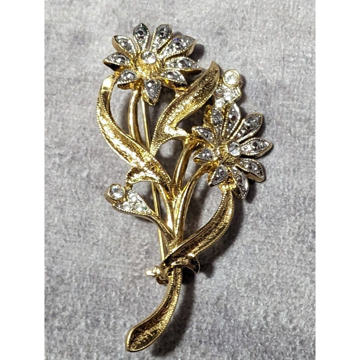 A stunning vintage brooch with a floral design, featuring a blend of silver and gold tones adorned with sparkling rhinestones. Perfect for adding a touch of elegance to any outfit.