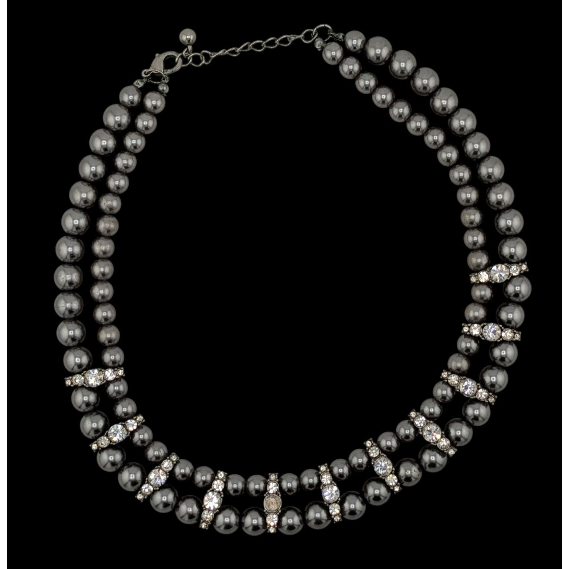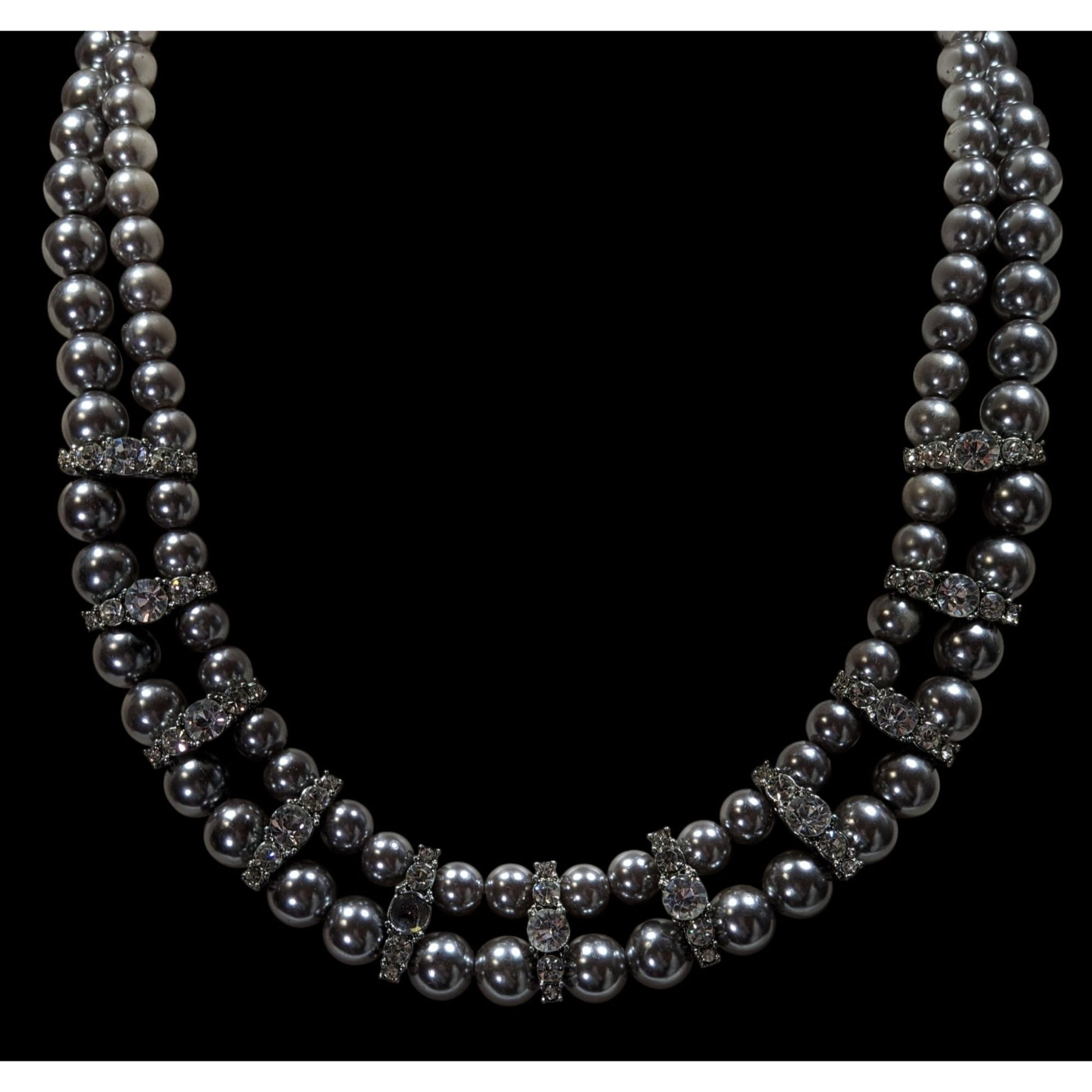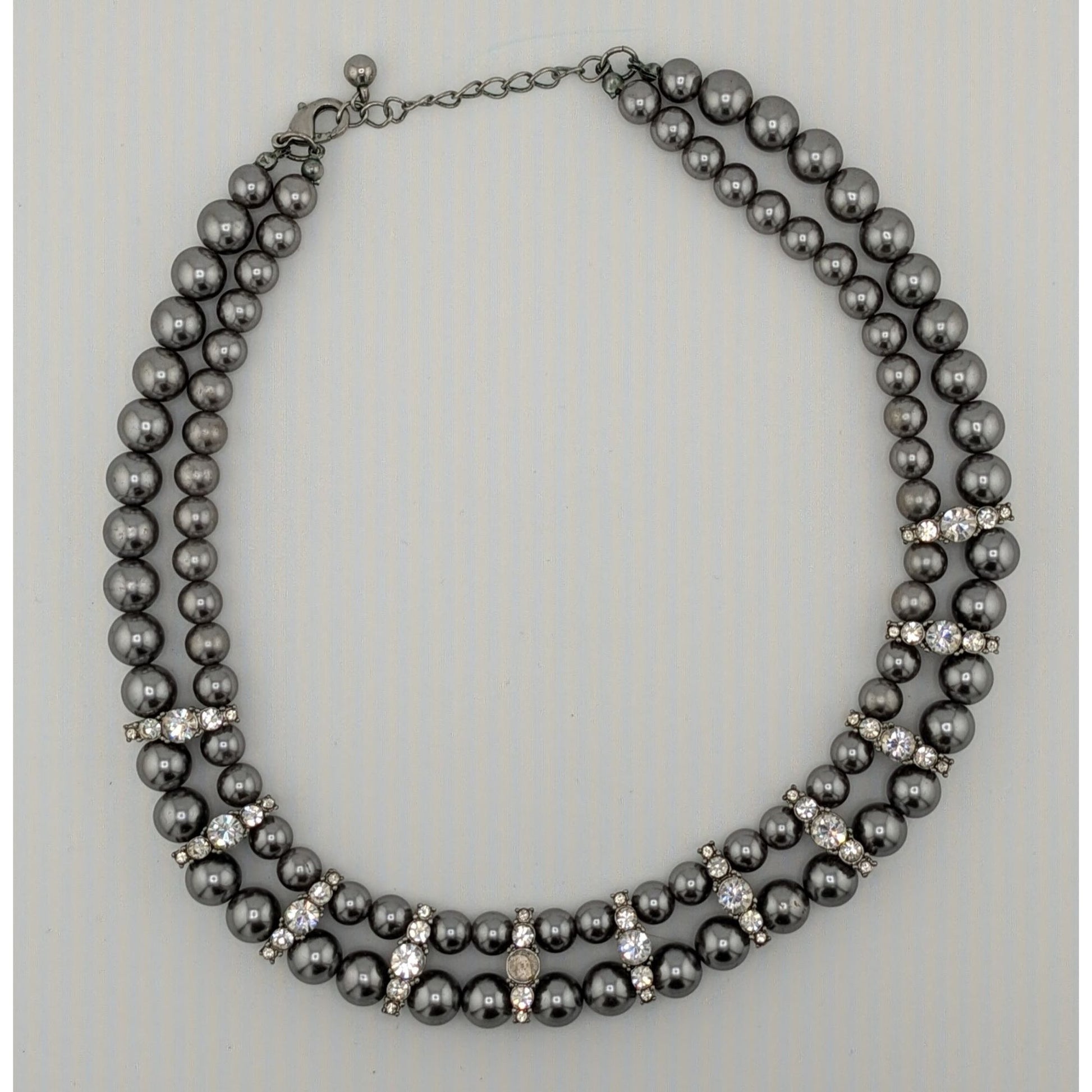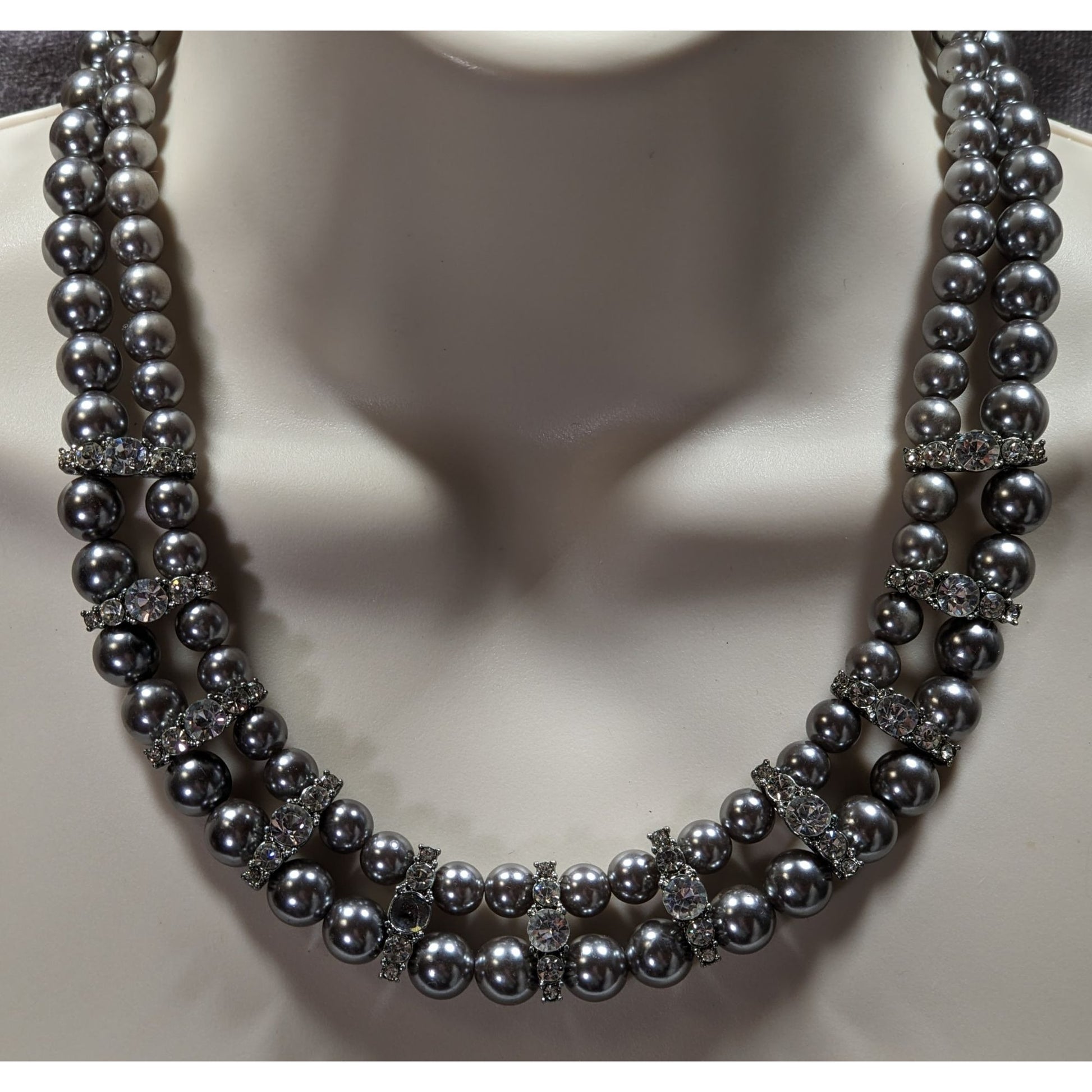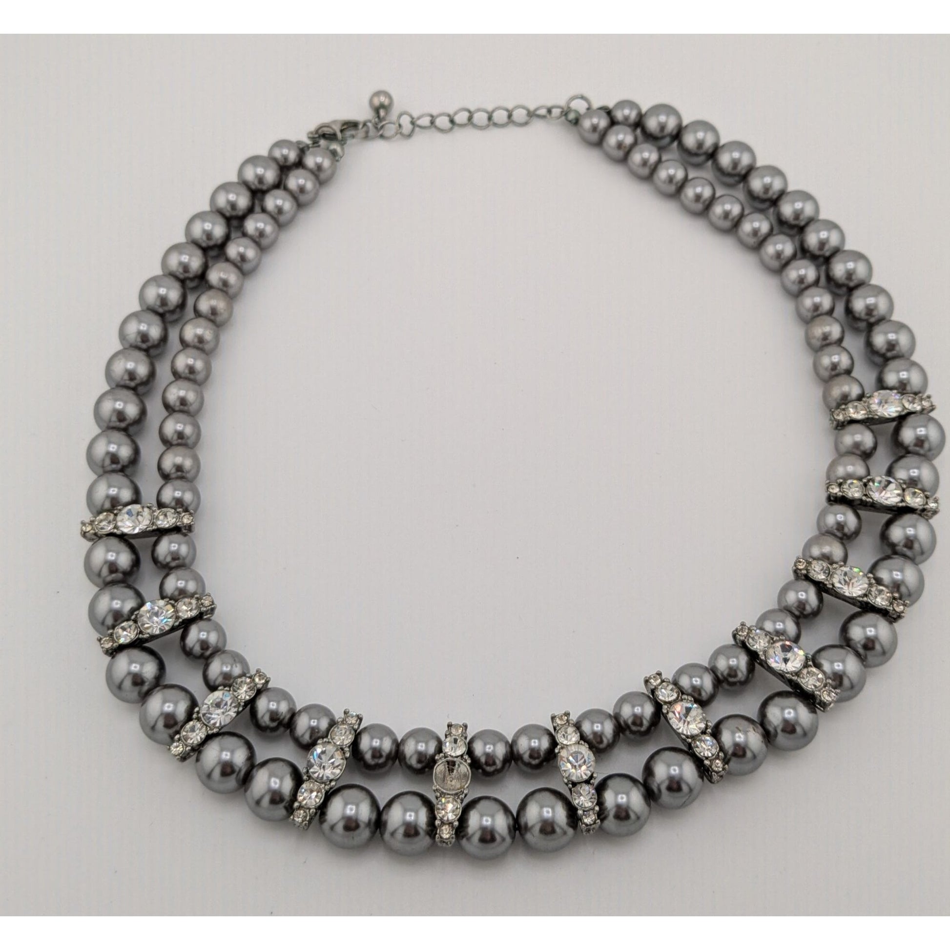 Elevate your style with this vintage glam double strand necklace featuring faux pearls and sparkling rhinestone accents. Perfect for special occasions or adding a touch of elegance to your everyday look.