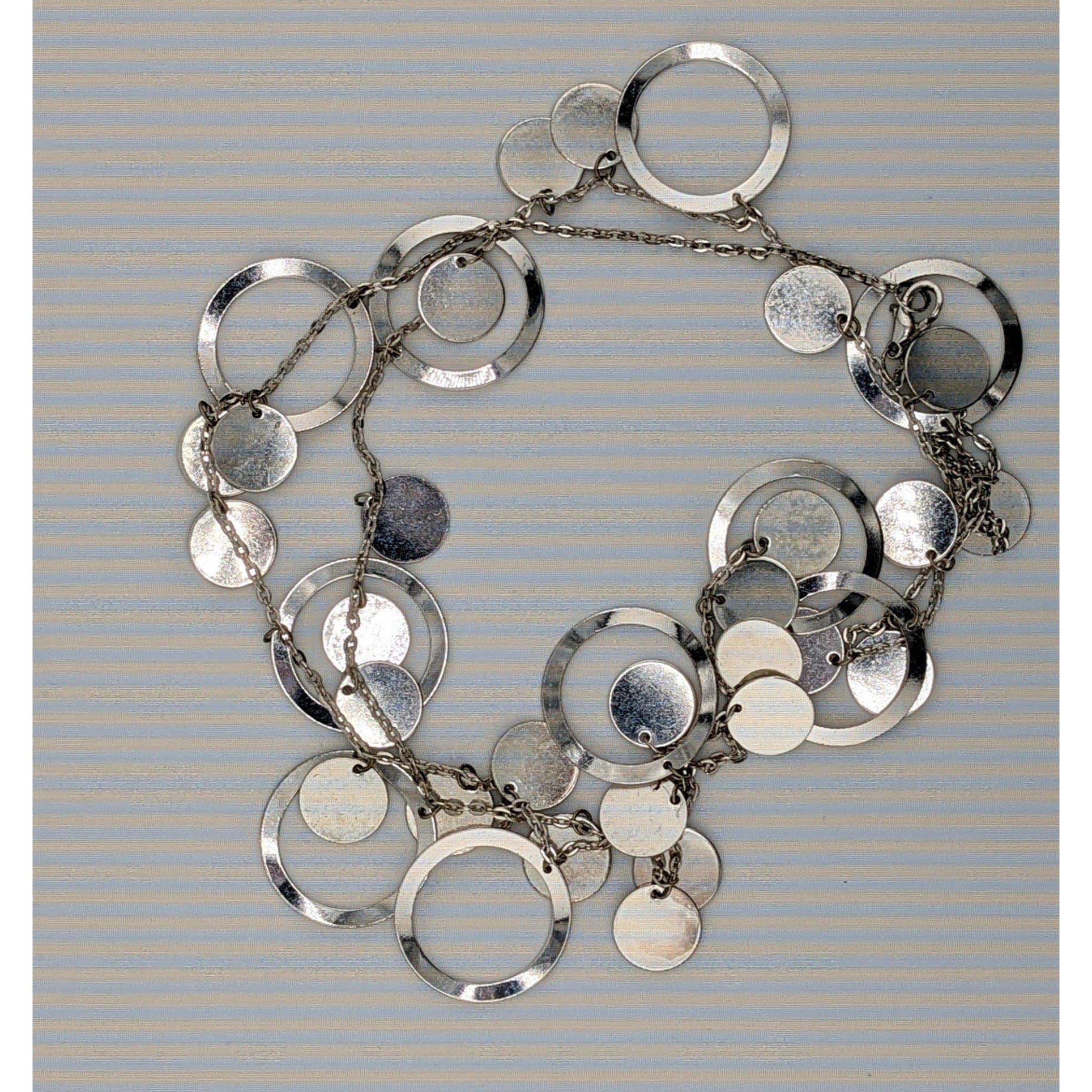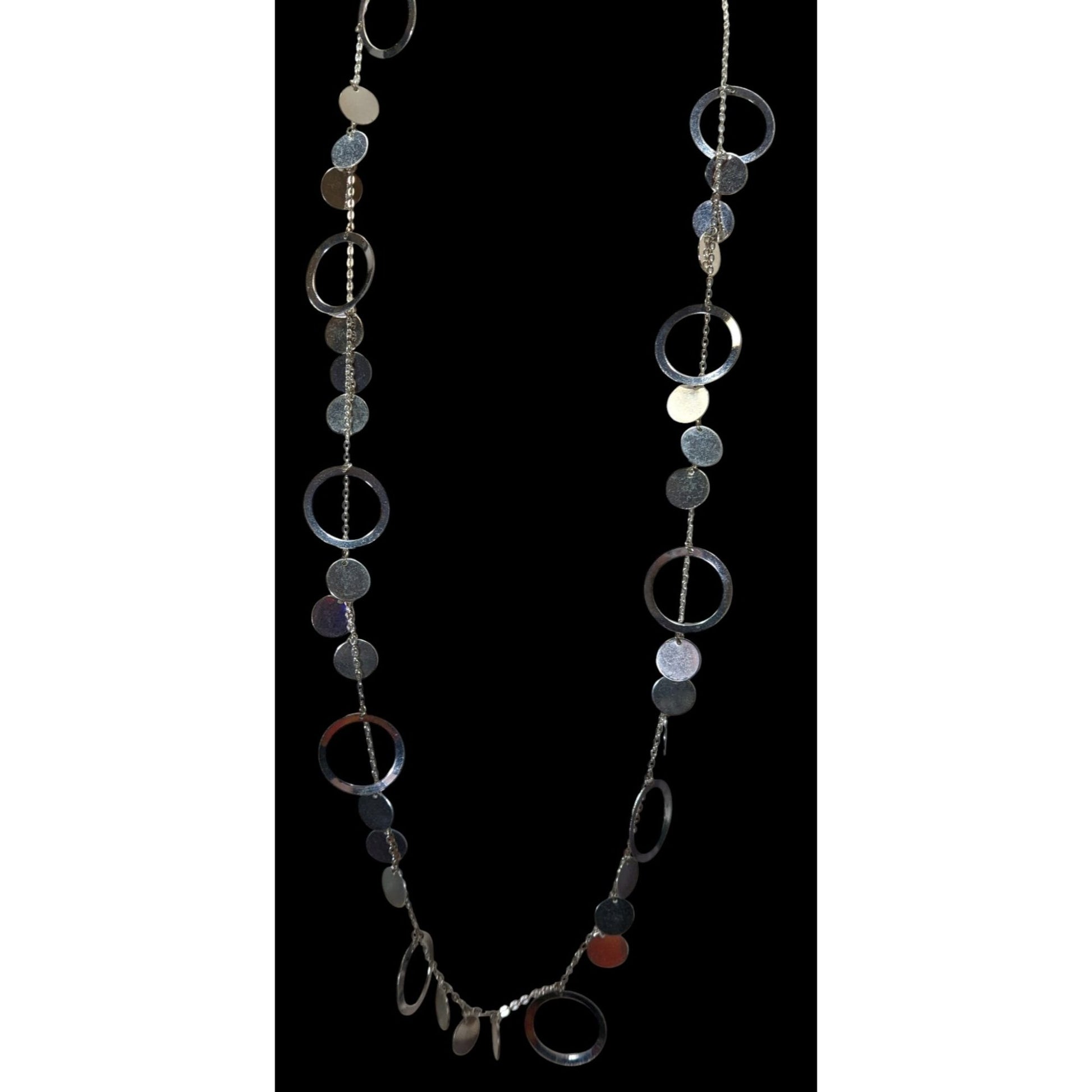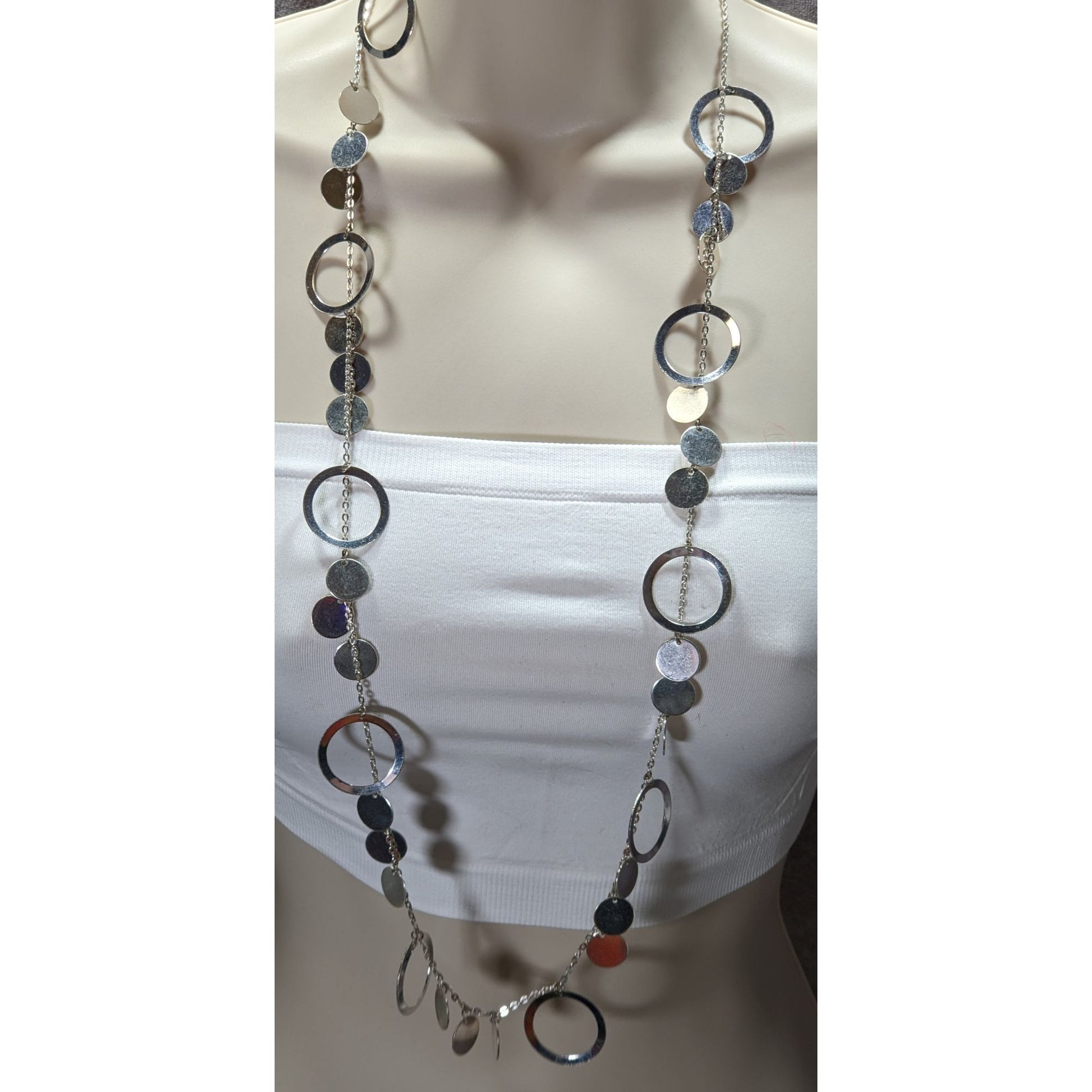 Vintage Glam Silver Tone Disc And Charm Necklace On Opera Length Chain