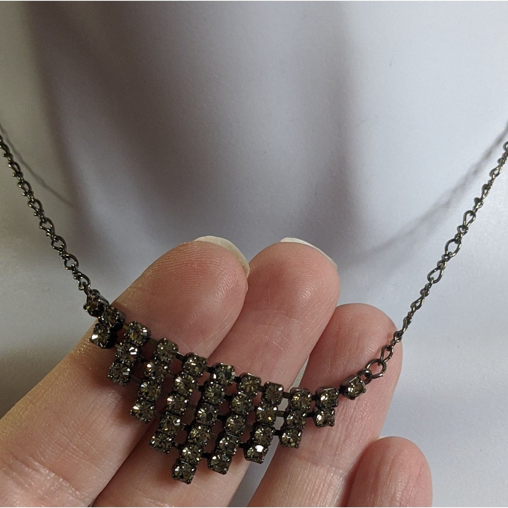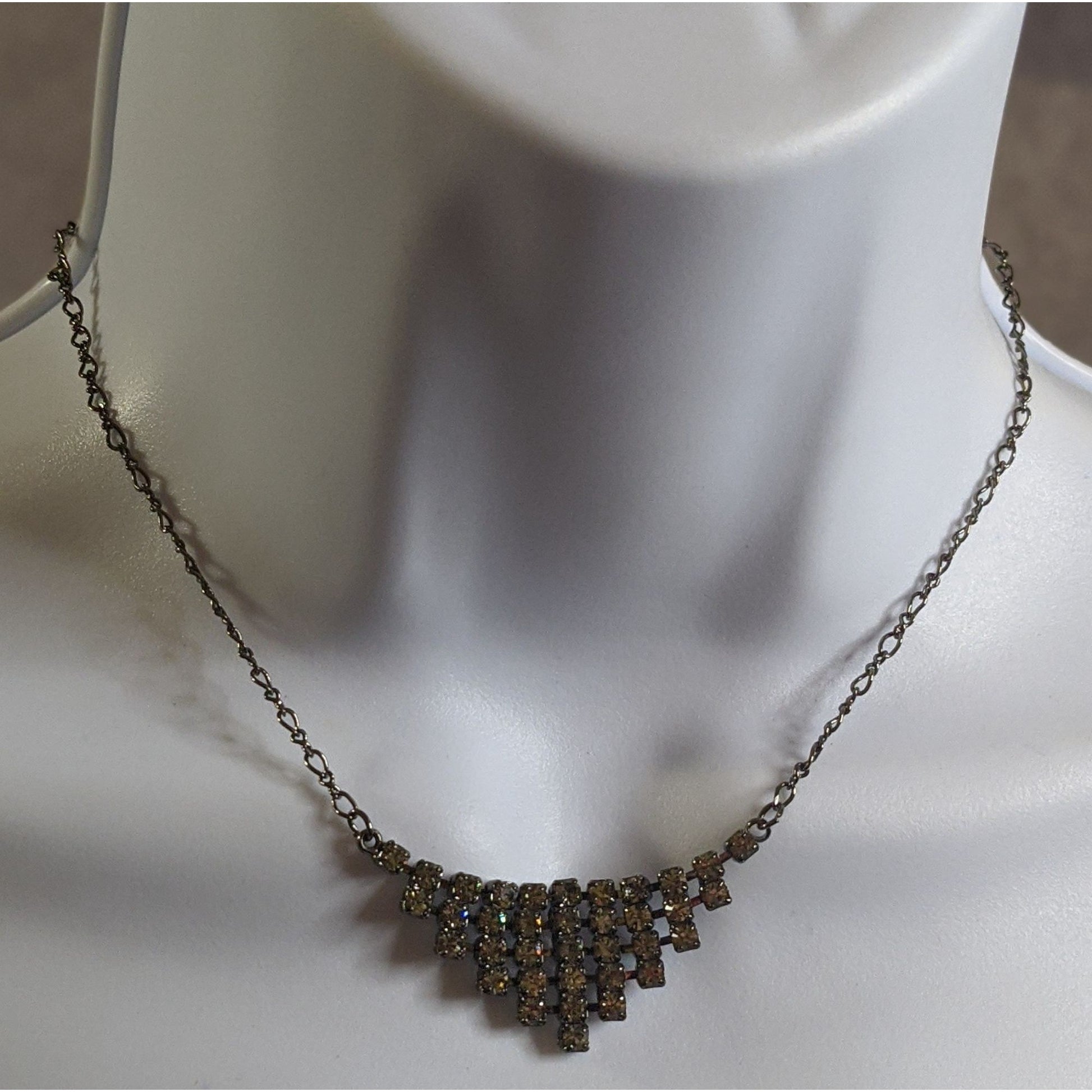 This vintage necklace tells a story of timeless elegance. Its tiered rhinestone design sparkles with sophistication, making it a graceful addition to any ensemble. The adjustable chain ensures a comfortable fit for every occasion.