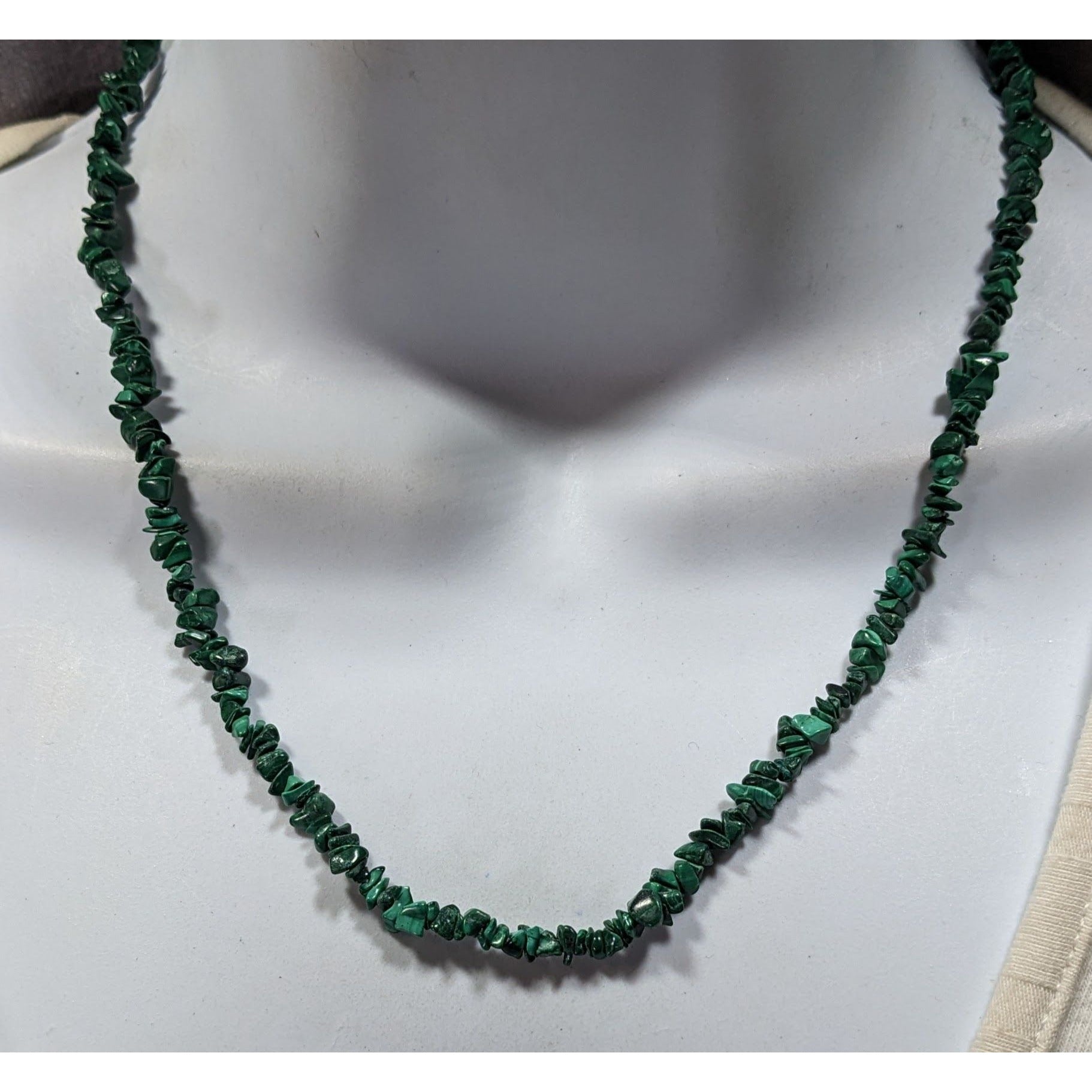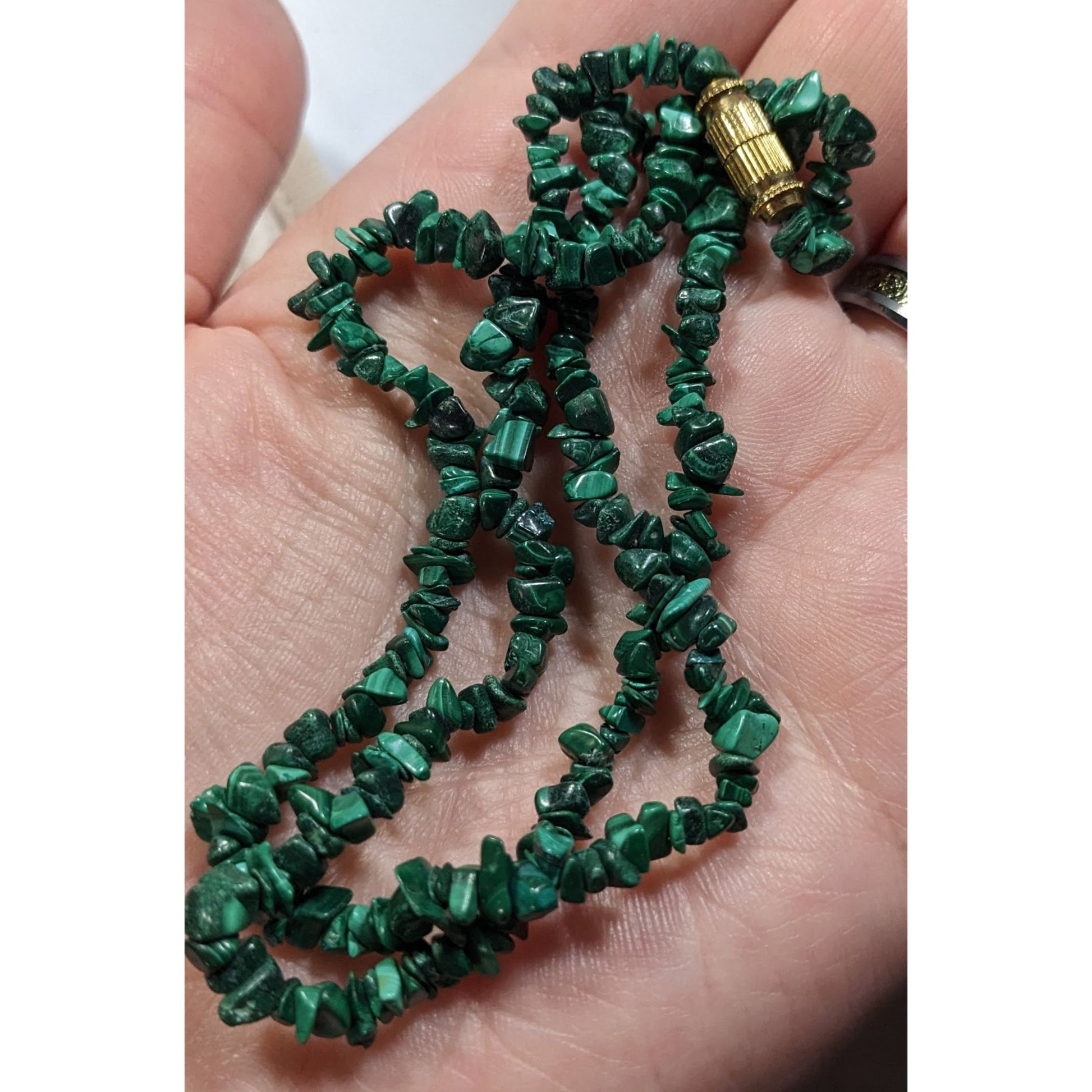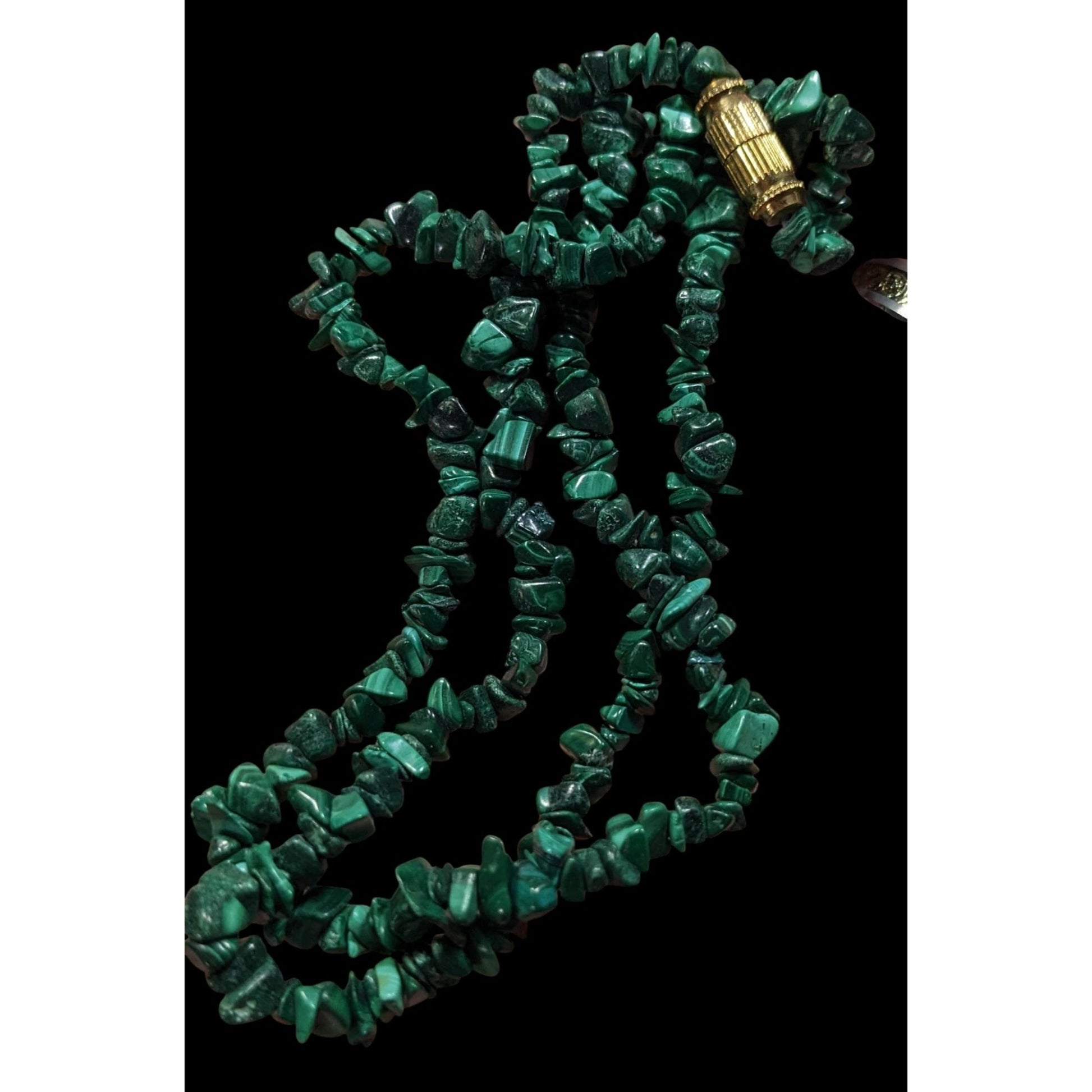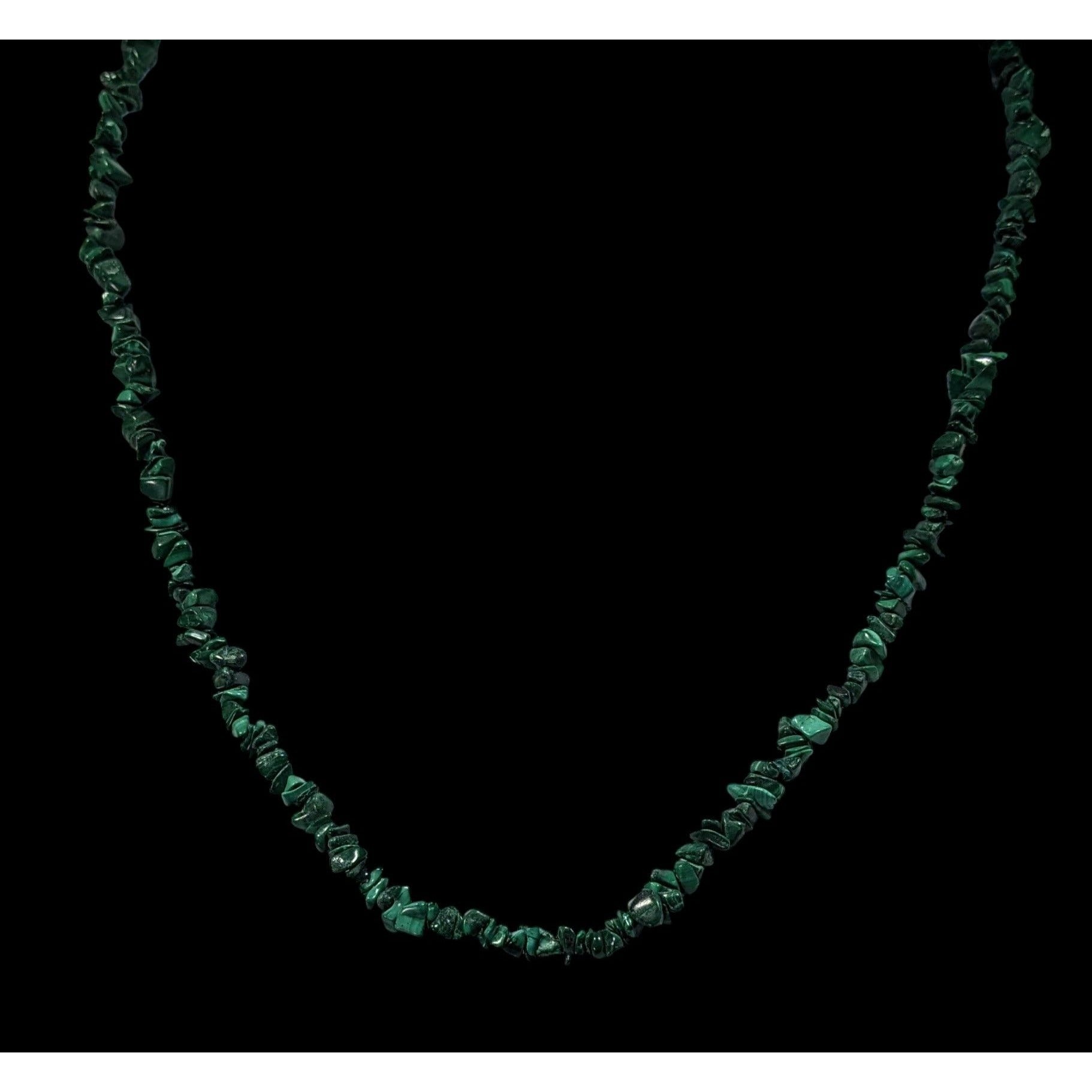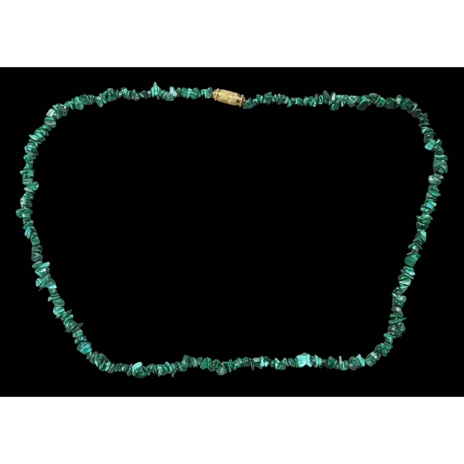 This stunning vintage necklace features handmade malachite chip beads, offering a unique, timeless accessory perfect for any occasion. Enhance your style with this exquisite piece crafted with care.