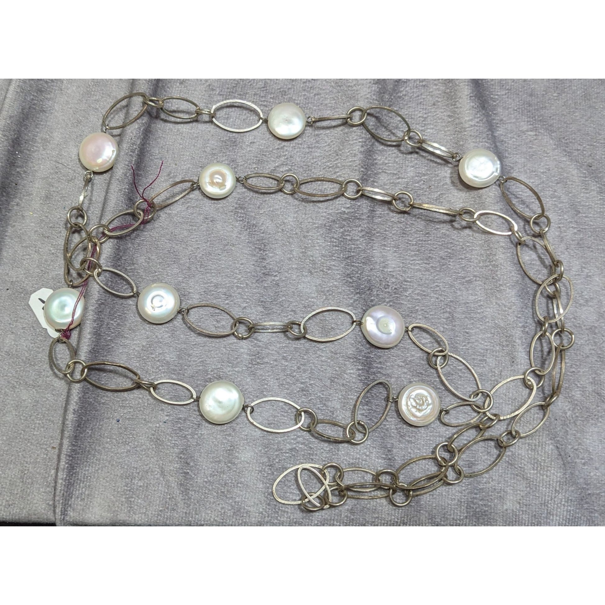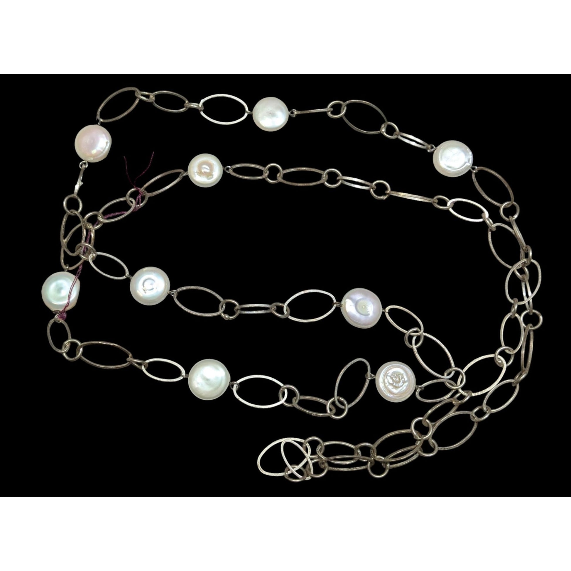 This necklace tells a tale of elegance with its silver oval chain links intertwined with luminous freshwater pearls, crafted for timeless sophistication.