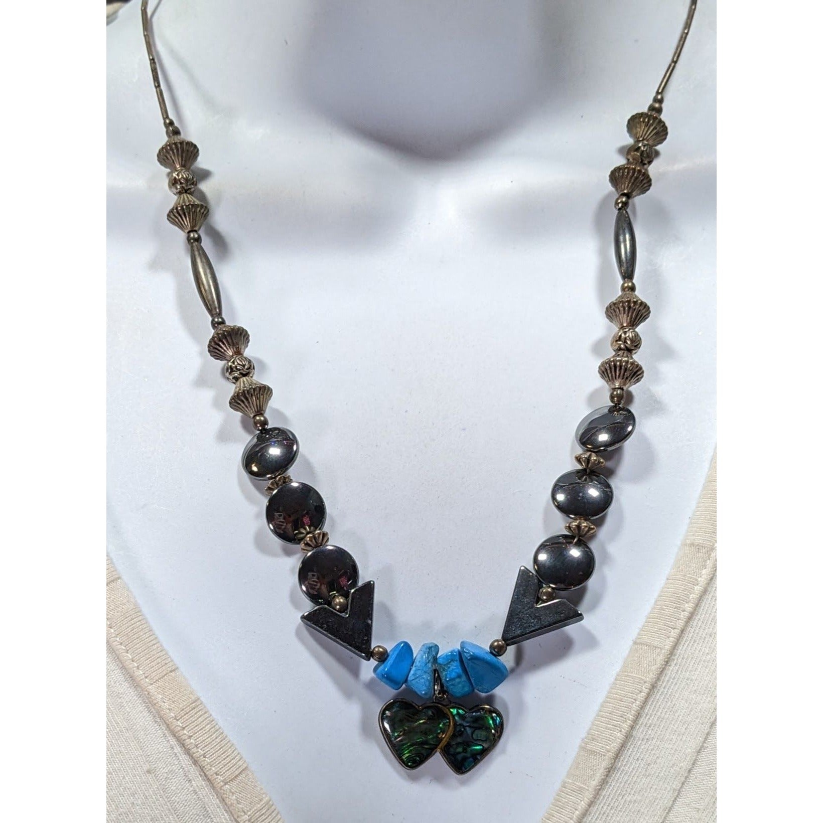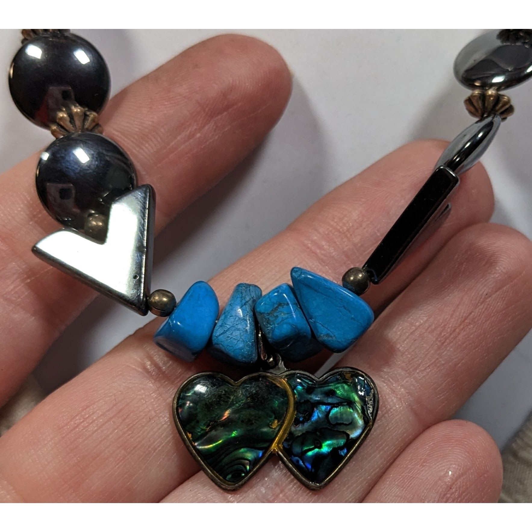 This exquisite vintage necklace features a romantic heart design with hematite, turquoise, liquid silver, and mother of pearl accents. Handmade with care, it's perfect for adding a touch of elegance to any outfit.