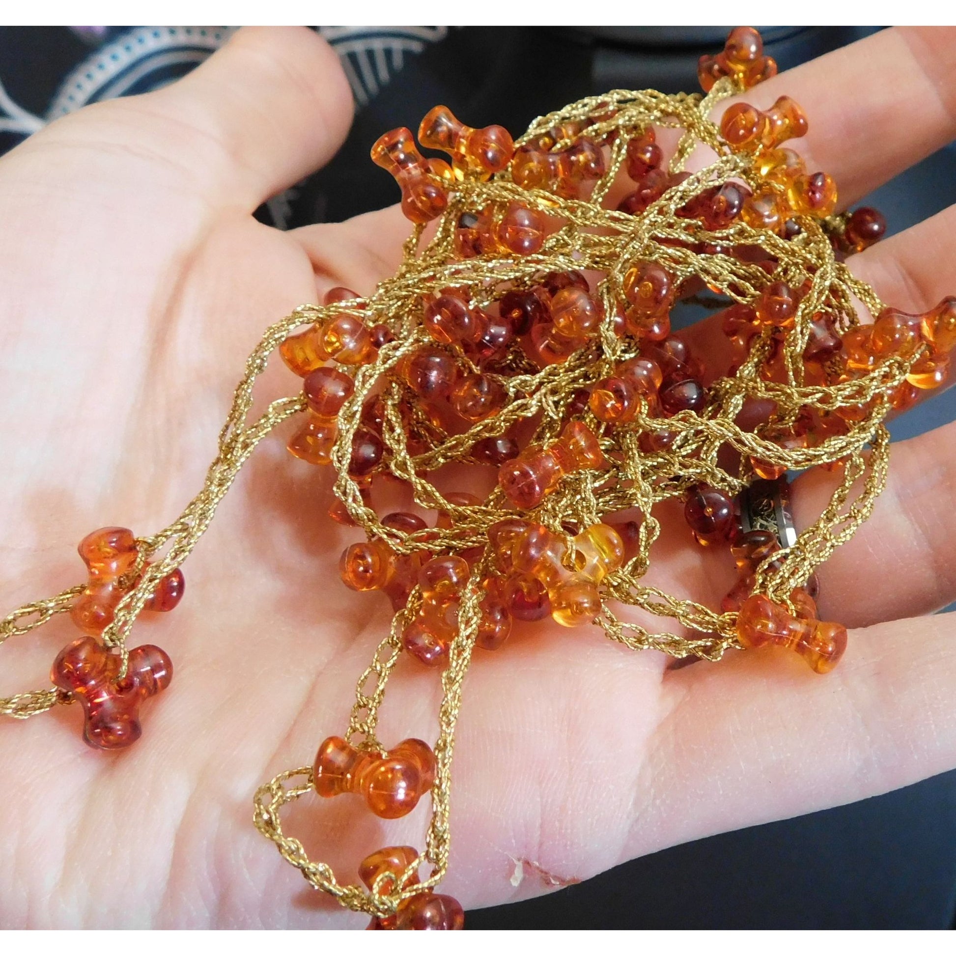 This vintage handmade necklace features woven gold tone with tri-bead accents, offering a unique and elegant touch to any outfit. Perfect for adding a classic yet distinctive flair to your jewelry collection.