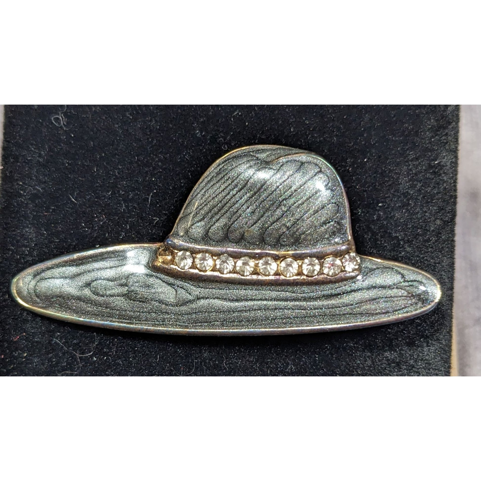 Vintage Hat Brooch With Grey Shimmer Enamel And Rhinestone Accents