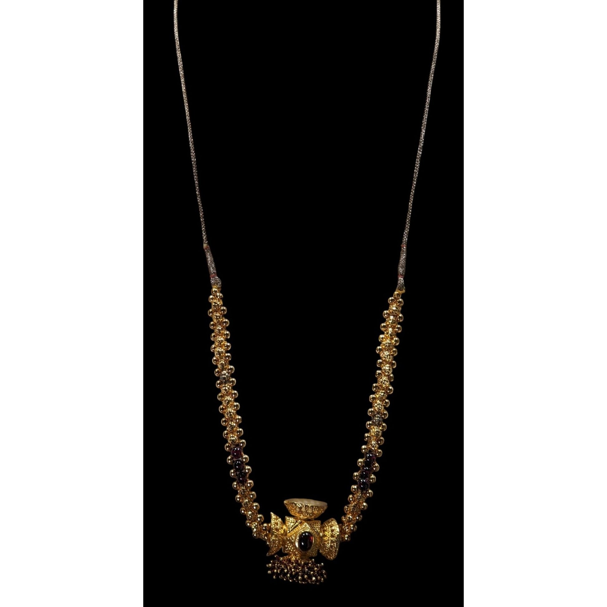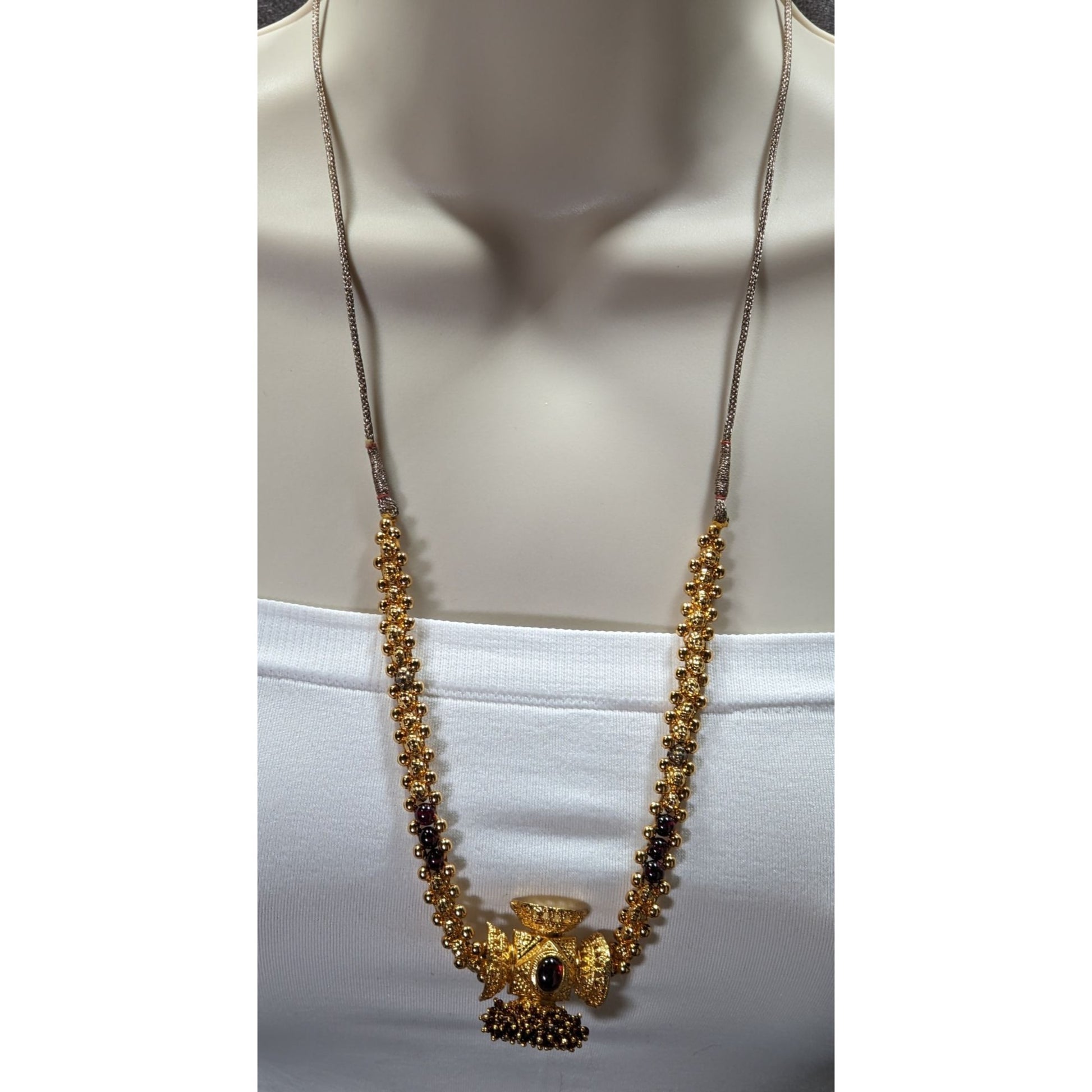 This necklace tells a tale of artistic brilliance, blending gold-tone beads with garnet accents and a glass-adorned pendant. The 26" adjustable length and intricate craftsmanship make it a stunning accessory for cultural and formal occasions.